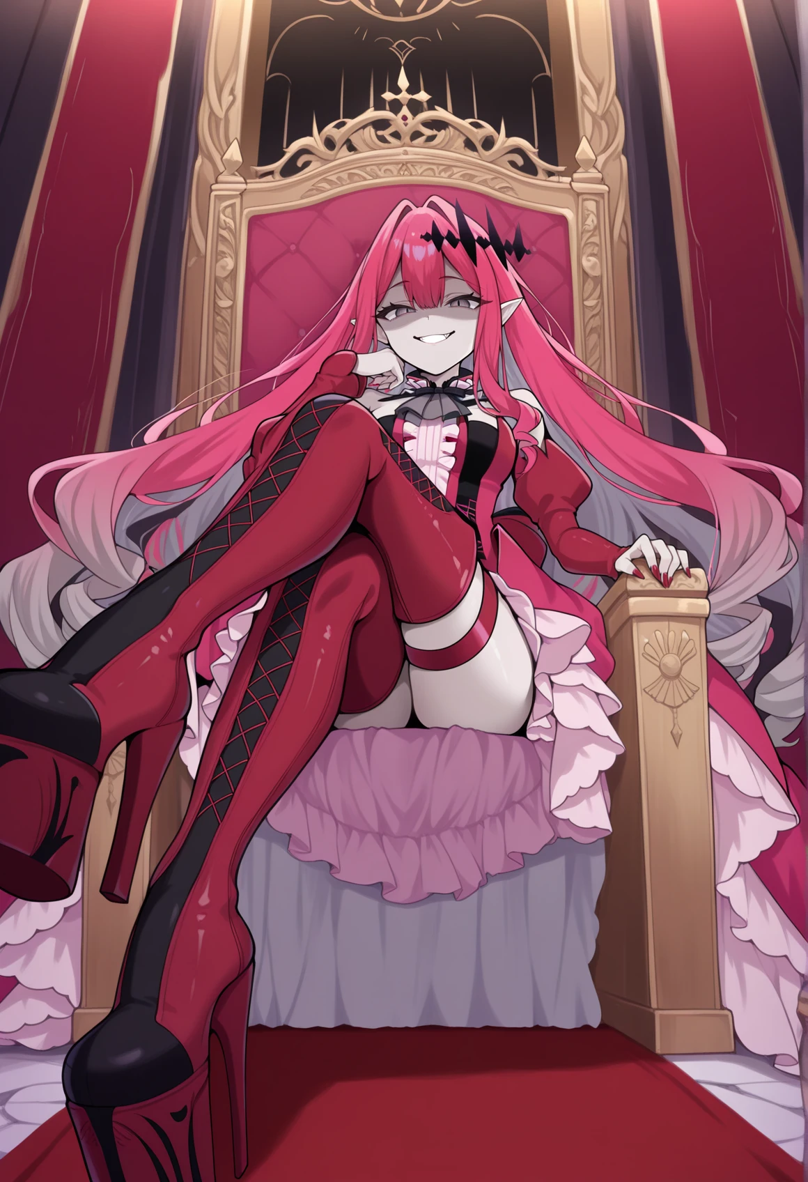 Vanilla1: pointy ears, pink hair, very long hair, grey eyes, hair ornament, ascot, ribbon, Pink dress, long sleeves, detached sleeves, puffy sleeves, Thigh Strap, Thigh Boots, Zettai Ryouiki, frills