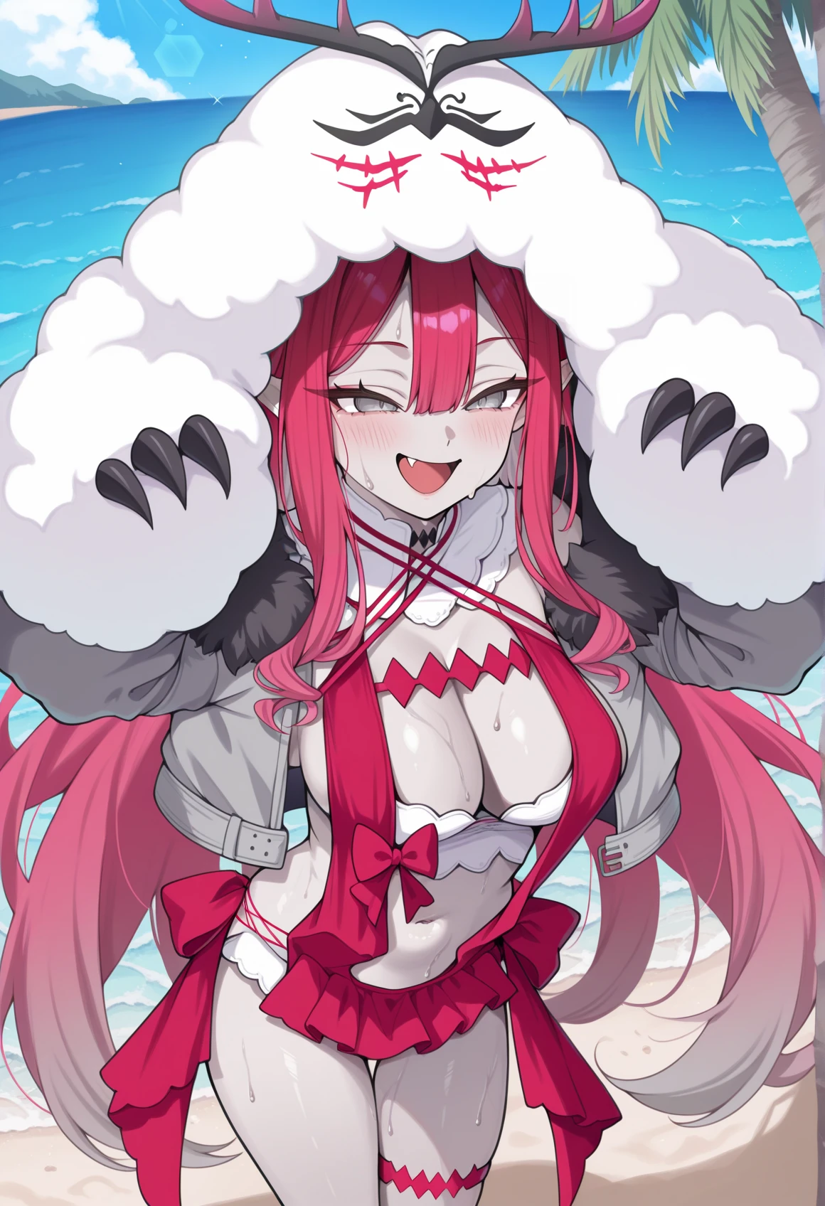 Pretender: pointy ears, pink hair, very long hair, grey eyes, character hood, fur trim, fur-trimmed jacket, claws, horns, short dress, cleavage, navel, Thigh Strap, Platform Footwear