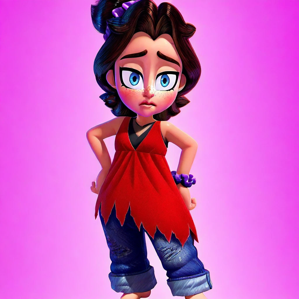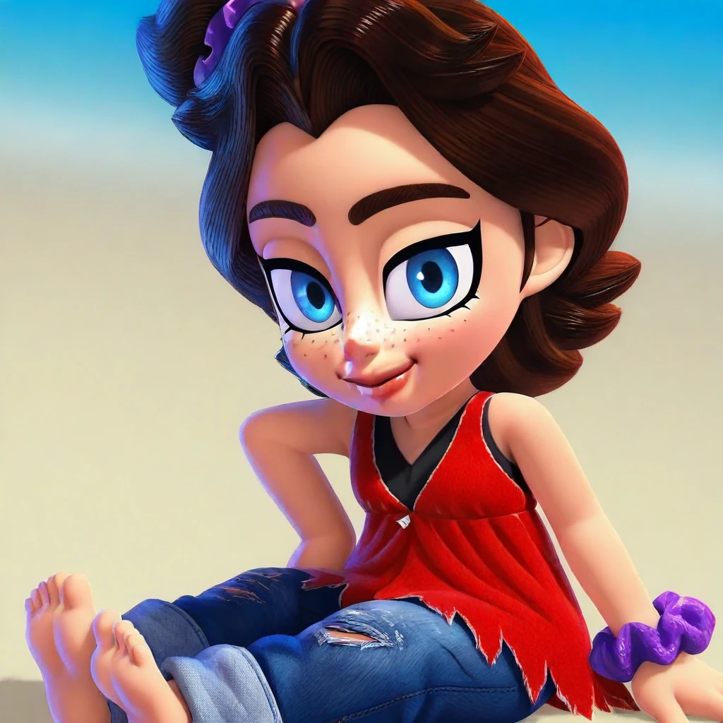 pauline \(dkbananza\), dark brown hair, medium hair, hair tied up, hair scrunchie, freckles, blue eyes, red dress, wrist scrunchie, black undershirt, ripped denim jeans, bare feet, 1girl, solo