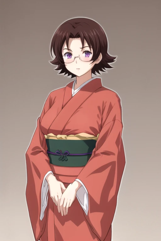 GoeiSonsaku, 1girl, solo, short hair, large breasts, brown hair, purple eyes, glasses, red kimono, sash, obi, tabi,