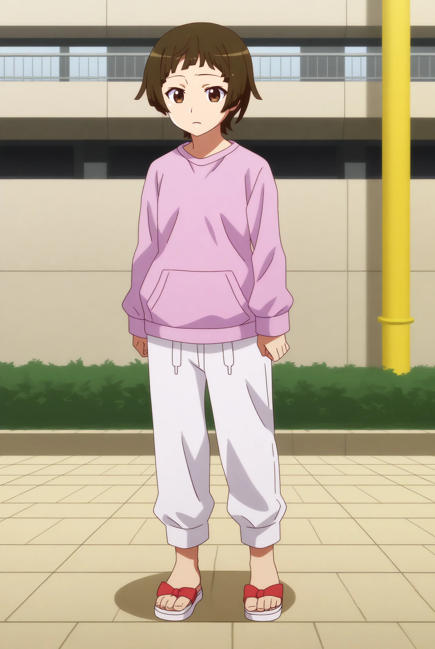 long sleeves, pink shirt, sandals, white pants