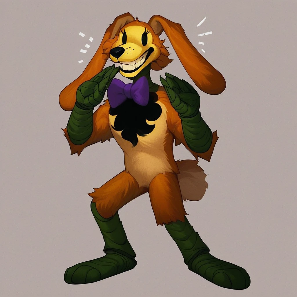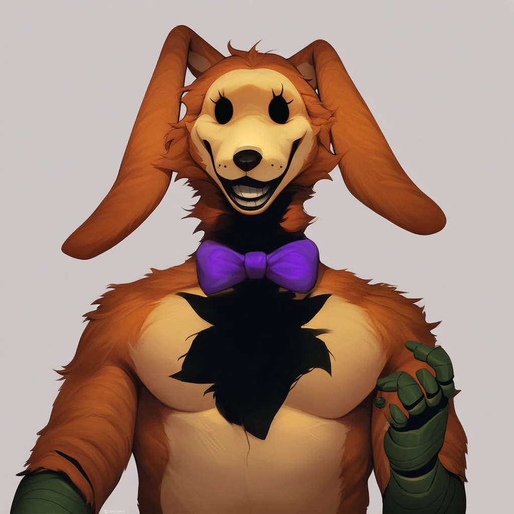 animatronic, green limbs, rabbit, anthro, purple bow tie, bow tie, orange body, 1boy, eye sockets, floppy ears