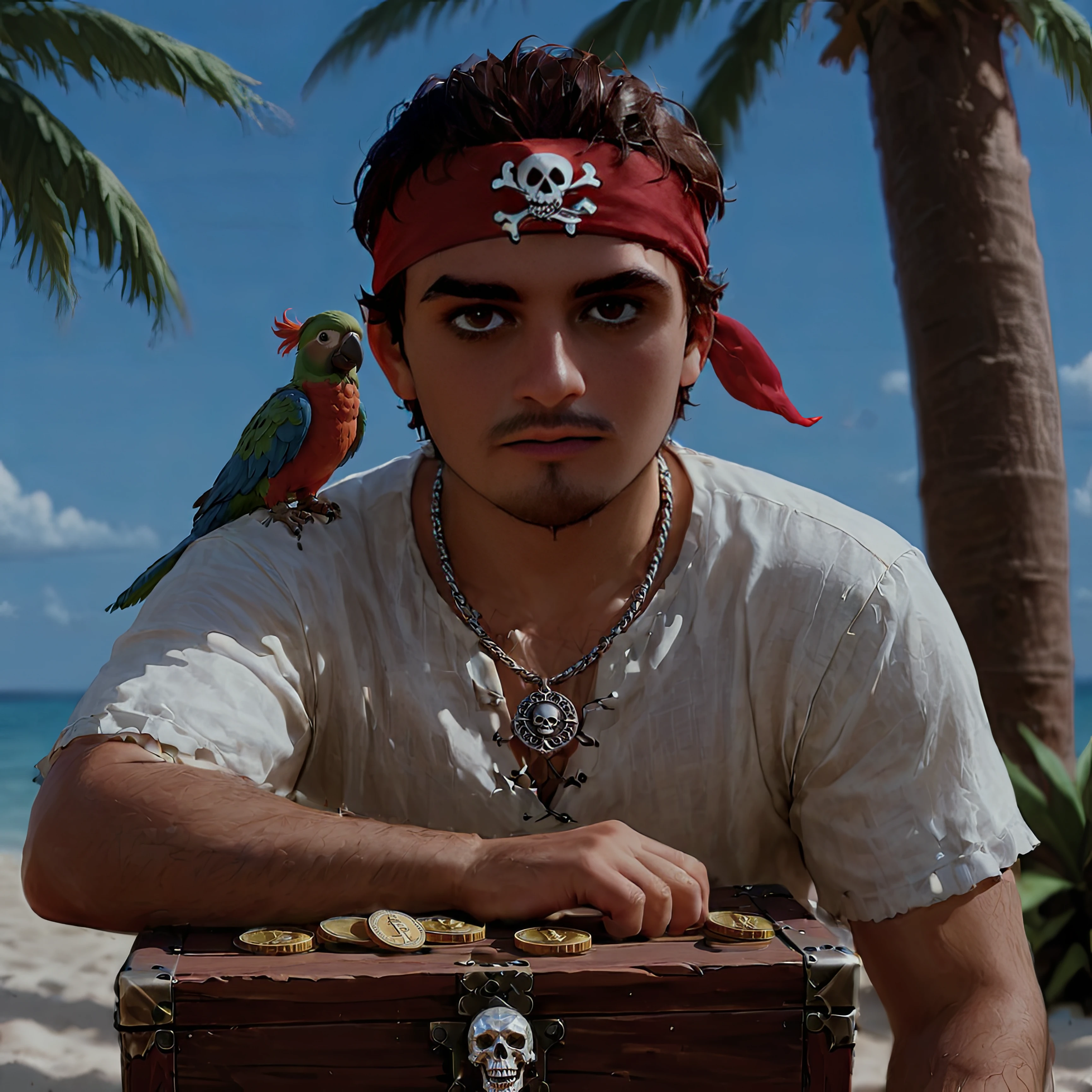 gay, yaoi, bara, tropical, beach, jungle, palm_tree, colonial, ocean, sailing, linen_shirt, vest, sash, tattoo, scar_on_face, handlebar_moustache, jolly_roger, parrot, flintlock, saber, bondage,