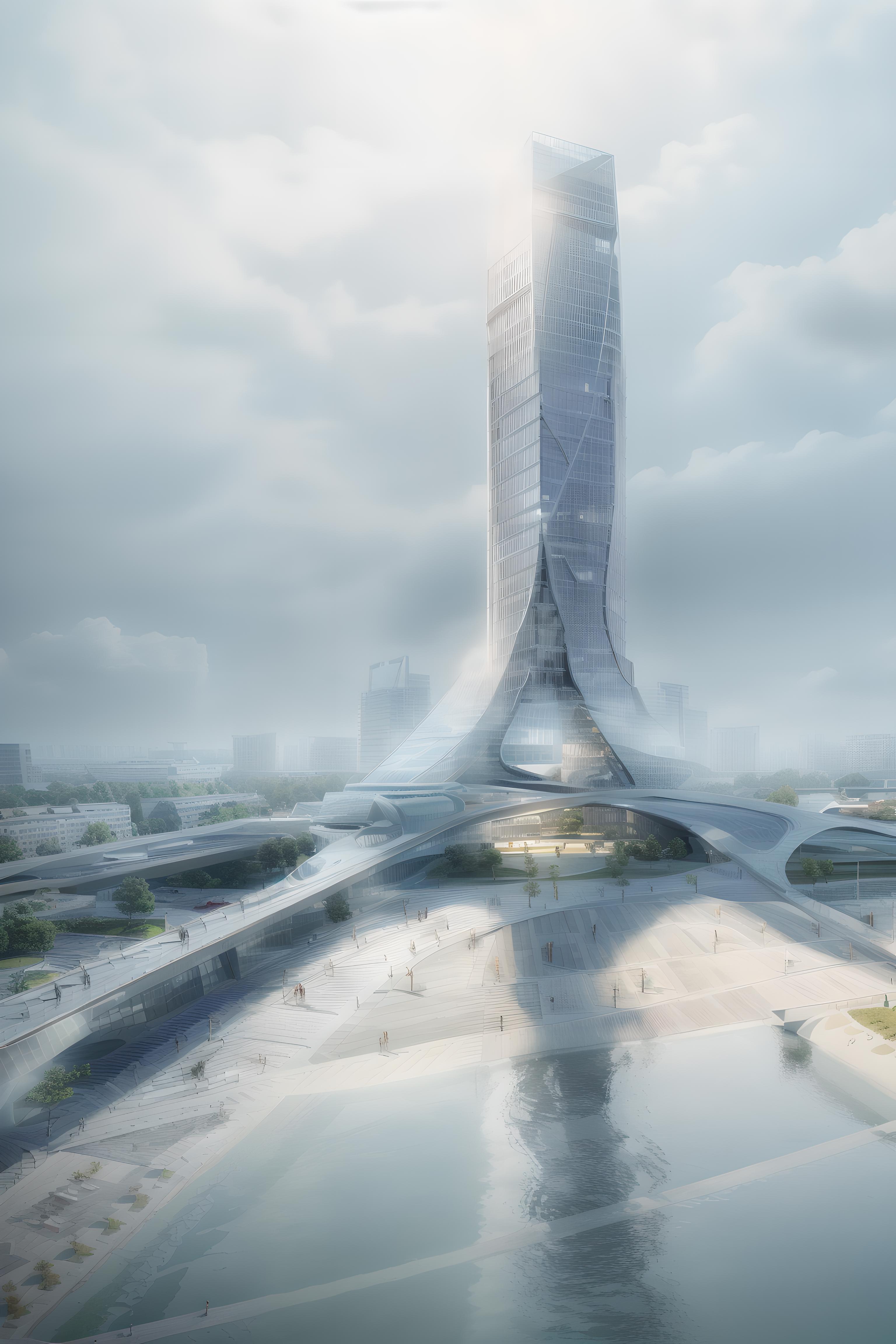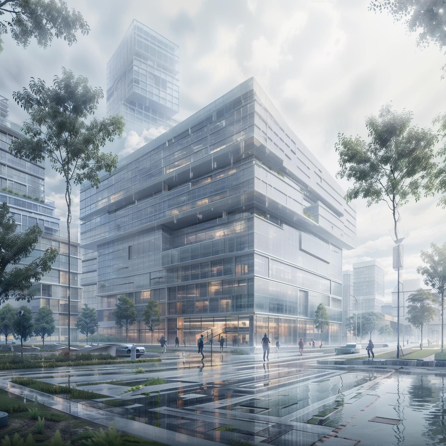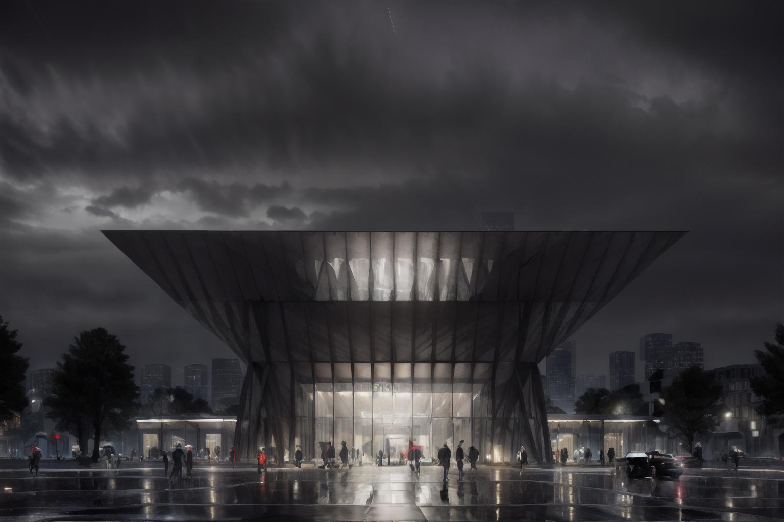This is a large lora, training in architecture, city, landscape, interior, atrium, facade details, light, perspective and part of the architectural style. The model can produce different building materials (such as concrete, stainless steel, steel structure, etc.), and the image can be adjusted using different angles (such as aerial view, first-person view, tight view, etc.).