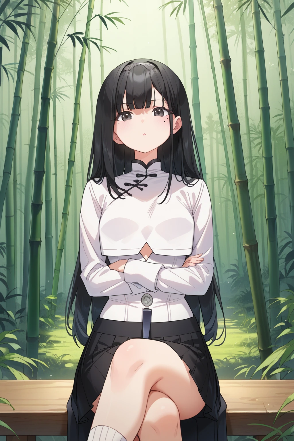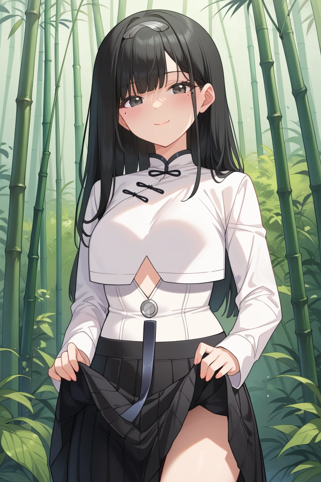 Luqi, black eyes, mole under eye, black hair, very long hair, low-tied long hair, hairband, collar, crop top, white crop top, long sleeves, corset, white corset, sash, skirt, black skirt, pleated skirt, long skirt