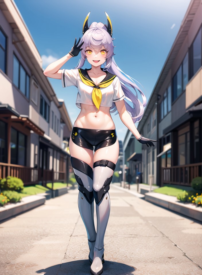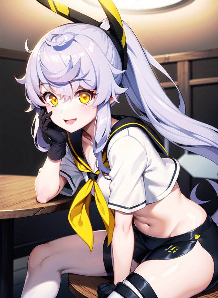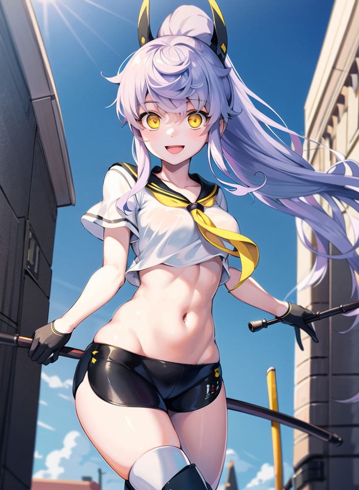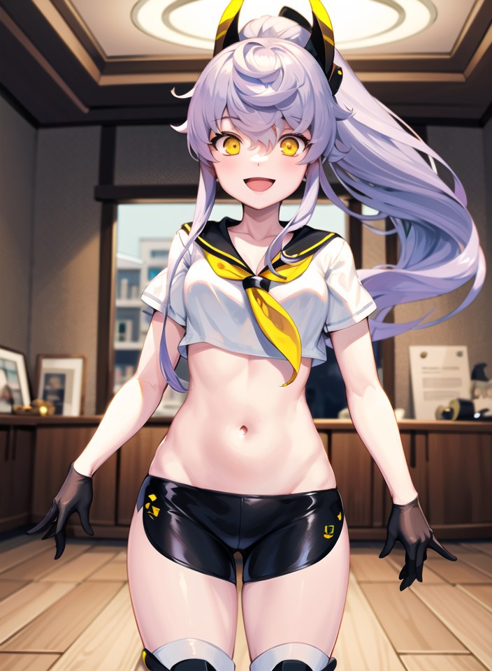 PurifierDefault, black_gloves, black_shorts, crop_top, headgear,   midriff,  ponytail, high_ponytail, sailor_collar, sailor_shirt,  short_sleeves,yellow_neckerchief,  micro_shorts, black_sailor_collar,thigh_boots