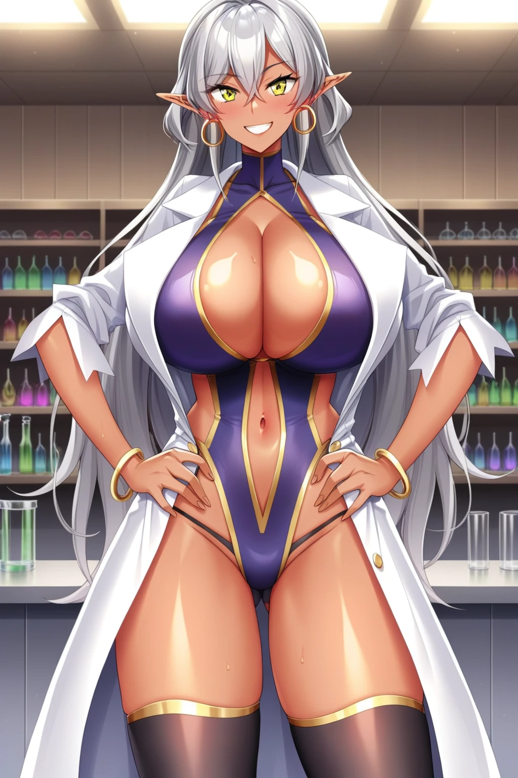 yellow eyes, gray hair, pointy ears,long hair, hoop earrings,dark elf, huge breasts