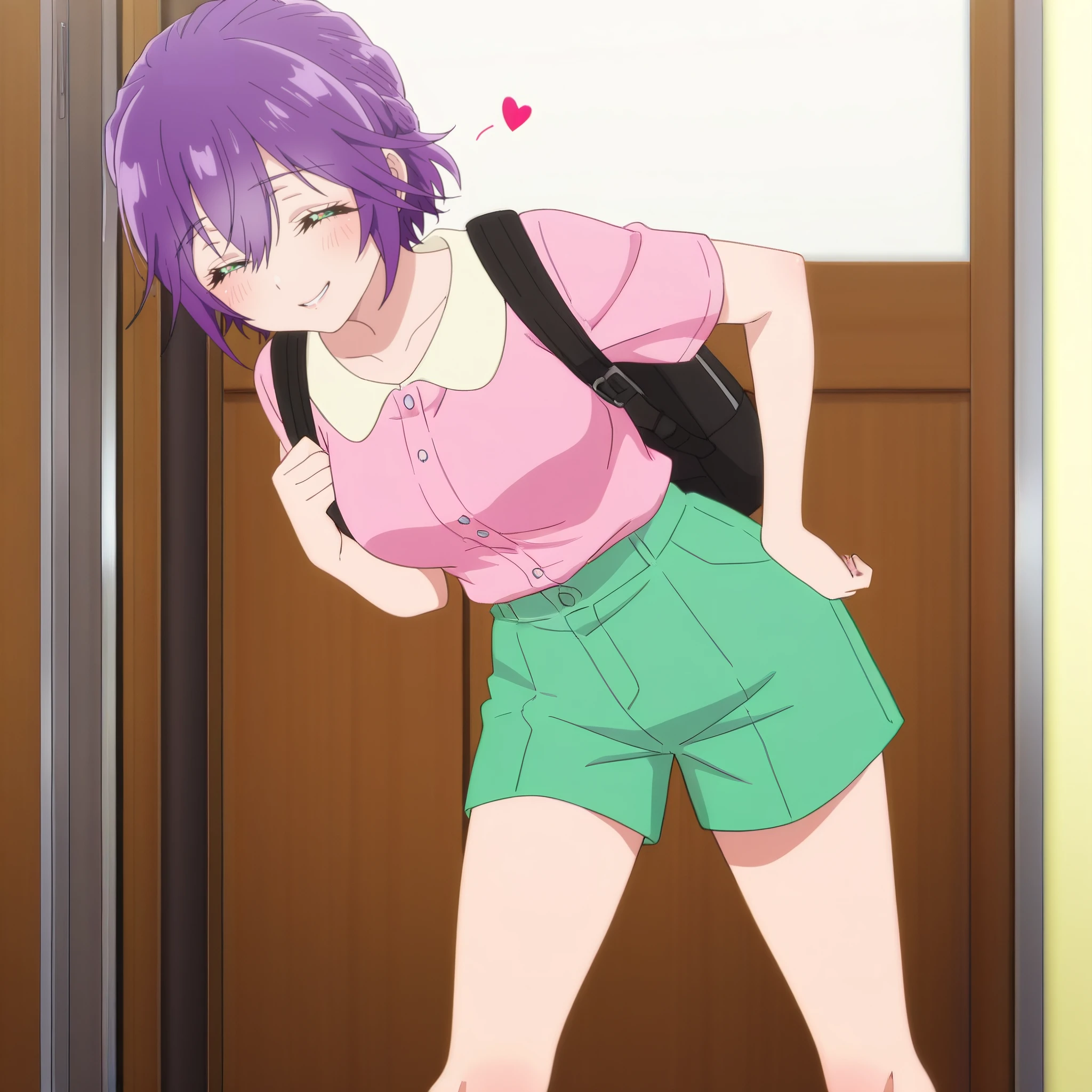 HiroPinkShirt, pink shirt, short sleeves, bag, collarbone, backpack, collared shirt, buttons, shorts, green shorts,