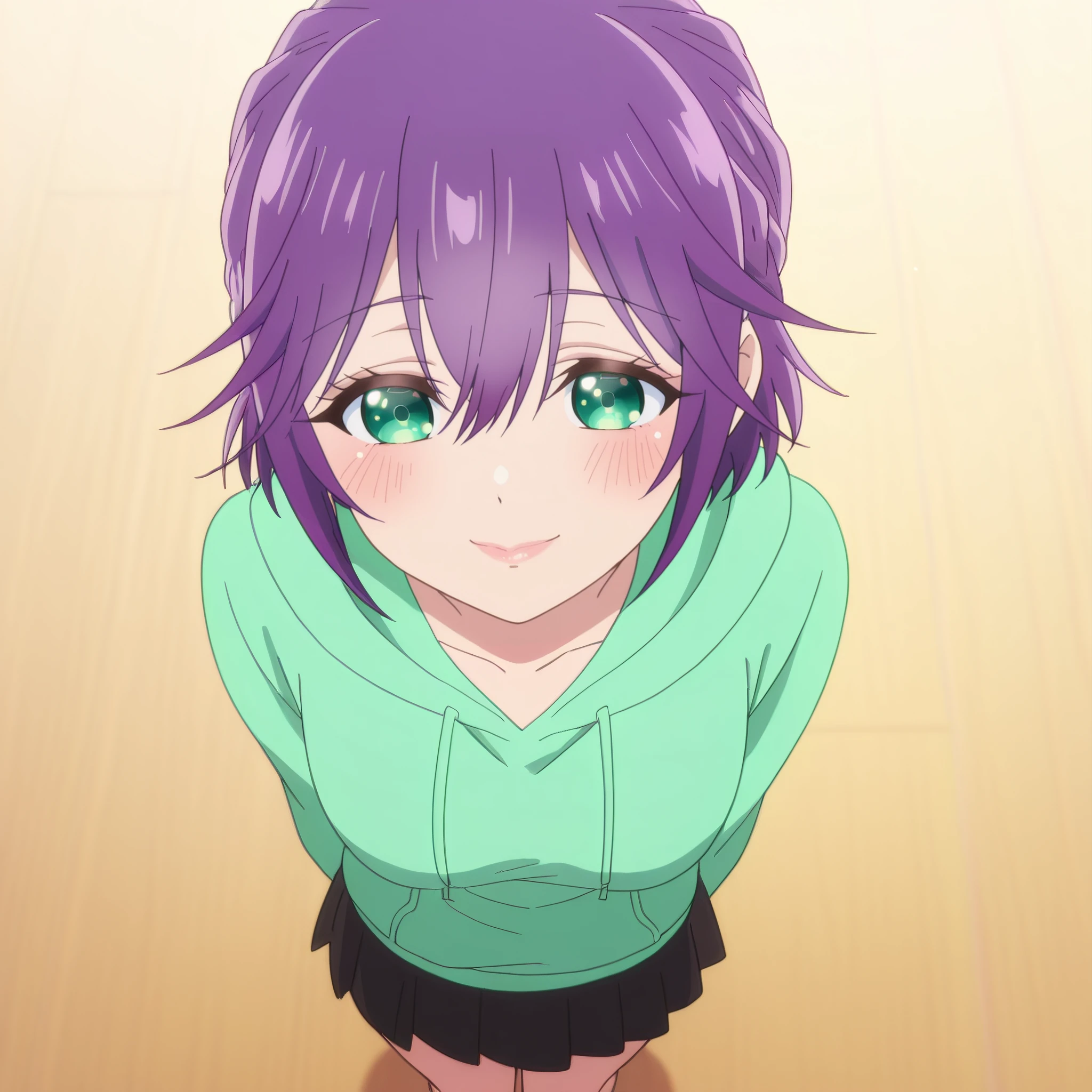 HiroHoodie, hood, hoodie, hood down, long sleeves, hooded sweater, green hoodie, collarbone, skirt, black skirt,