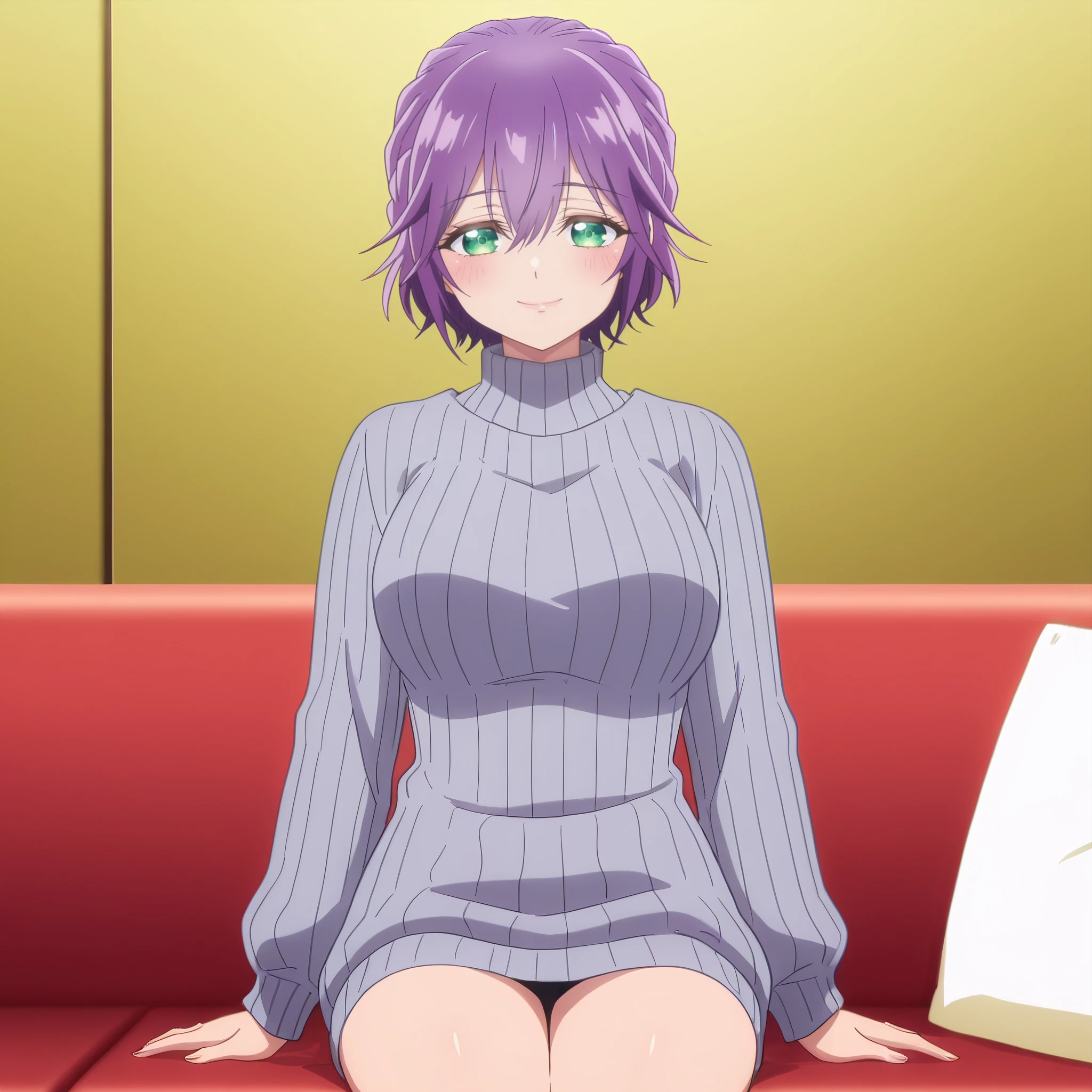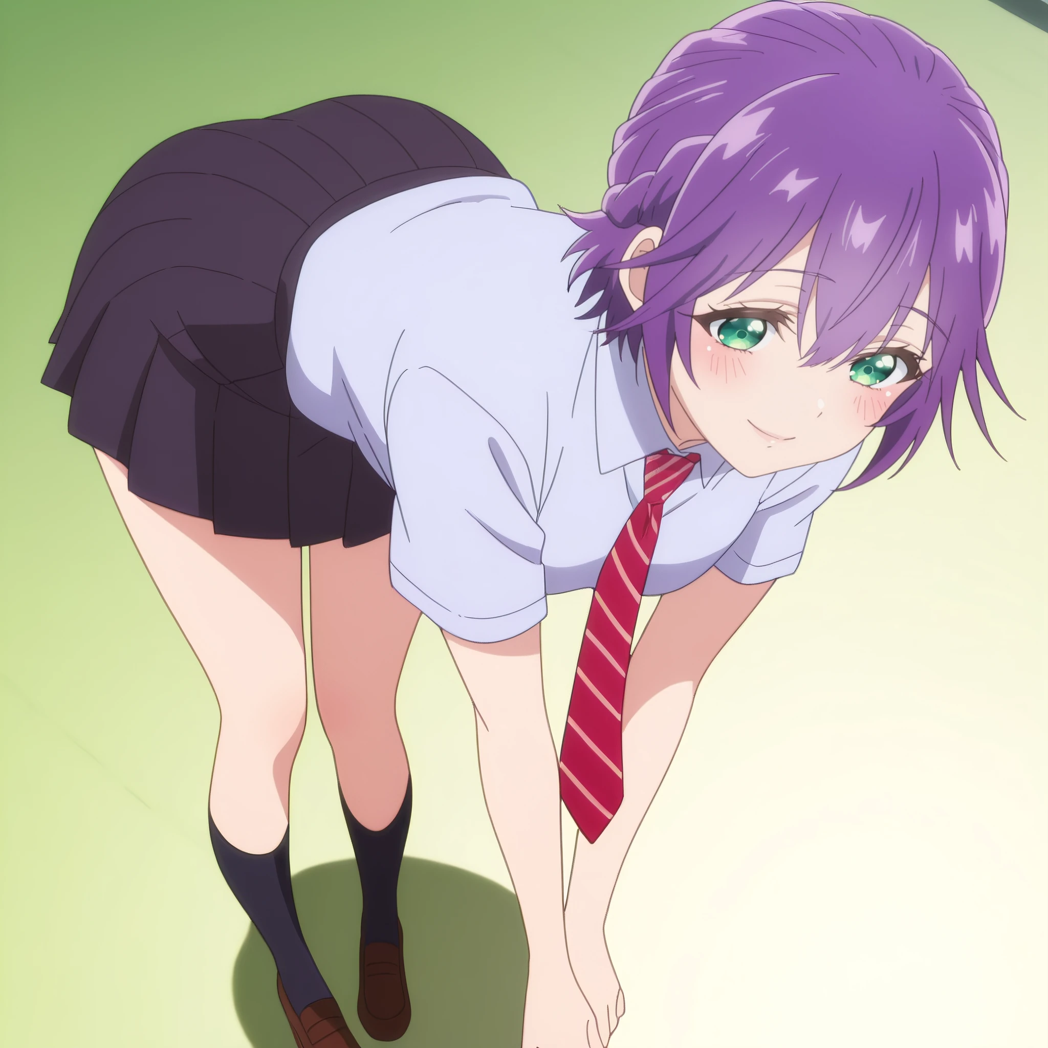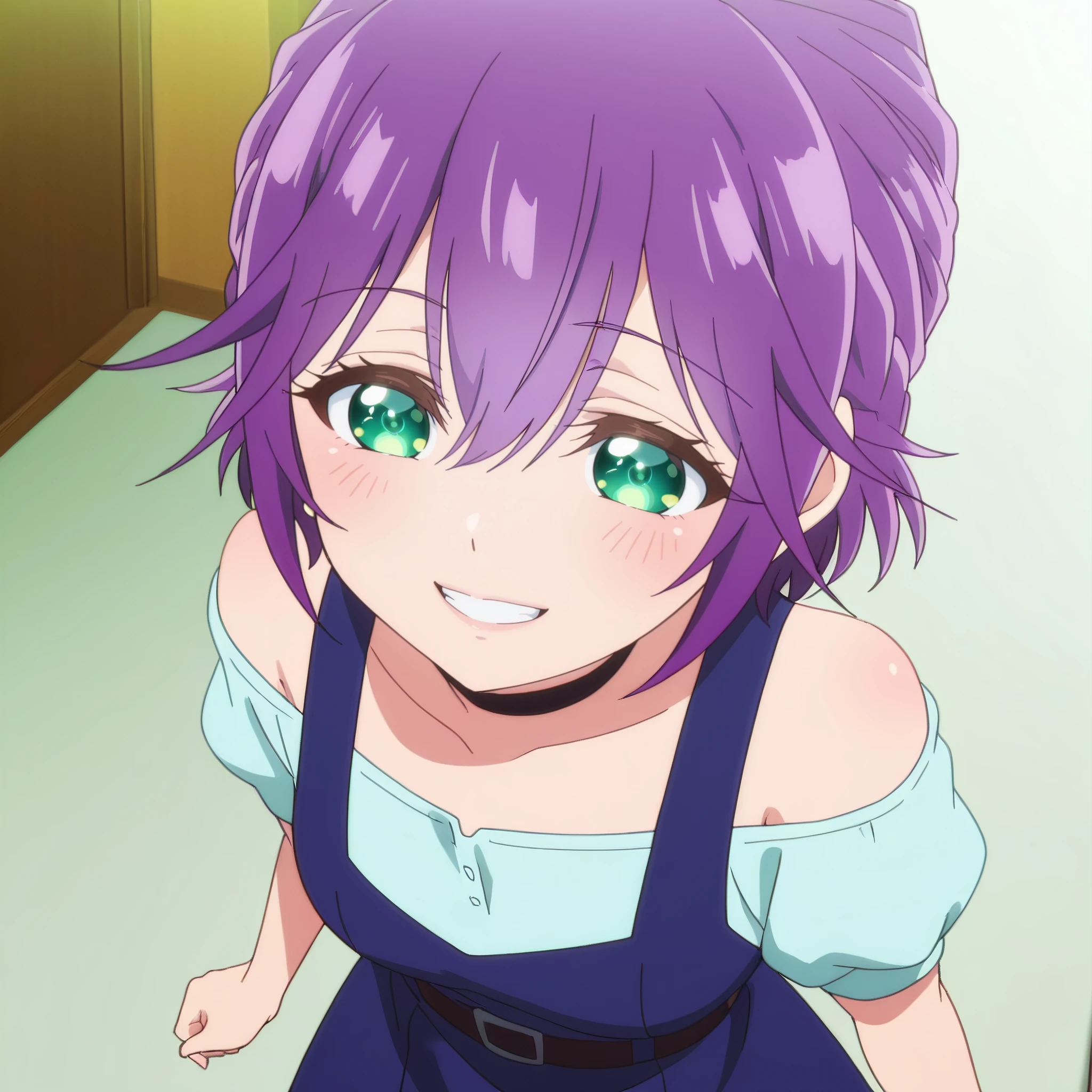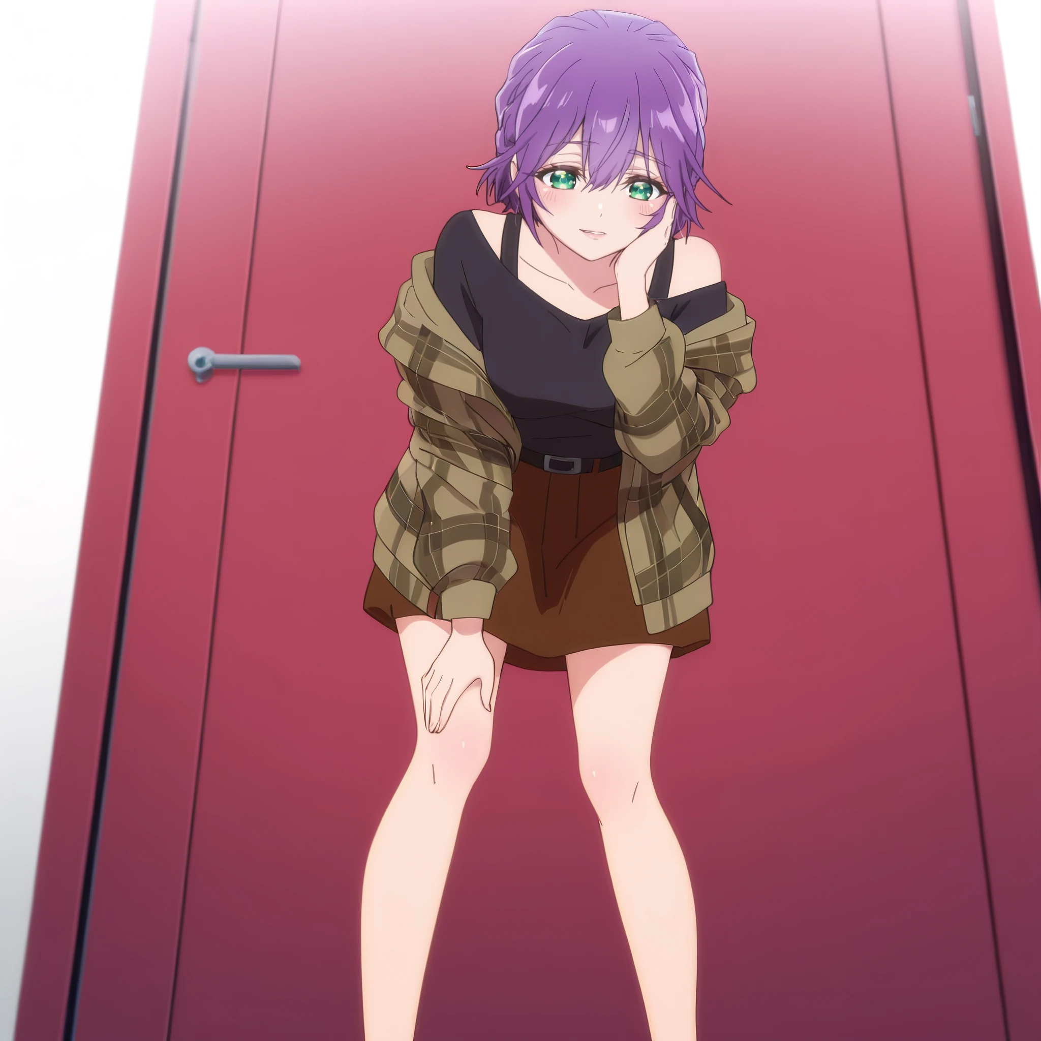 ACOHiro, purple hair, short hair, eyebrows visible through hair, green eyes, bangs, hair between eyes, braid, hair ornament, eyelashes,