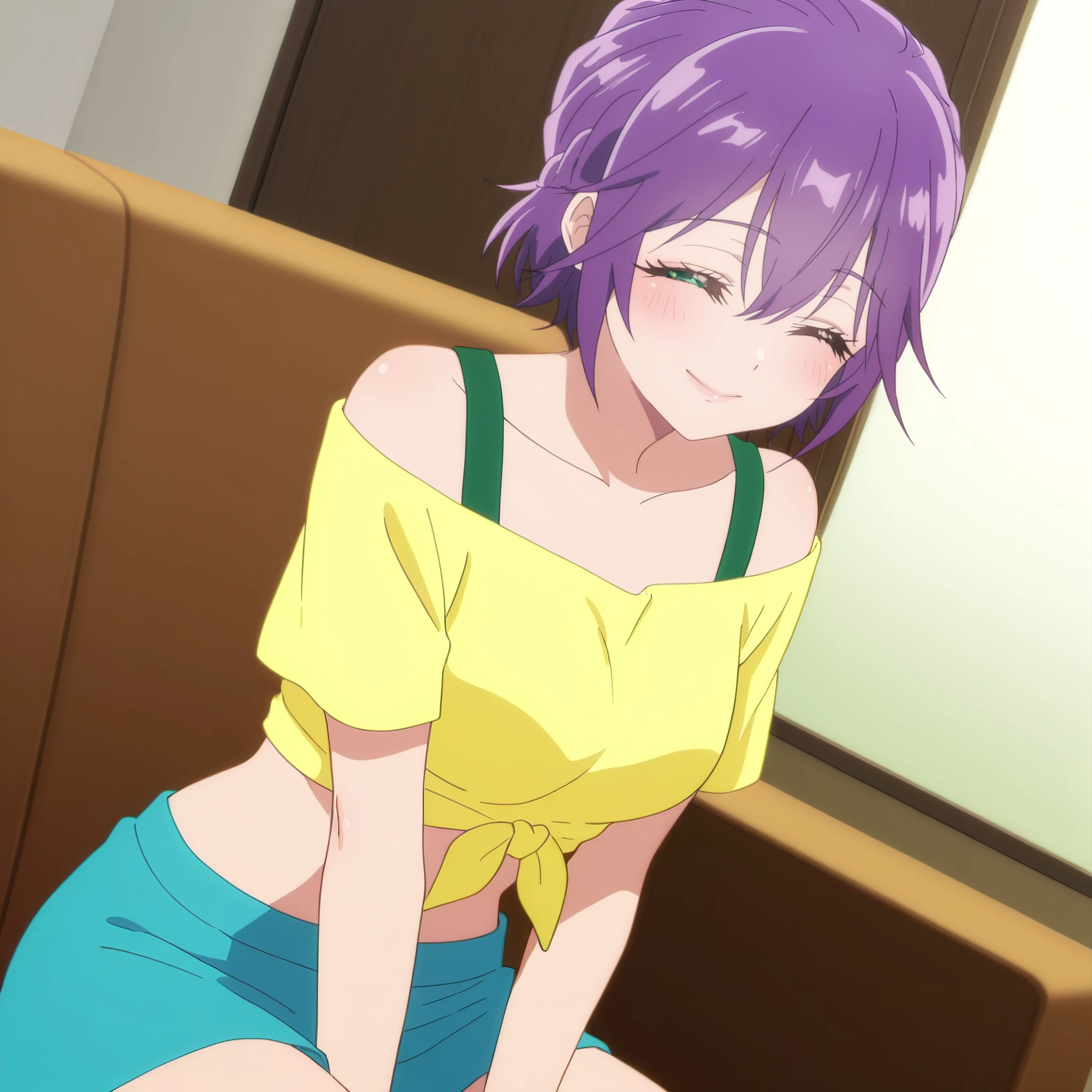 HiroCropTop, yellow shirt, short sleeves, bra strap, off shoulder, collarbone, midriff, skirt, tied shirt, bare shoulders, crop top,