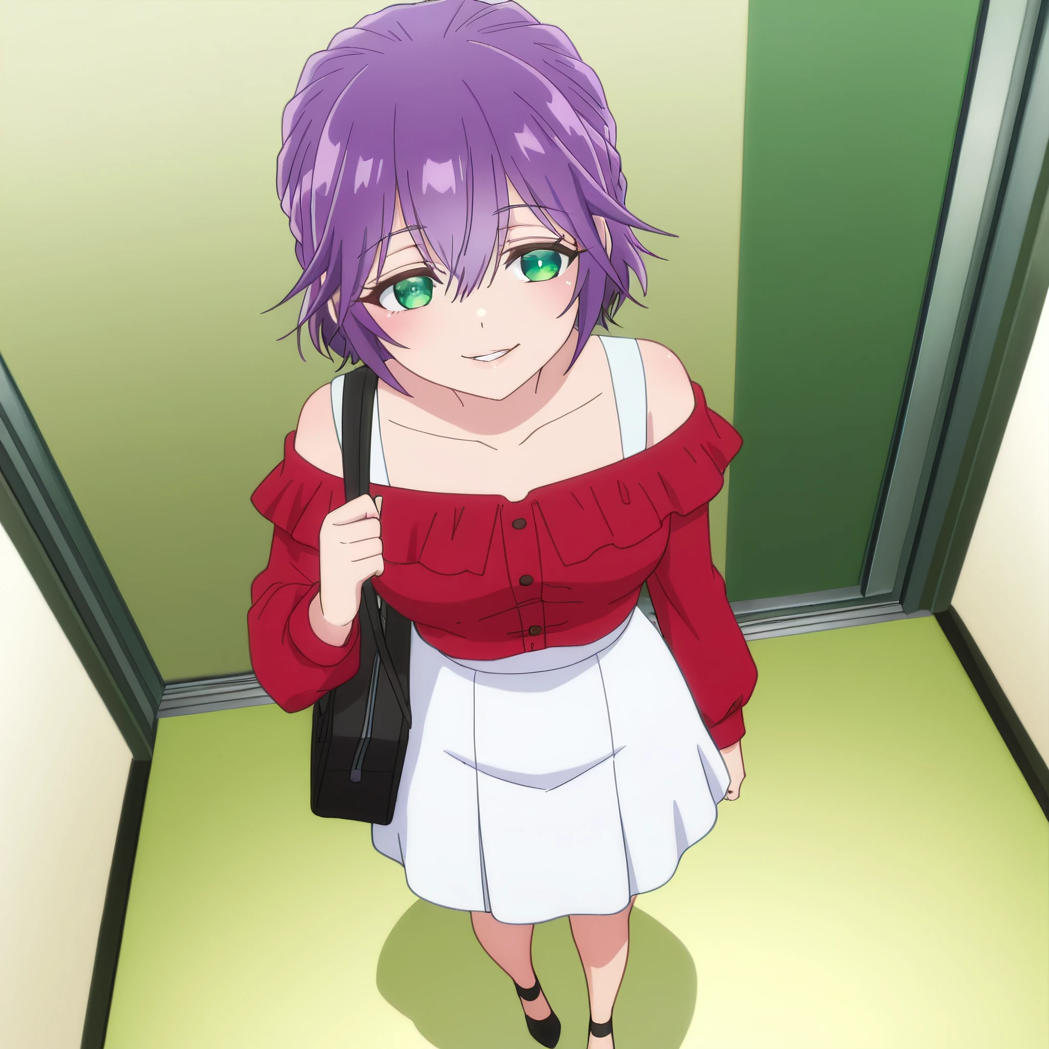 HiroRedShirt, red shirt, collarbone, shirt, bag, long sleeves, shoulder bag, off shoulder, frills, holding strap, buttons, skirt, white skirt, long skirt,