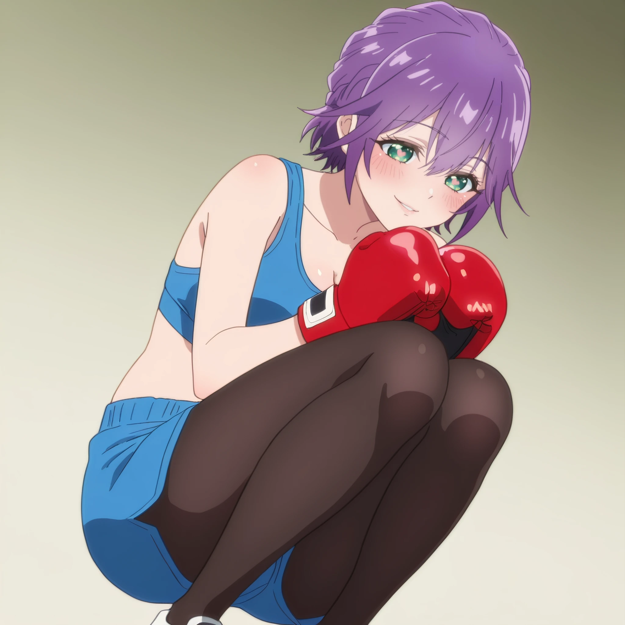 HiroBoxing, bare shoulders, boxing gloves, midriff, sports bra, collarbone, sleeveless, gloves, navel, shorts, cleavage, tank top, blue tanktop, black pantyhose, black legwear, blue shorts,