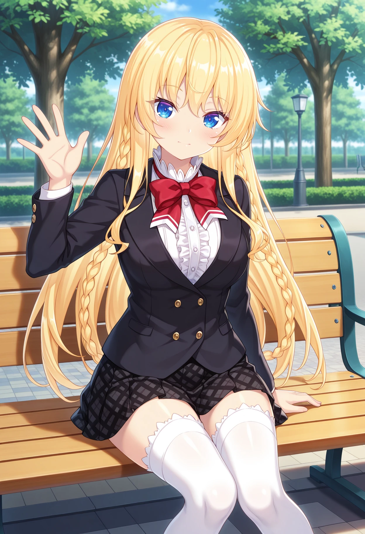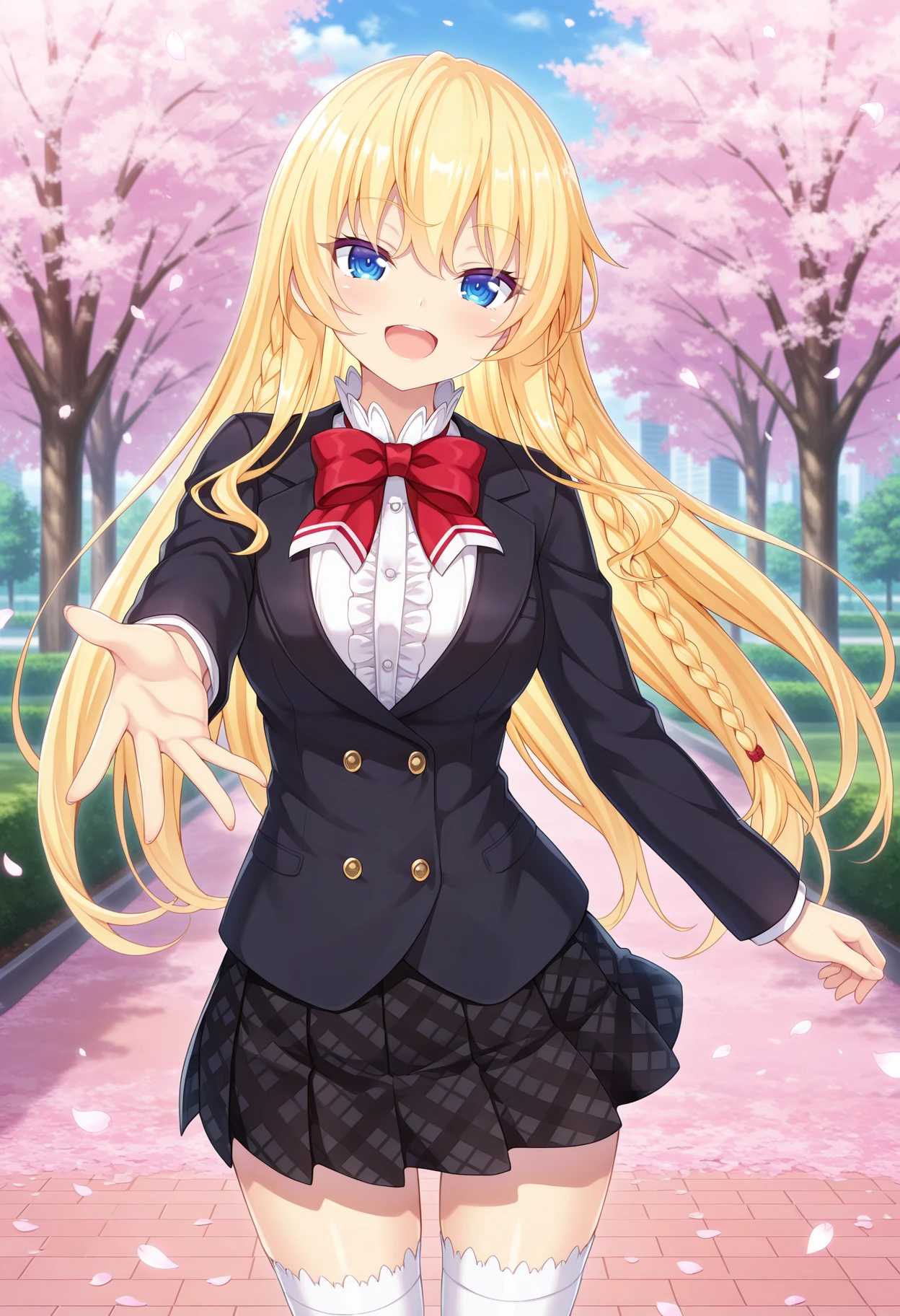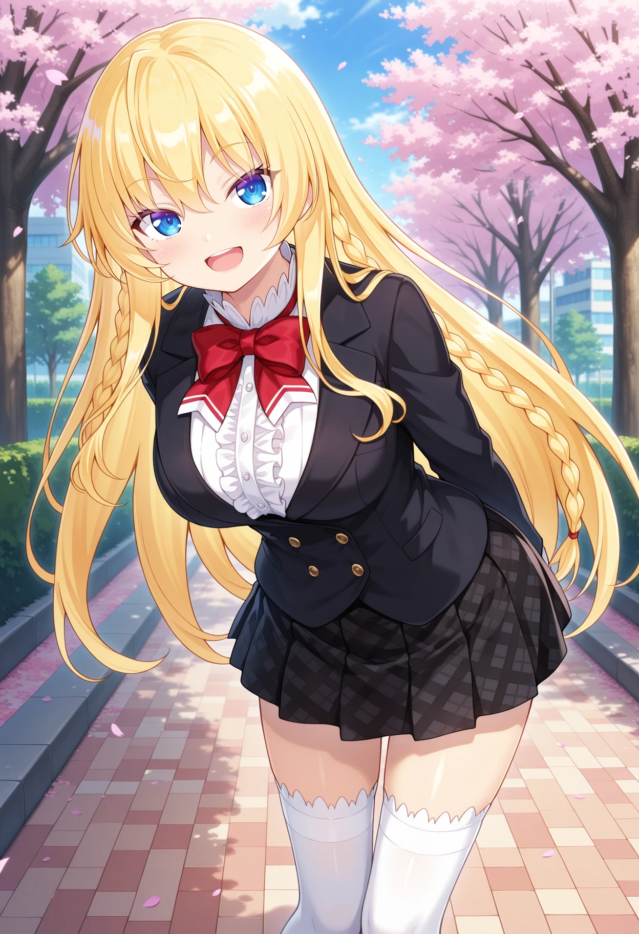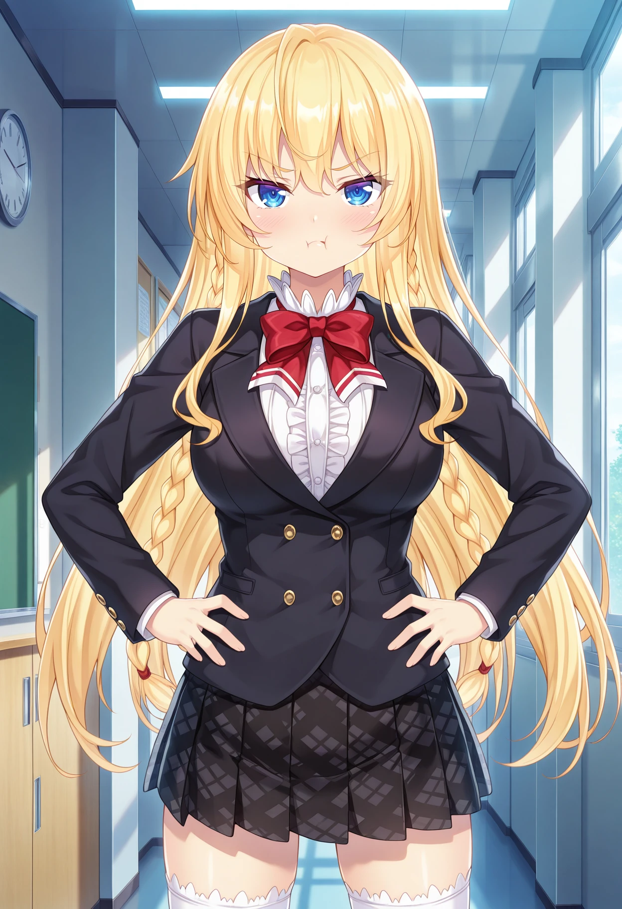 aaterra, long hair, blonde hair, side braid, blue eyes, school uniform, red bowtie, center frills, white shirt, blazer, black jacket, long sleeves, plaid skirt, black skirt, white thighhighs