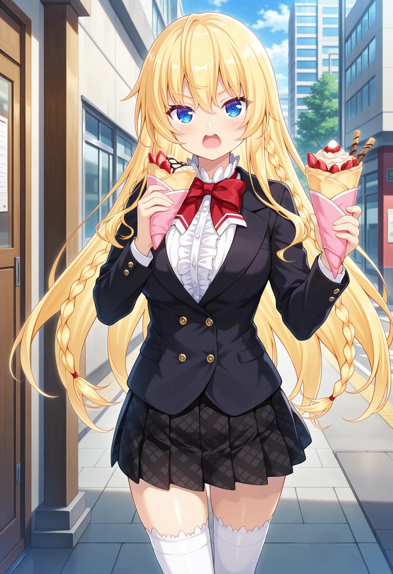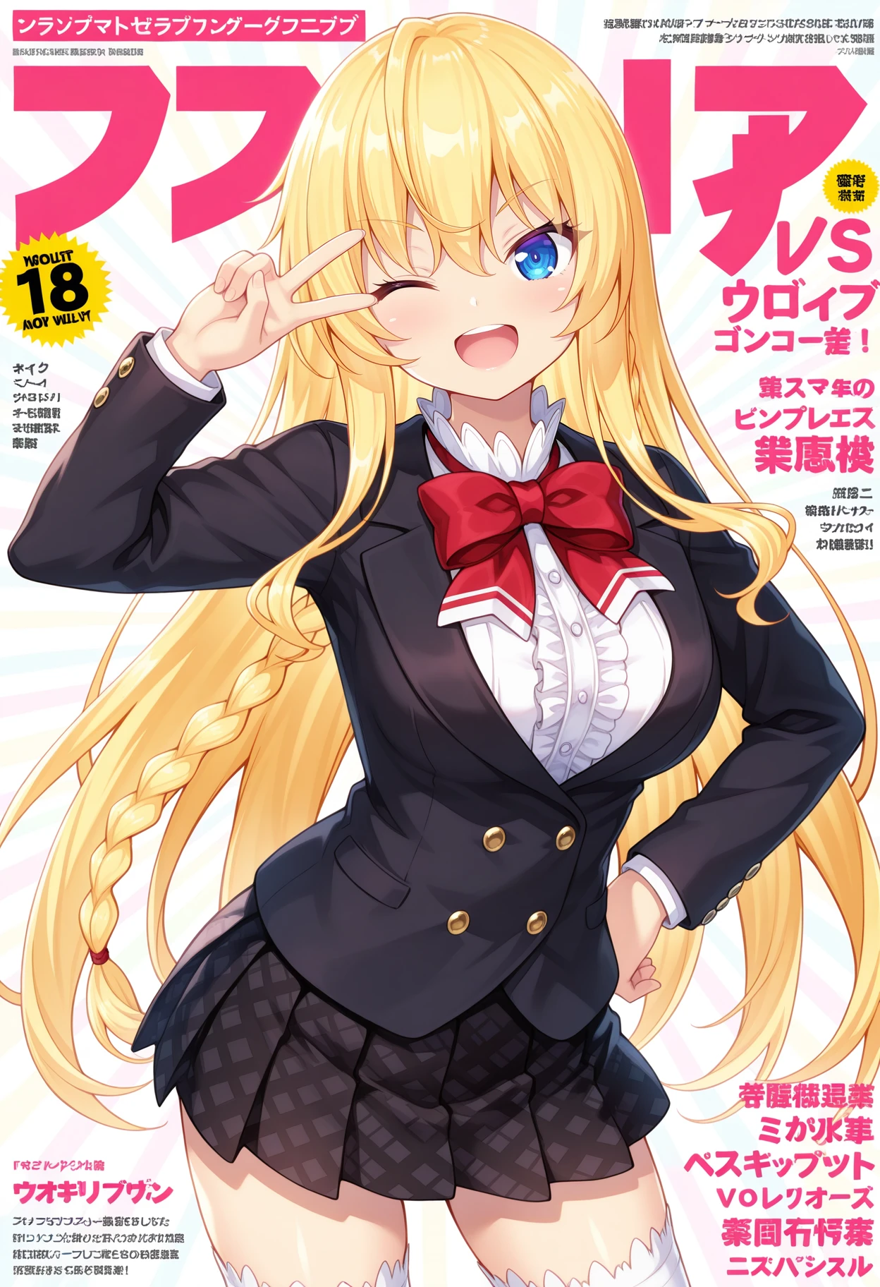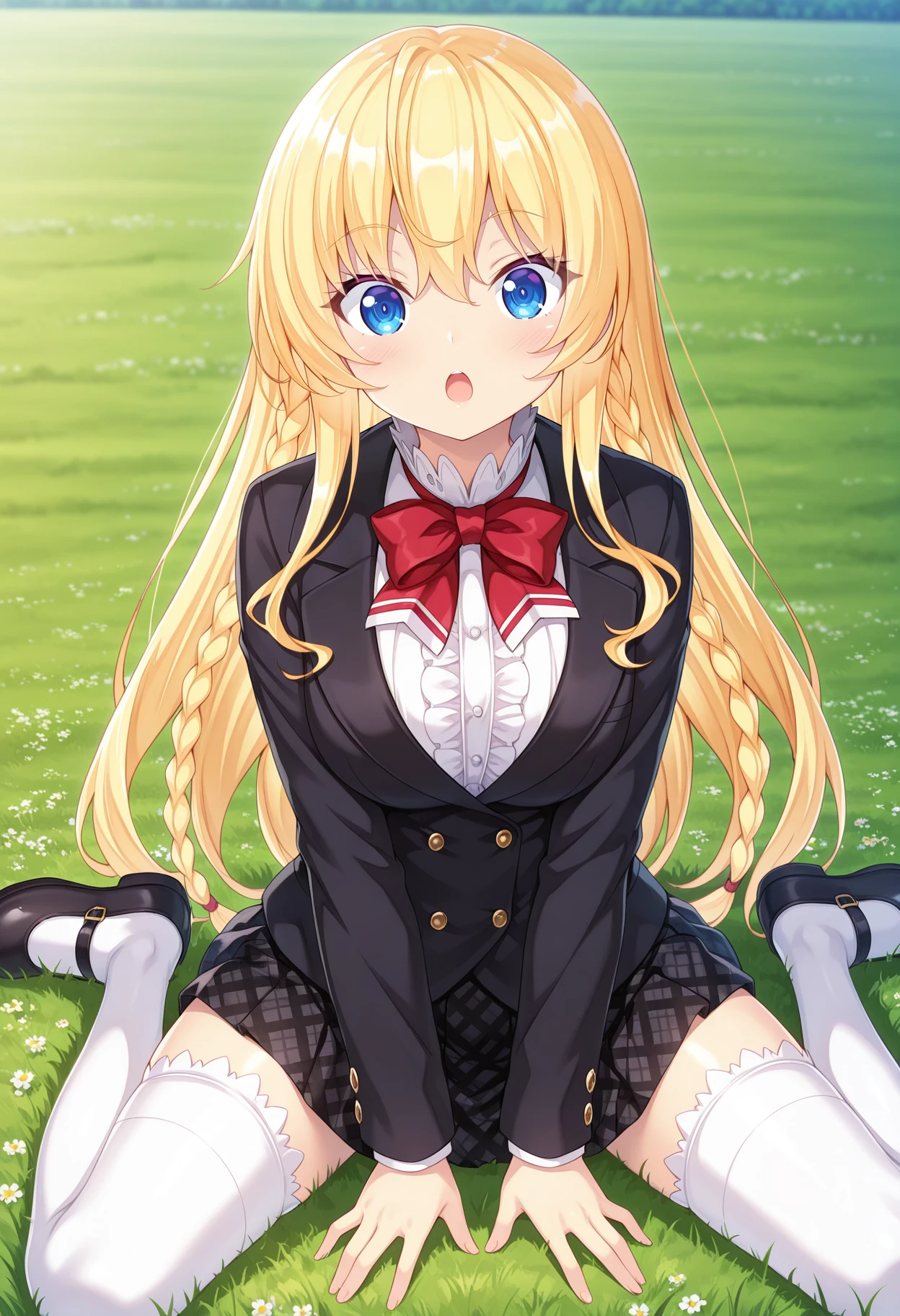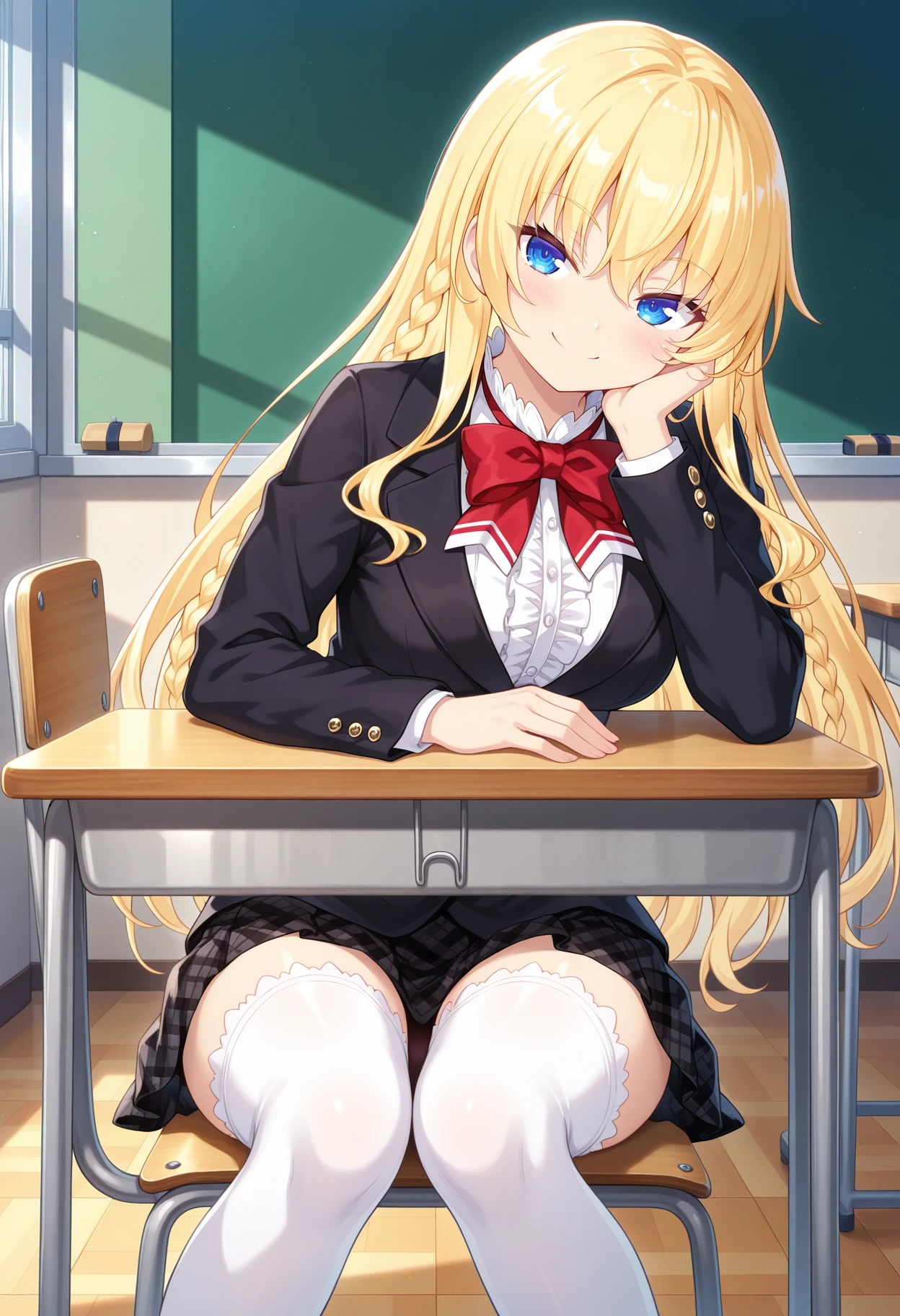 aaterra, long hair, blonde hair, side braid, blue eyes, school uniform, red bowtie, center frills, white shirt, blazer, black jacket, long sleeves, plaid skirt, black skirt, white thighhighs