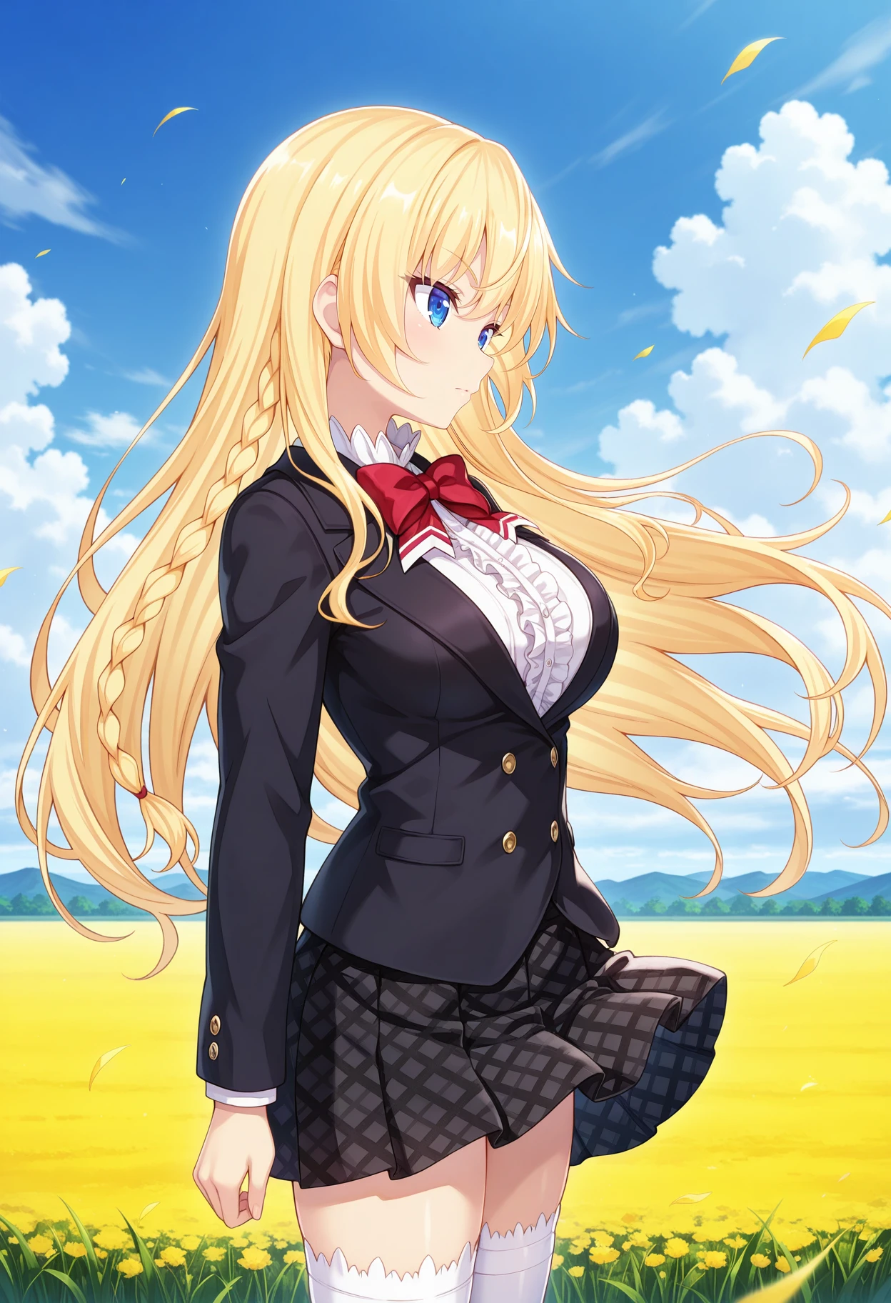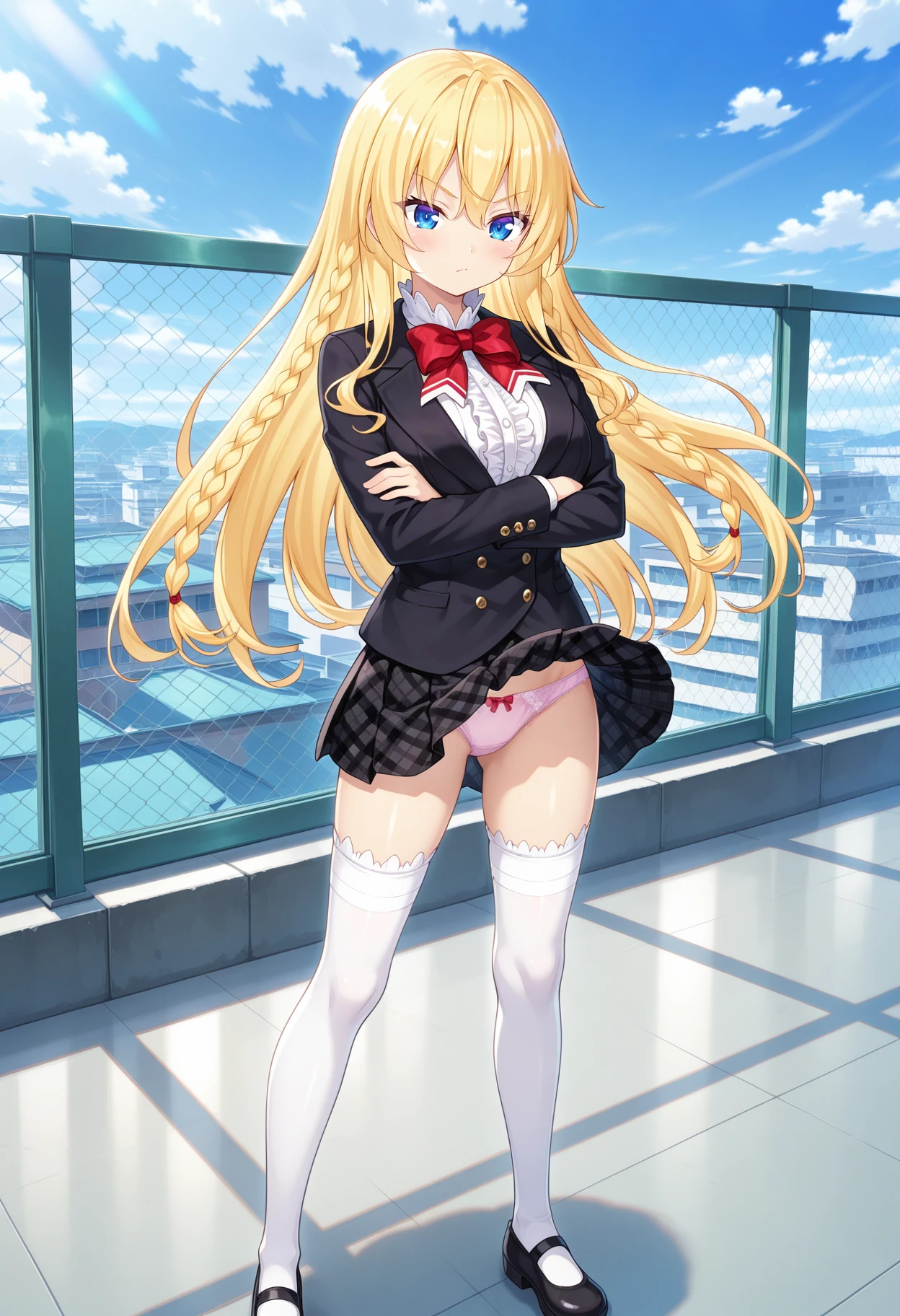 outfit1aaterra, long hair, blonde hair, side braid, blue eyes, school uniform, red bowtie, center frills, white shirt, blazer, black jacket, long sleeves, plaid skirt, black skirt, white thighhighs