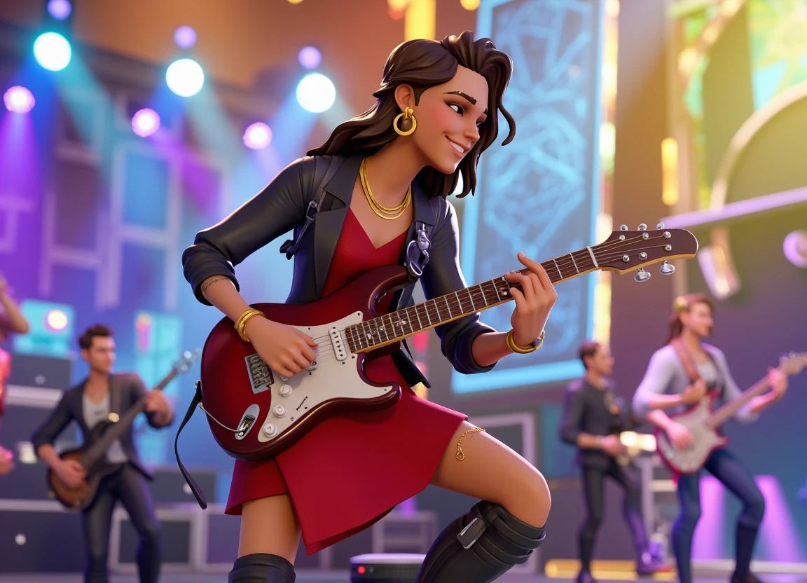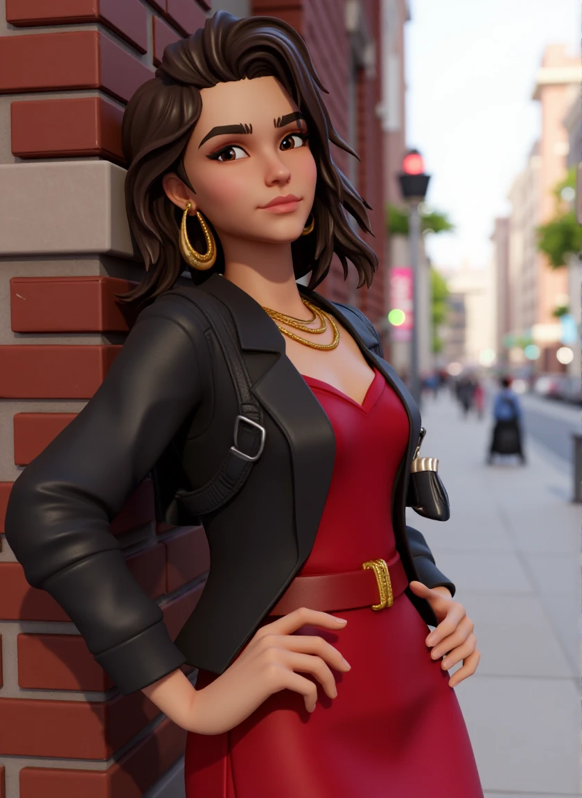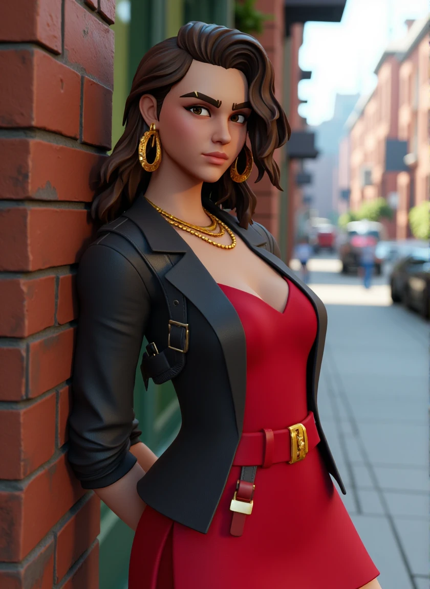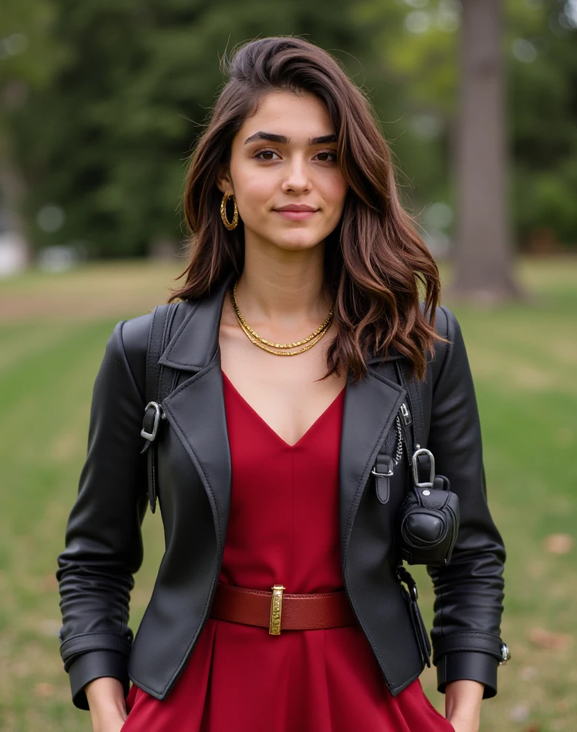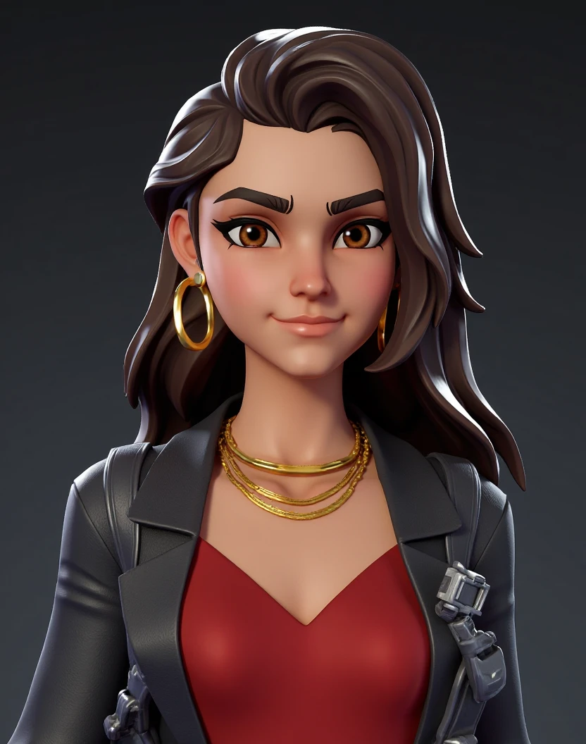 Additional recommended tags: sharp expressive facial features, light olive skin tone, long wavy dark brown hair styled in loose waves