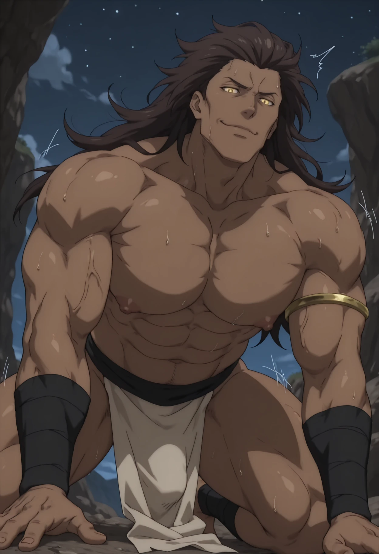 Mature male, manly, dark brown hair, Long hair, Golden eyes, Dark skin, pronounced cheekbones, Gold armband, black bandaged arm, black bandaged fingers,