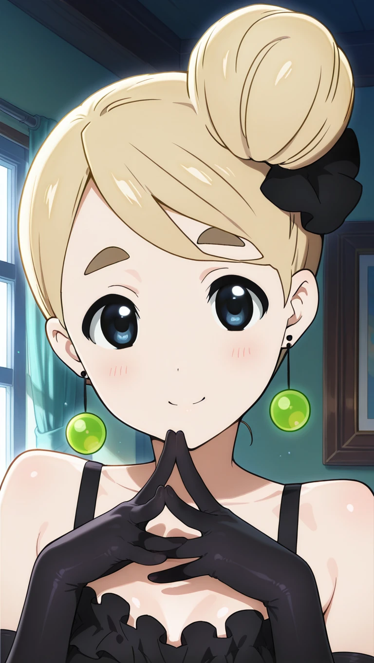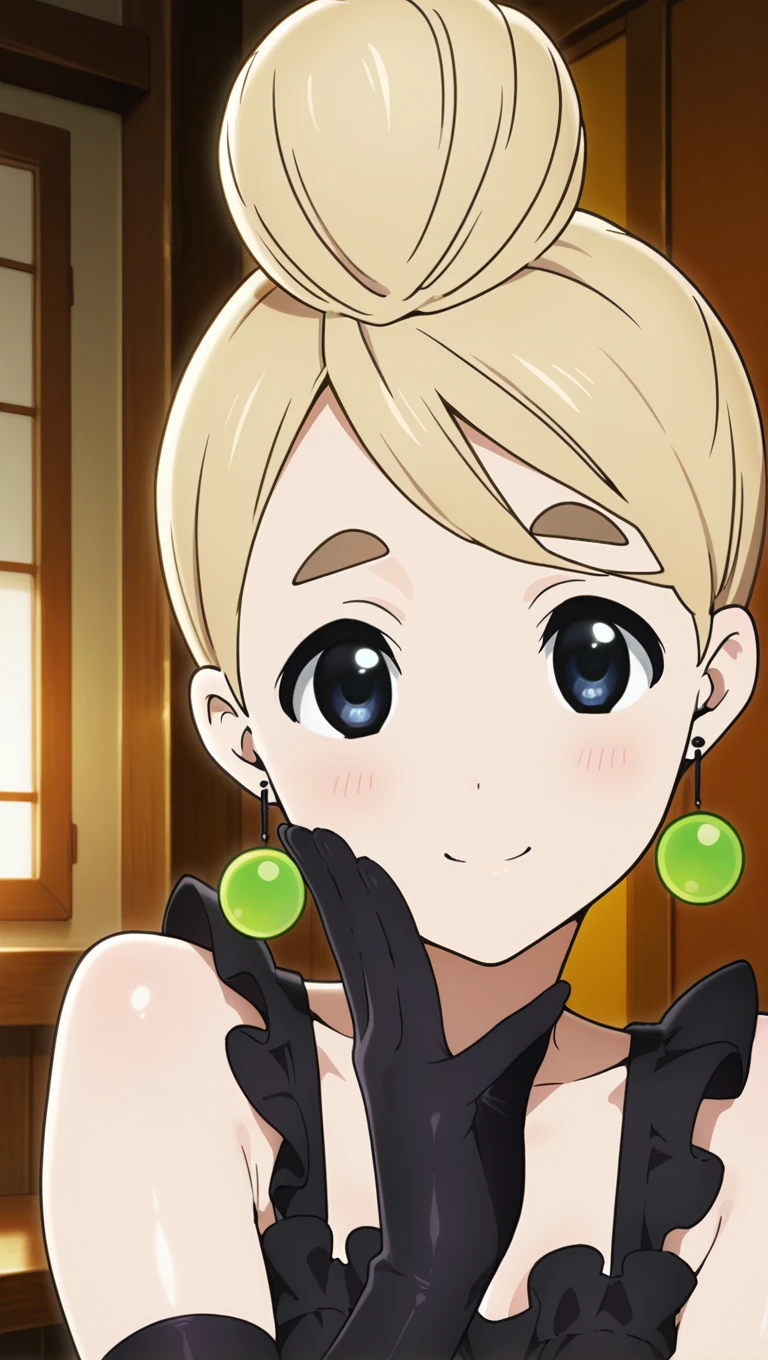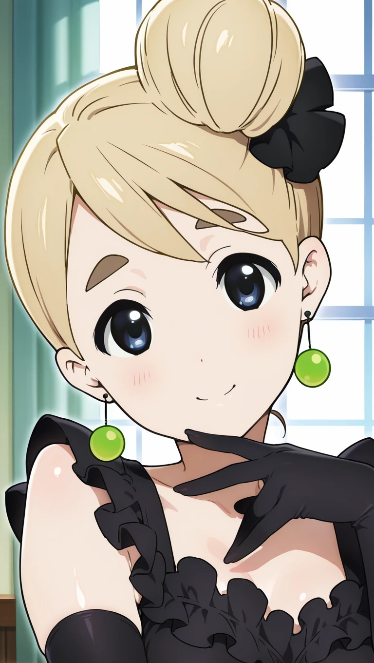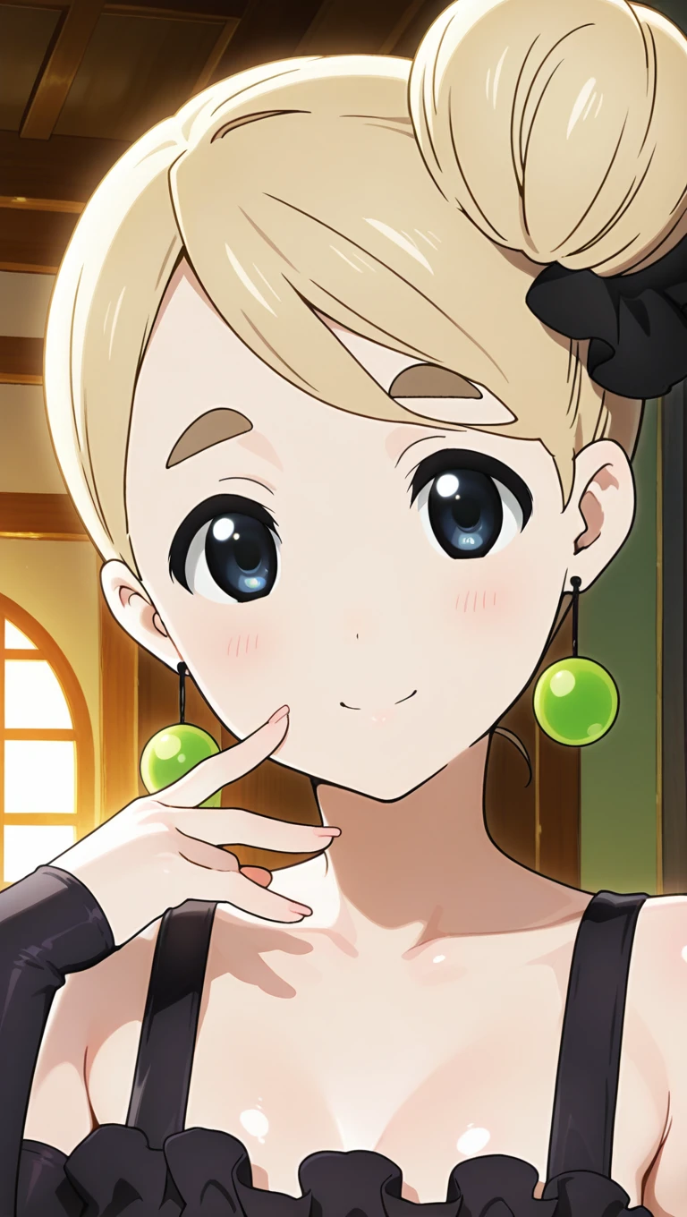 blonde hair,single hair bun,jewelry,earrings,thick eyebrows,black eyes