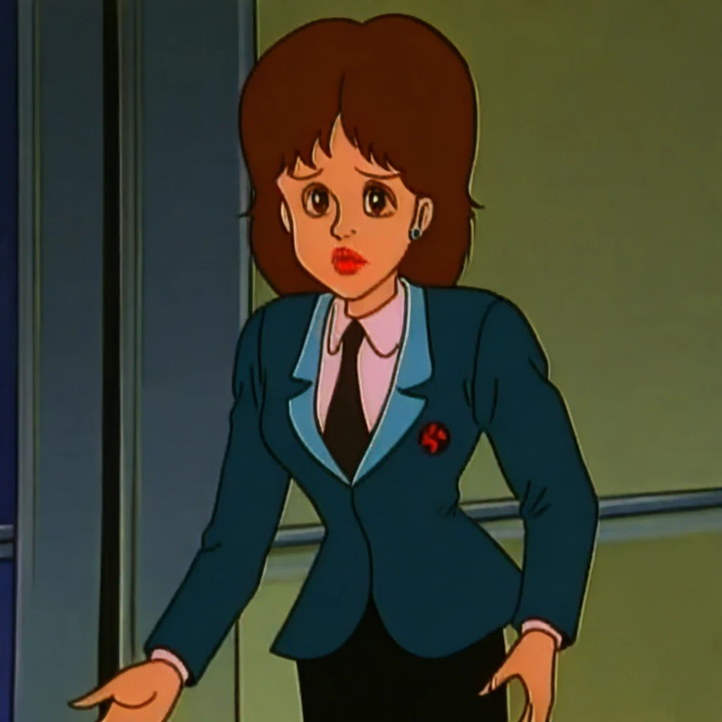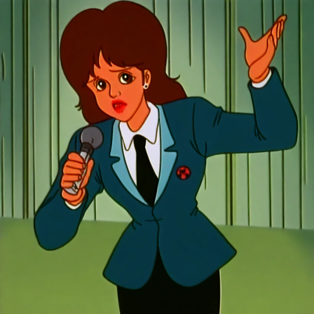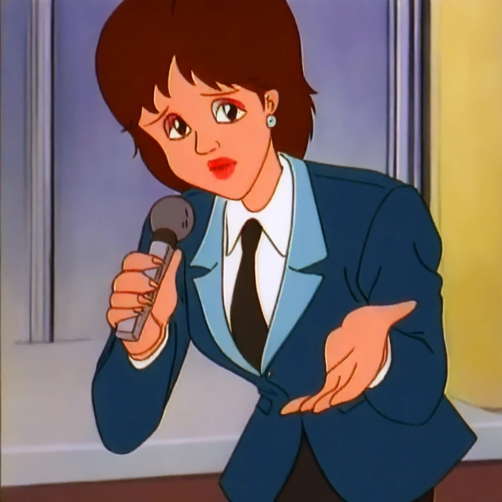 Bree Ricotta, Brown Hair, Blue Blazer, Microphone, Red Lipstick, Brown Eyes, Brown Hair, Necktie, White Dress Shirt, Pencil Skirt, Earrings