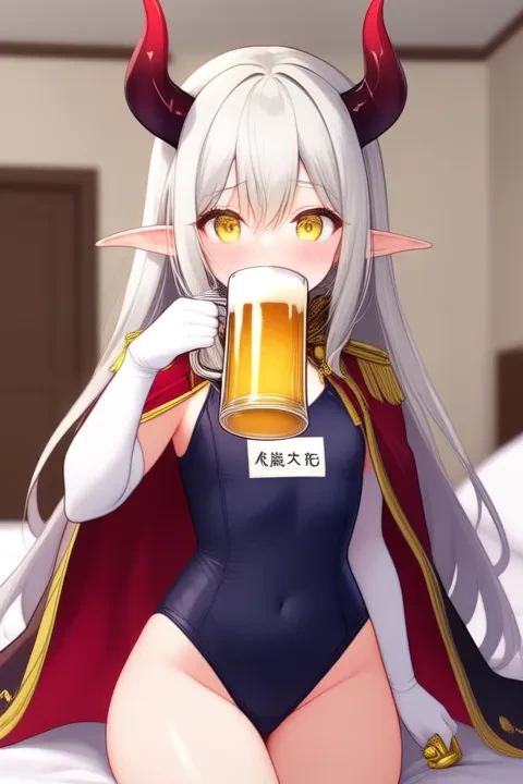sample prompt:Emma August, anime-style girl. The image features an anime-style character with long, white hair styled in a high ponytail with a red horn on the left side of her head. Their eyes are large and expressive, with yellow hues, and she has pointed ears, suggesting she might be an elf or a similar fantasy creature.She is wearing a dark blue bodysuit with gold trim around the collar and cuffs. The bodysuit has a small white label with Japanese characters on it. She also has a red cape with gold trim draped over her shoulders. Her gloves are white, (she is dancing:2.5), (chibi Nendoroid:3.5) in bedroom.