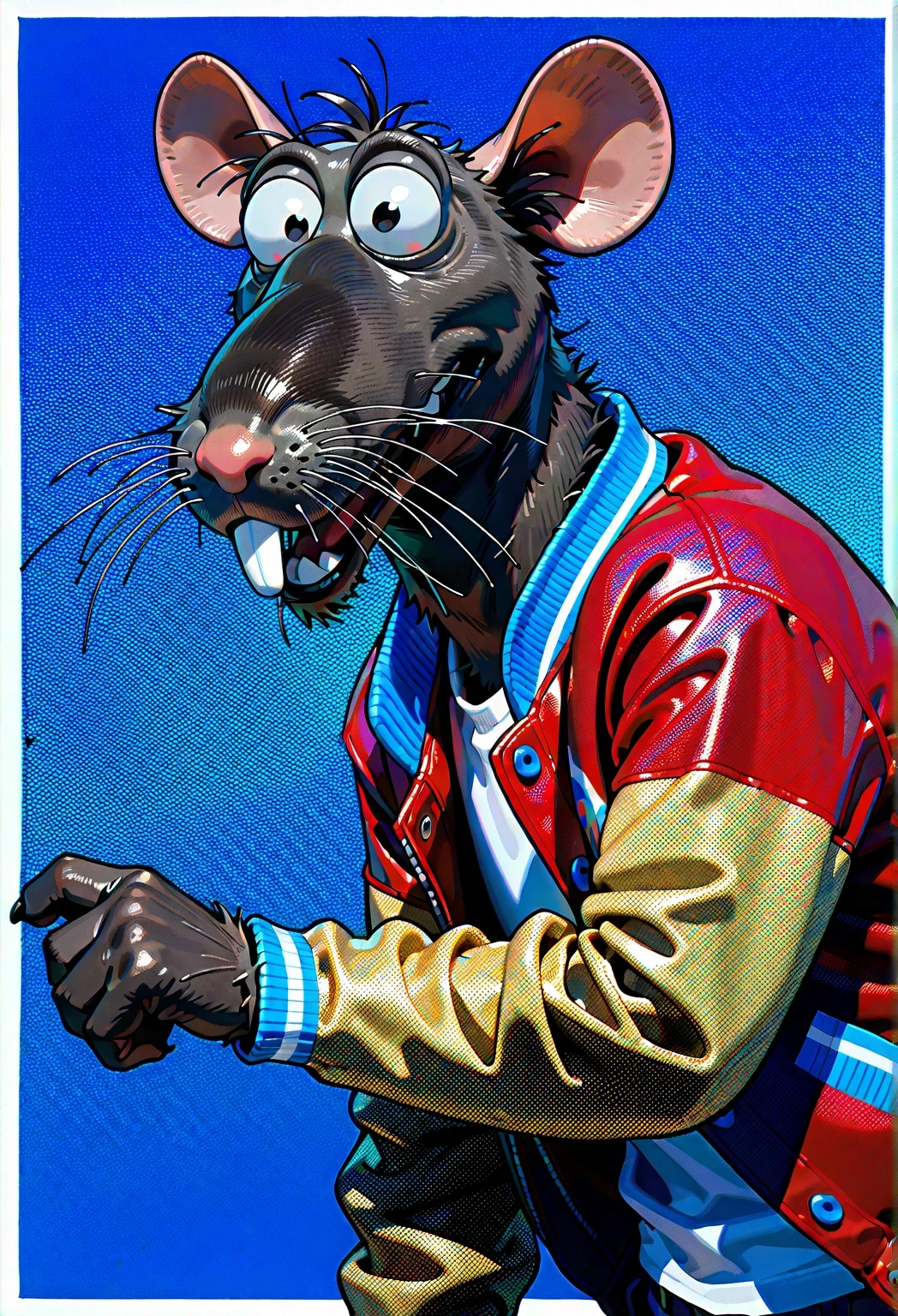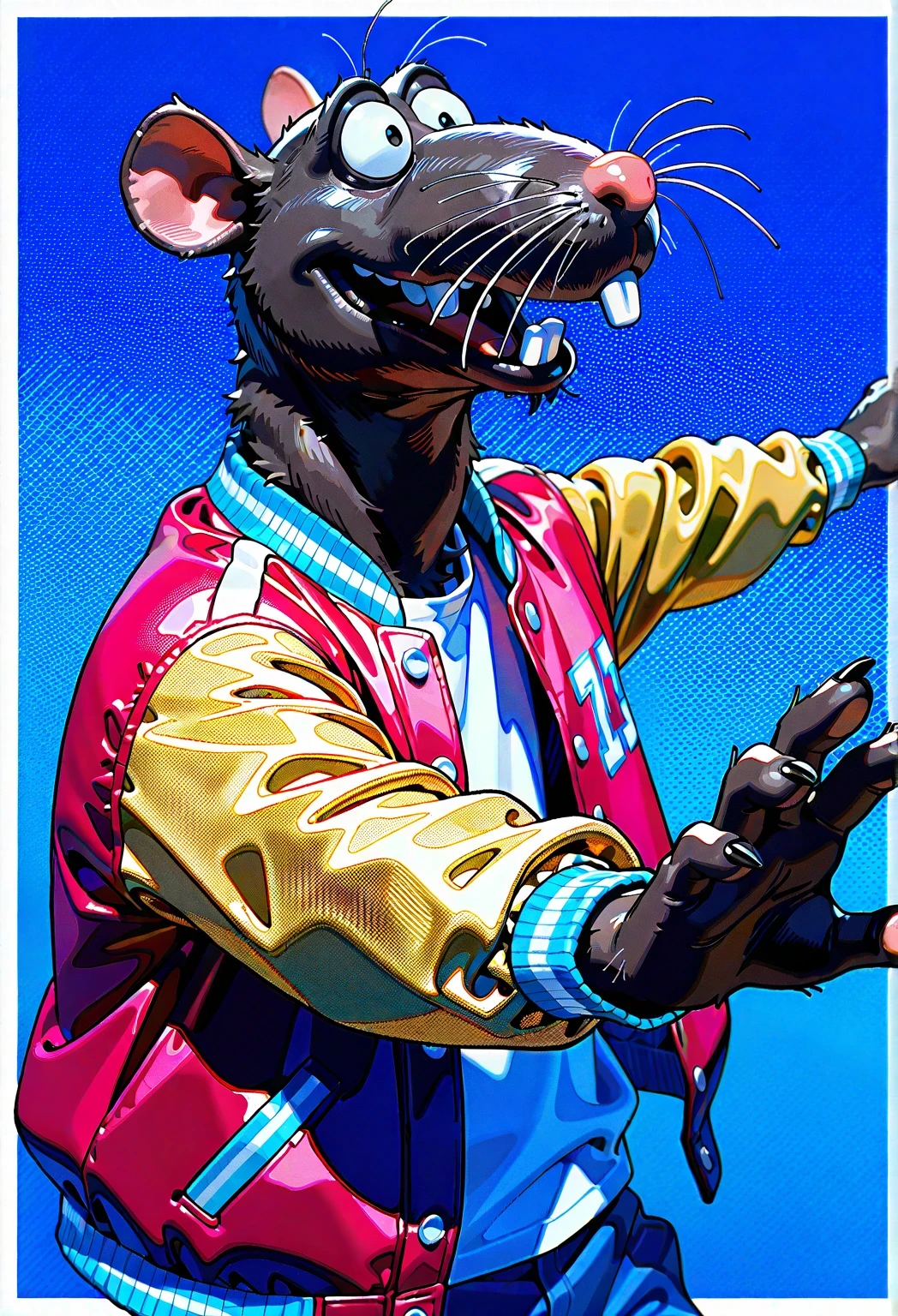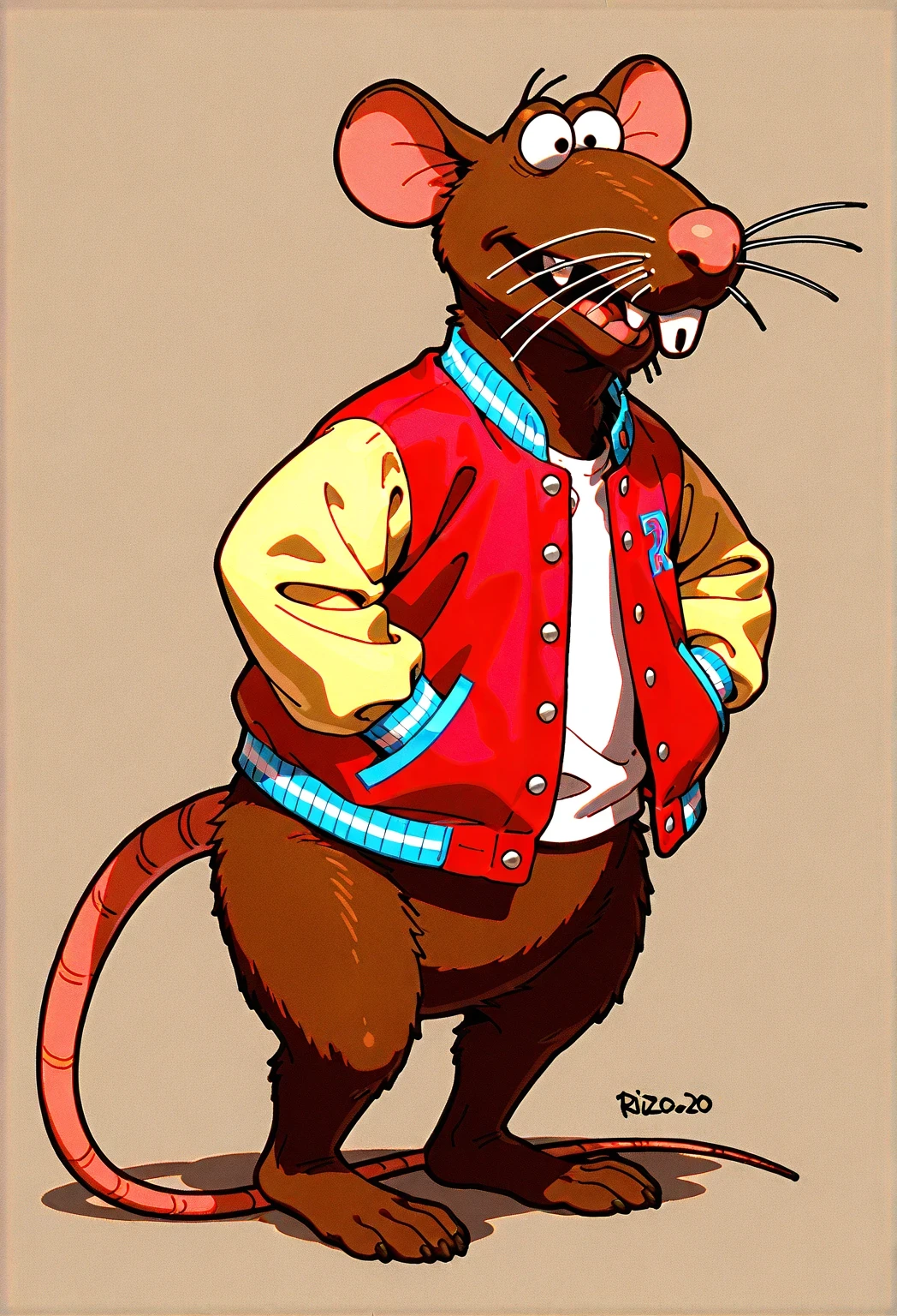 Rizzo0TM, 1boy, rat, brown fur, whiskers, red varsity jacket with light blue trim, white shirt, prominent buck teeth, black eyes, grey-blue eyelids, light yellow sleeves