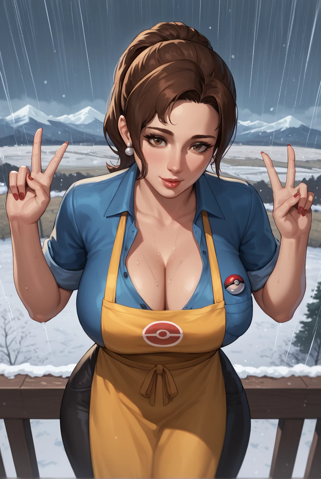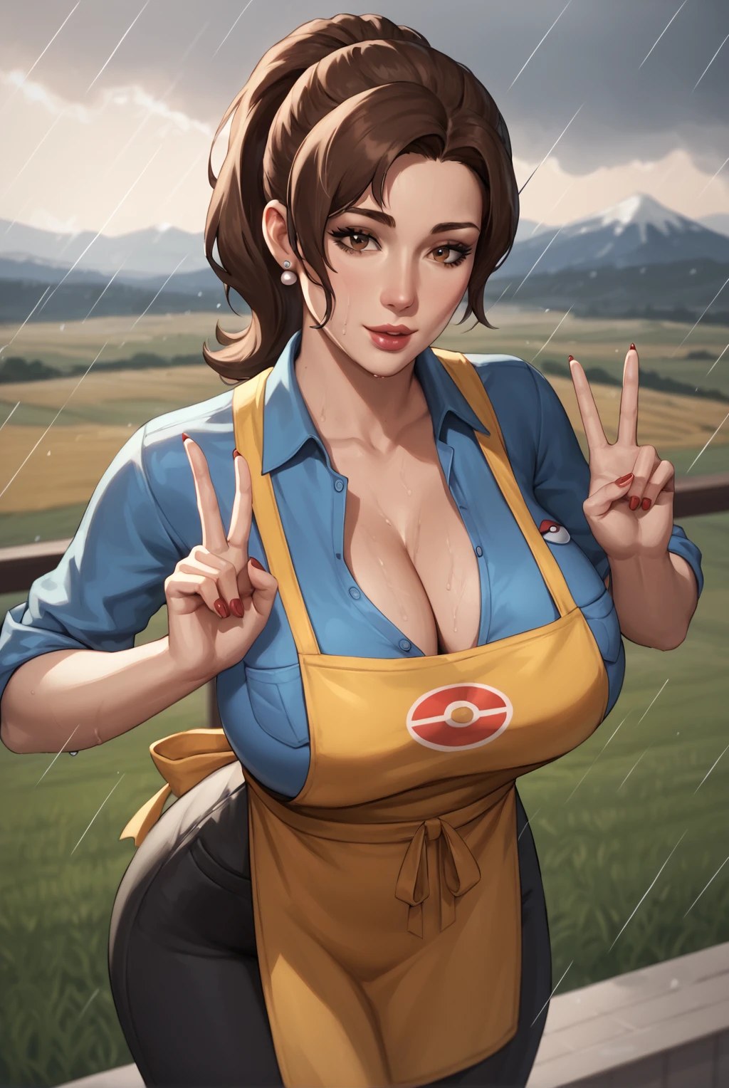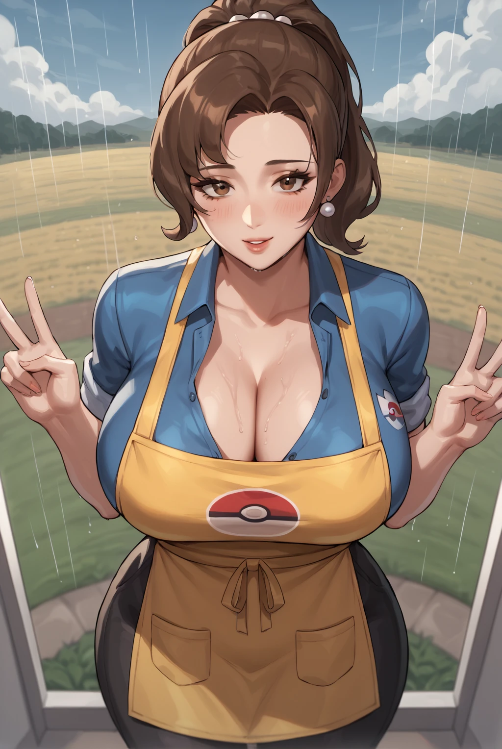 large breasts, brown hair, brown eyes, ponytail, sidelocks, cleavage, apron, yellow apron, short sleeves, open clothes, parted bangs, black pants, blue shirt, curvy, sleeves rolled up, wide hips, mature female, breast pocket, partially unbuttoned, poke ball print, pearl earrings