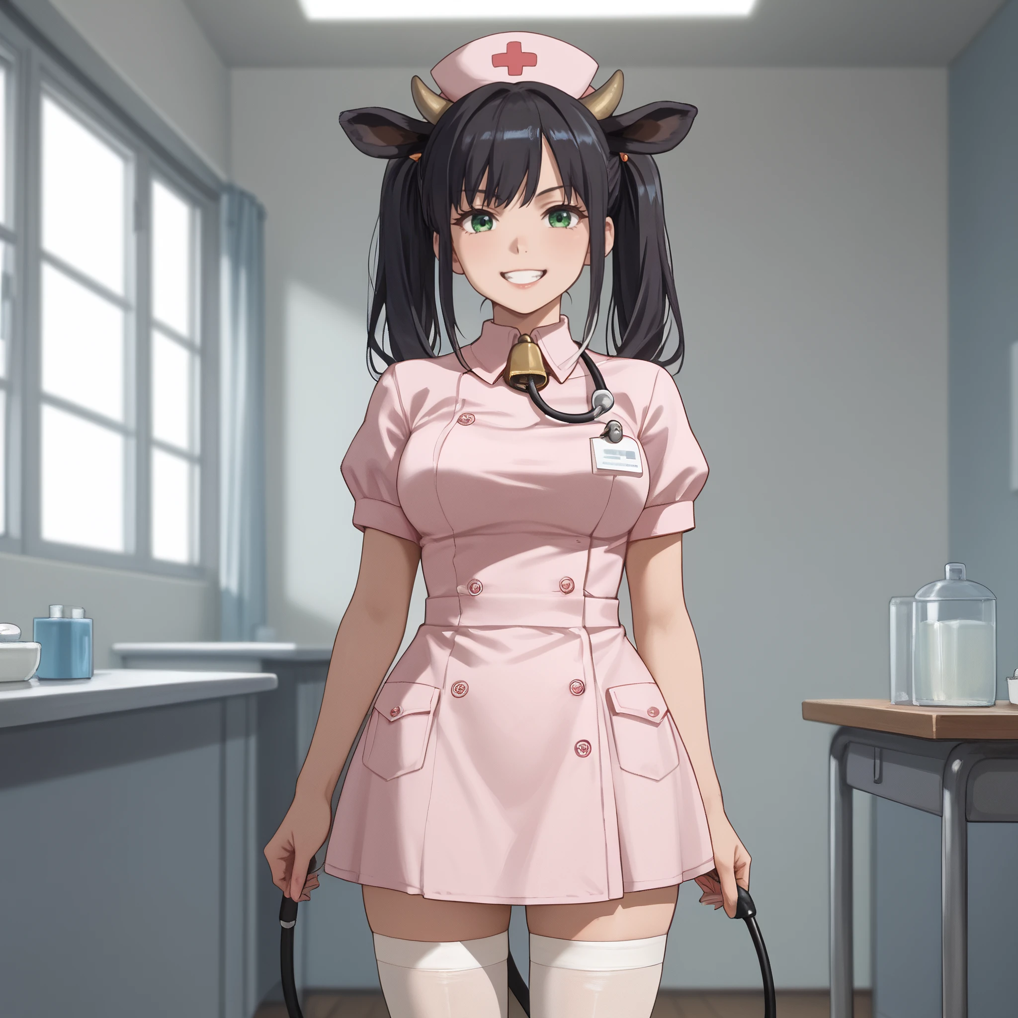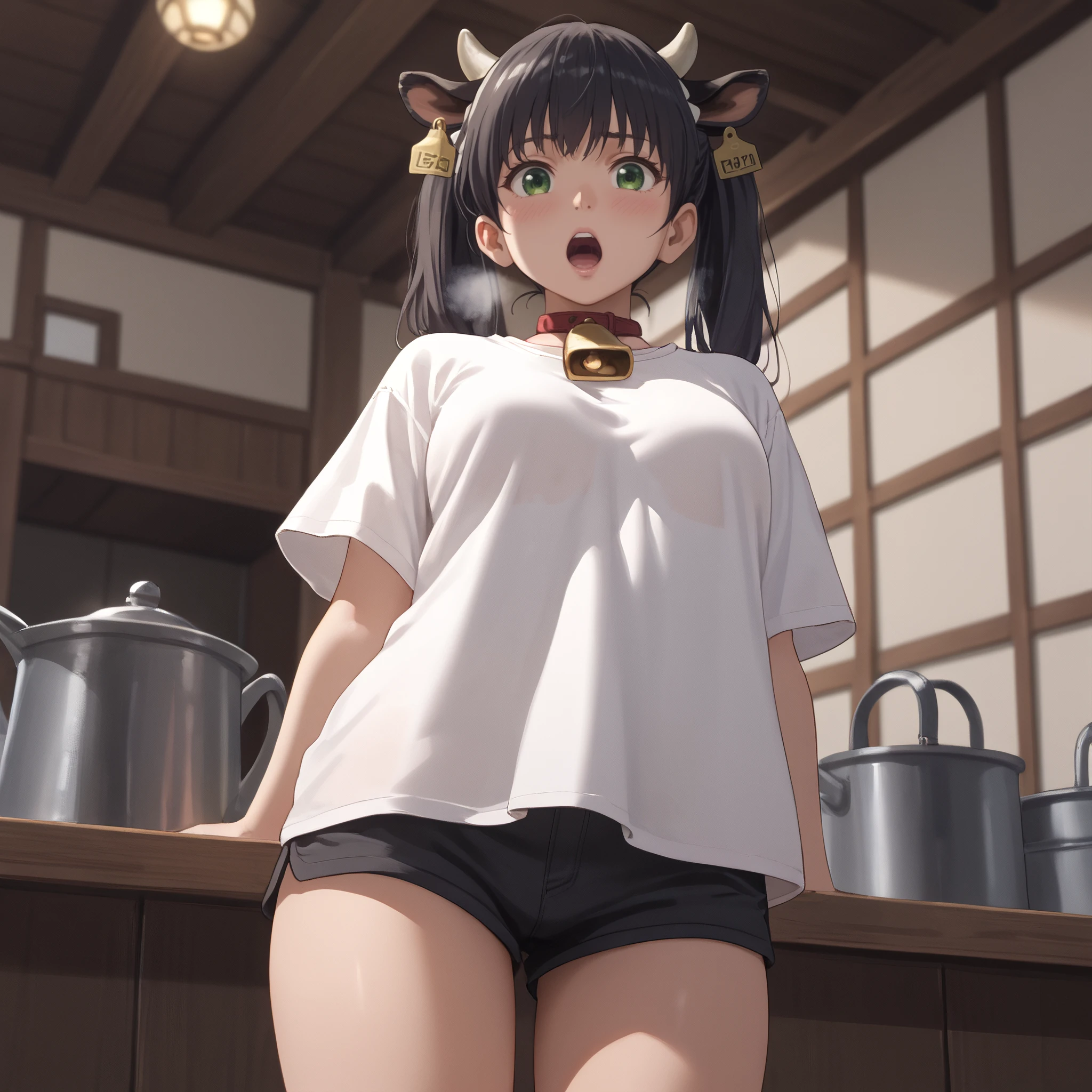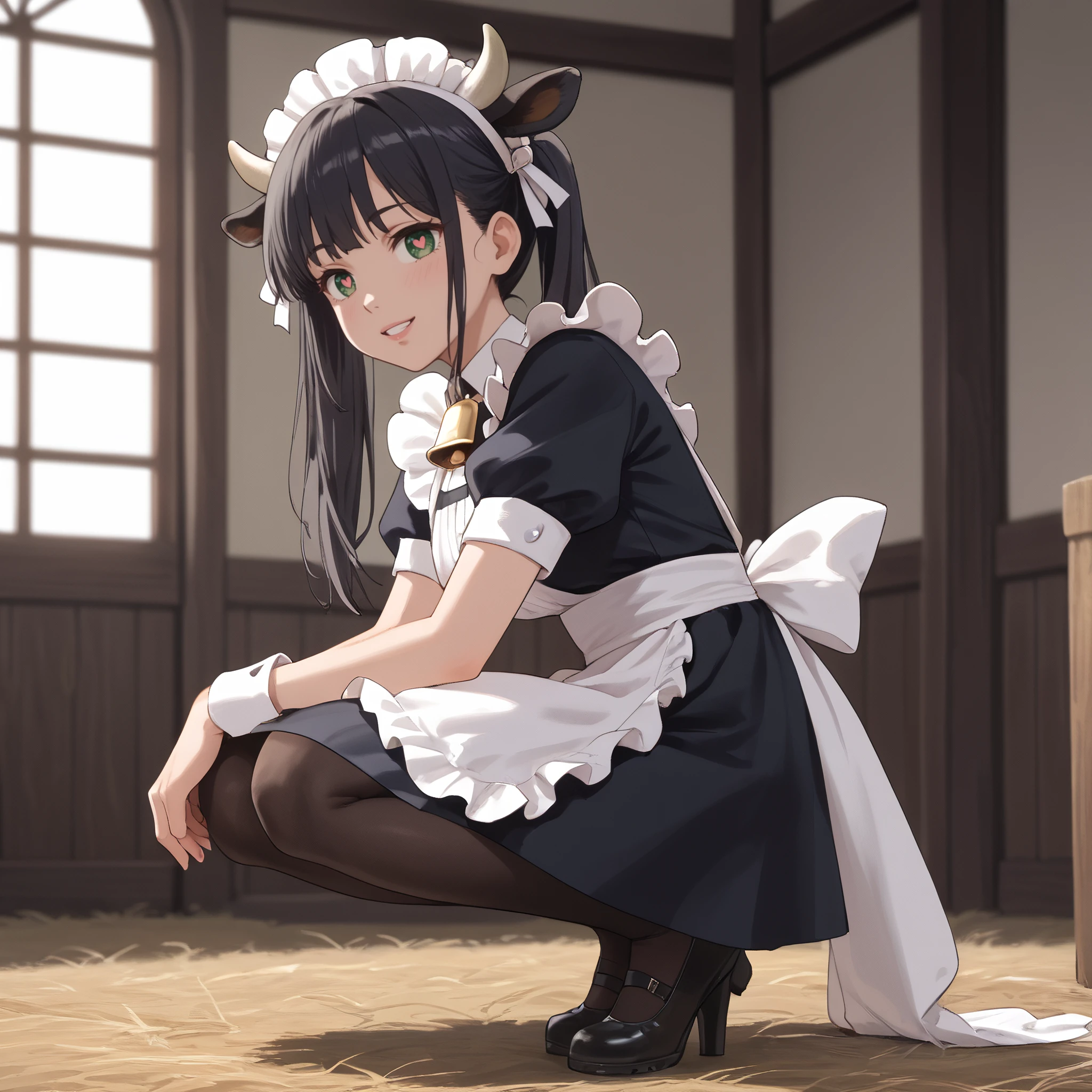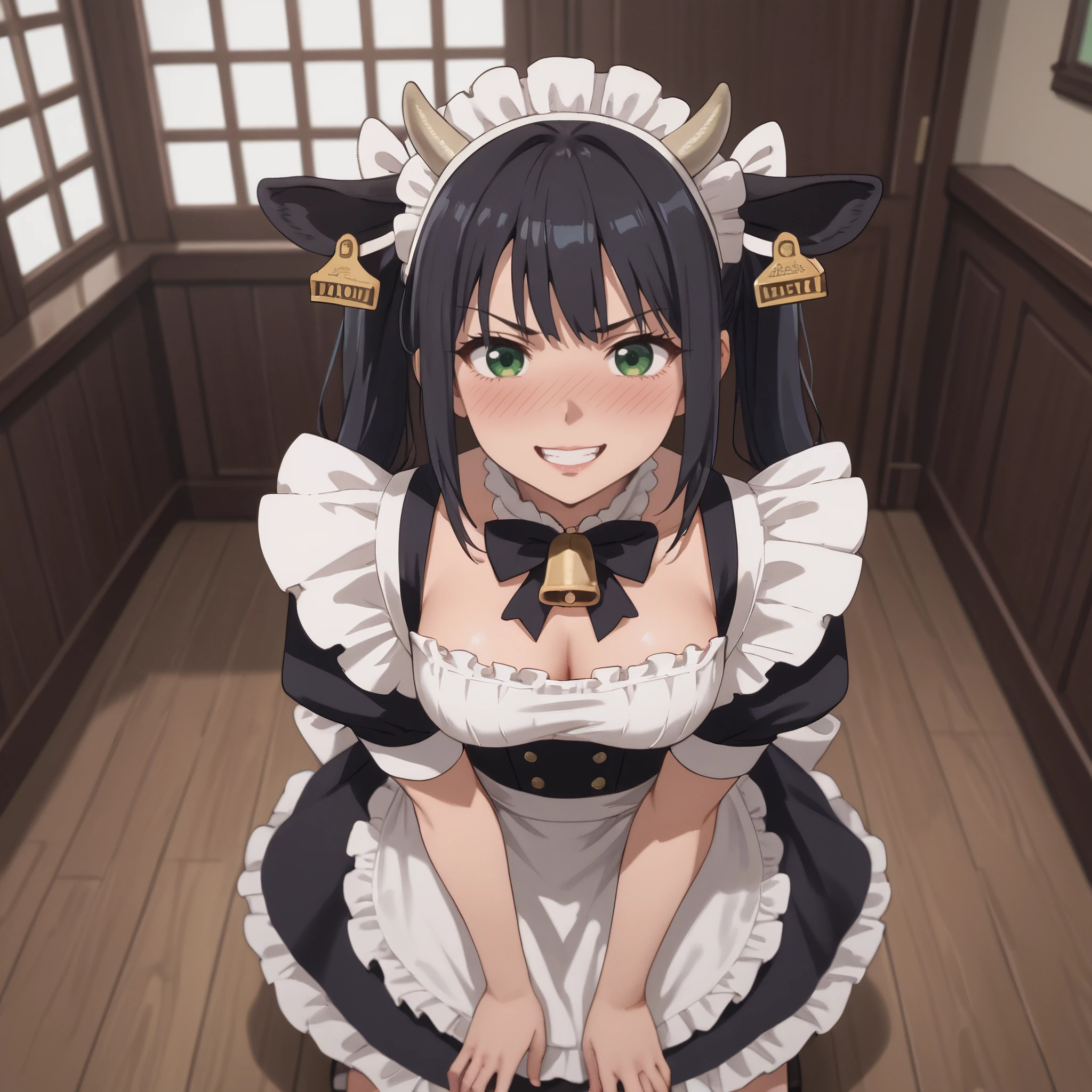 AMWCowTwo, long hair, black hair, eyebrows visible through hair, green eyes, animal ears, bangs, twintails, neck bell, cow ears, hair between eyes,