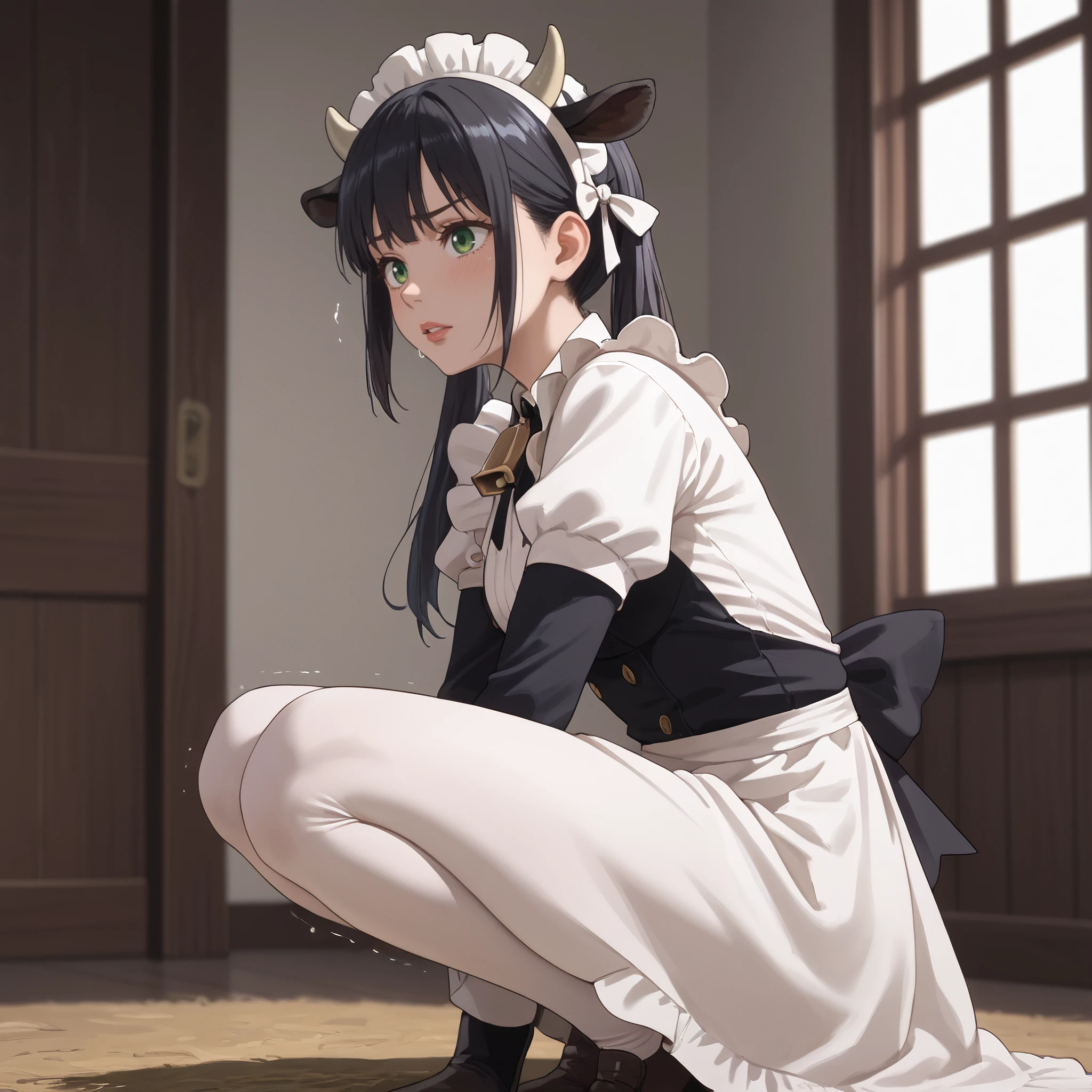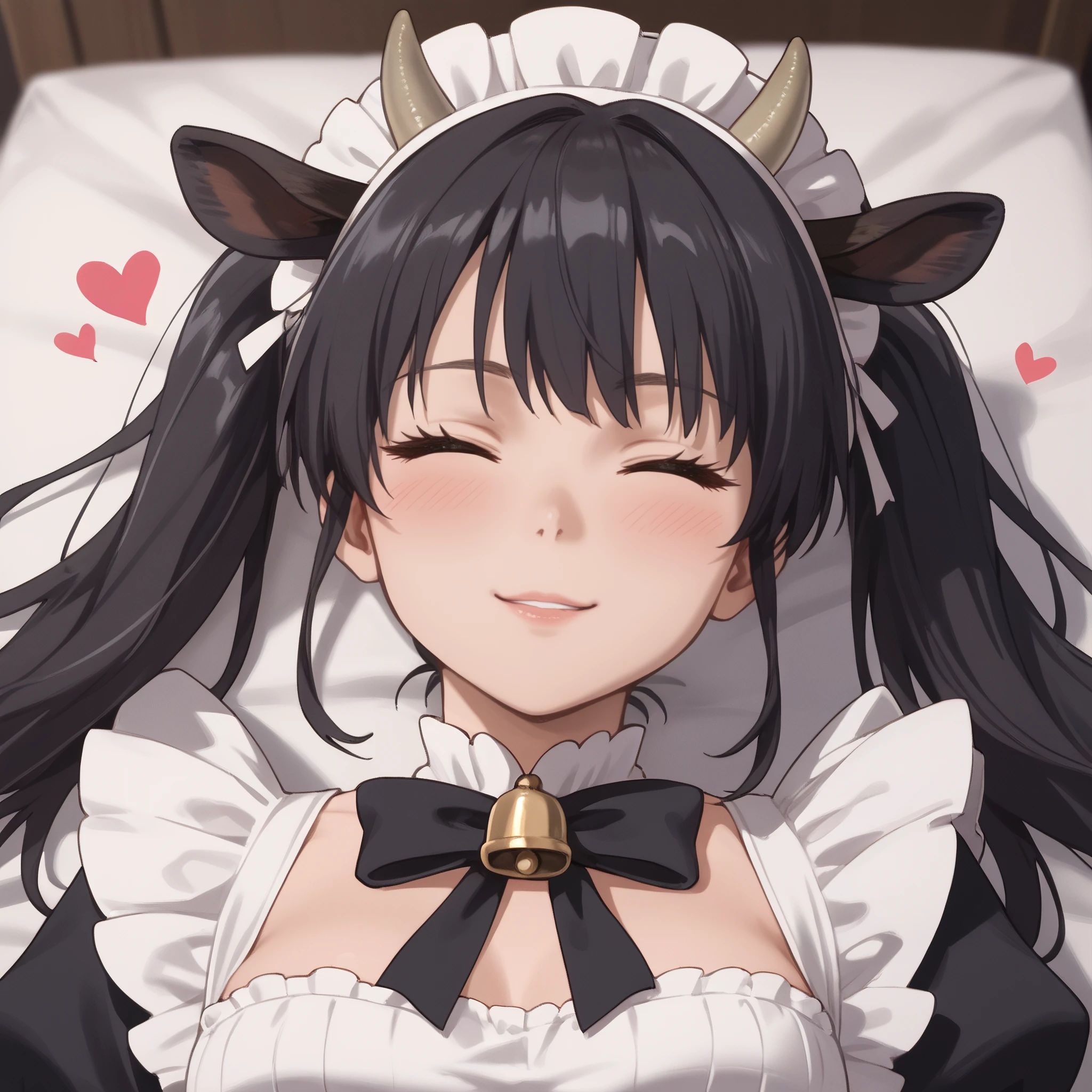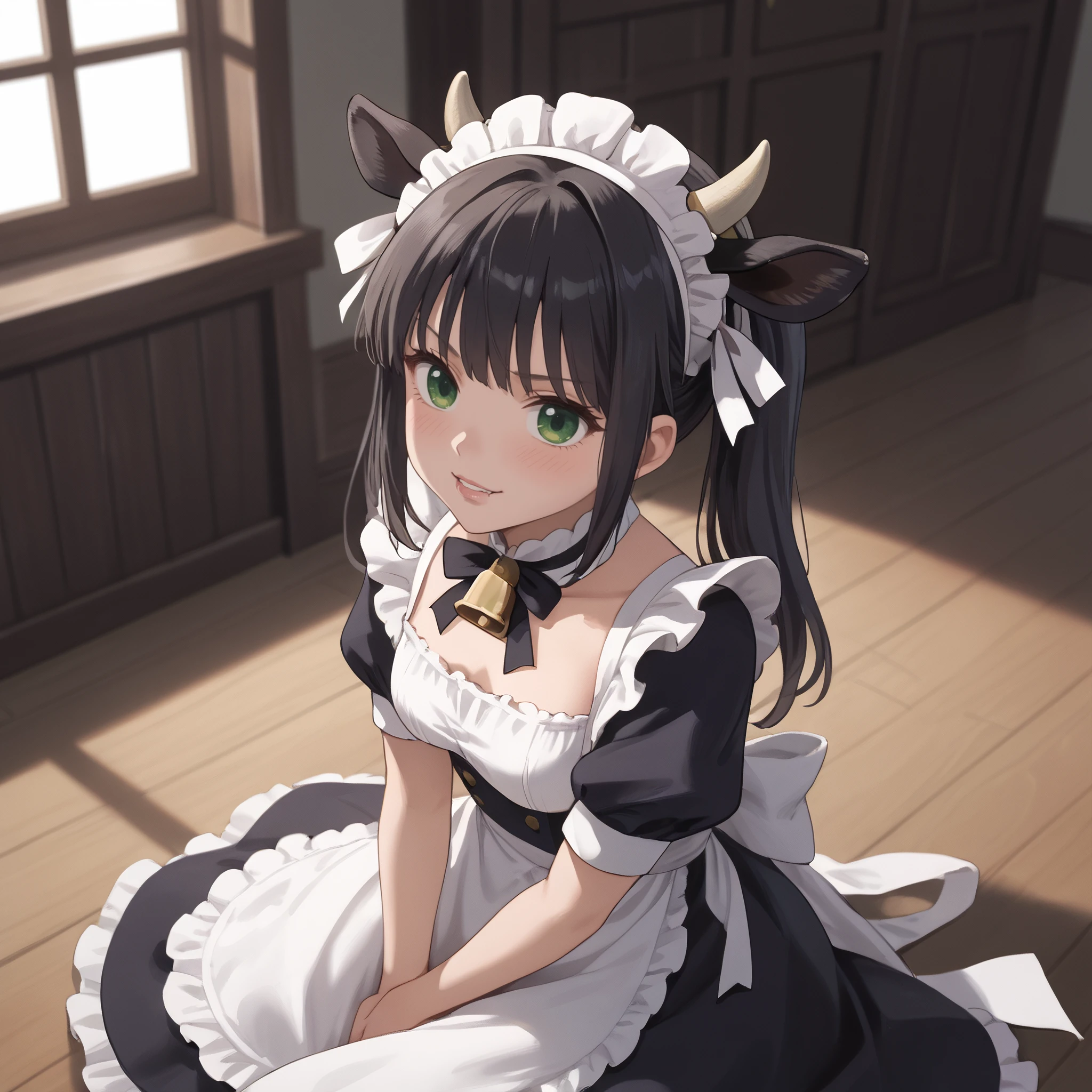 maid, horns, maid apron, maid headdress, ribbon, white ribbon, bow, bell,