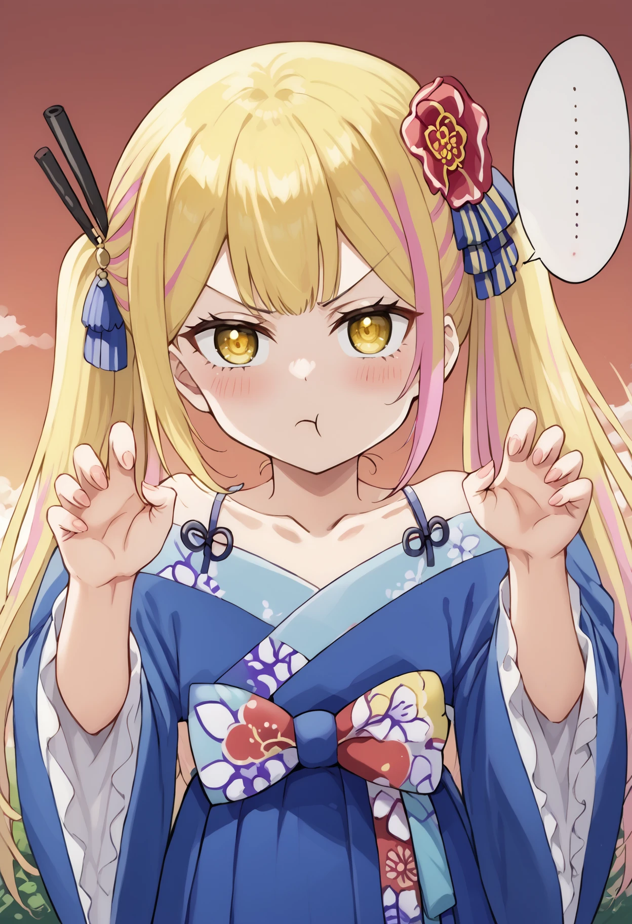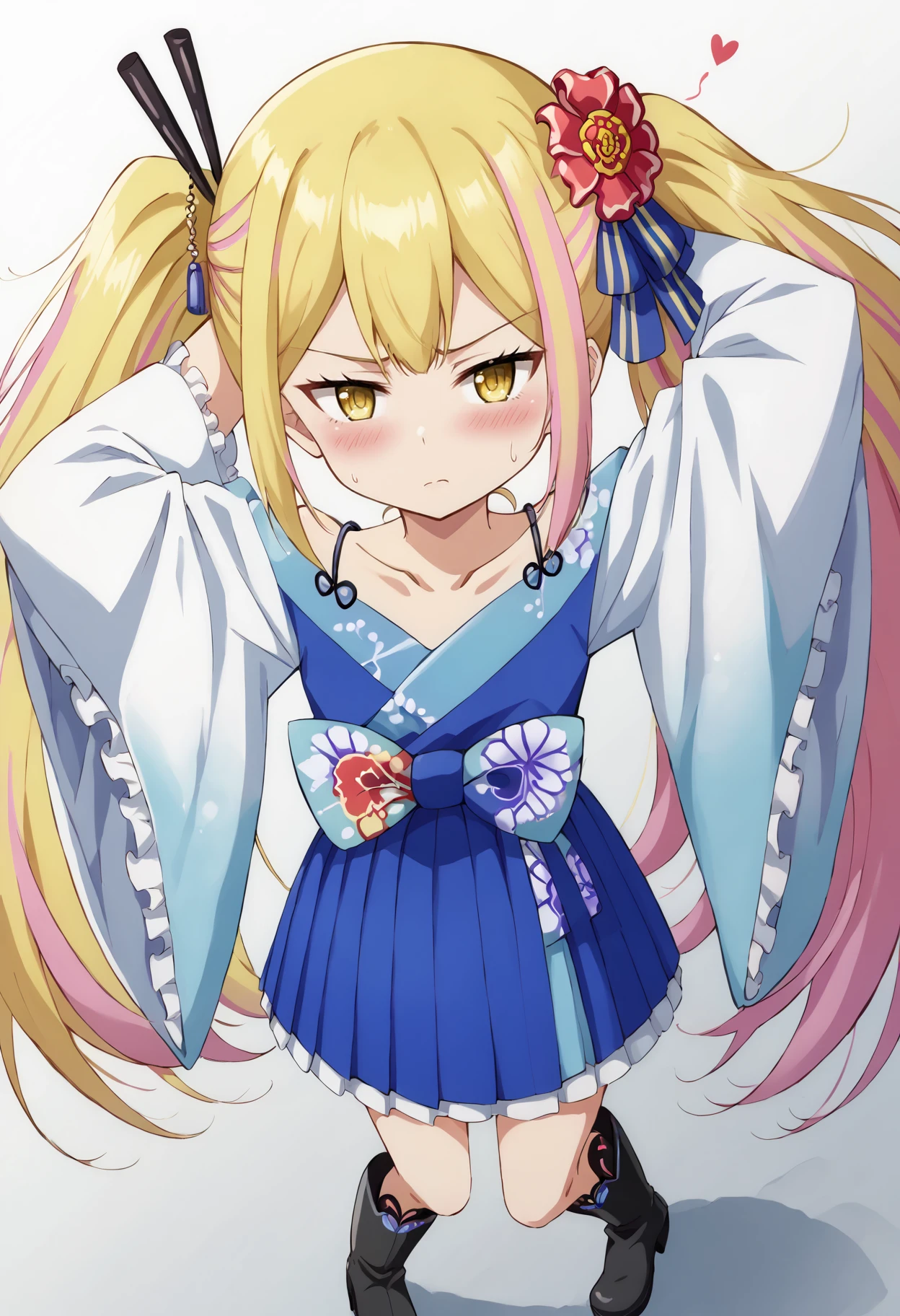 SaraGD, sara da odin, default outfit, 1girl, solo, blonde hair, pink hair, multicolored hair, streaked hair, twintails, long hair, hair ornament, hair flower, yellow eyes, wide sleeves, dress, frills, blue dress, wide sleeves, long sleeves, japanese clothes, kimono, floral print, blue bow, collarbone, black footwear, boots