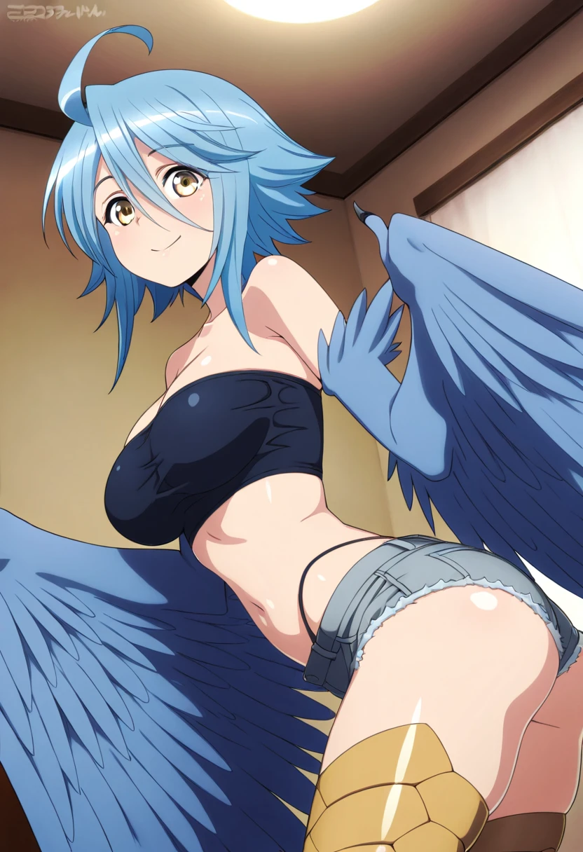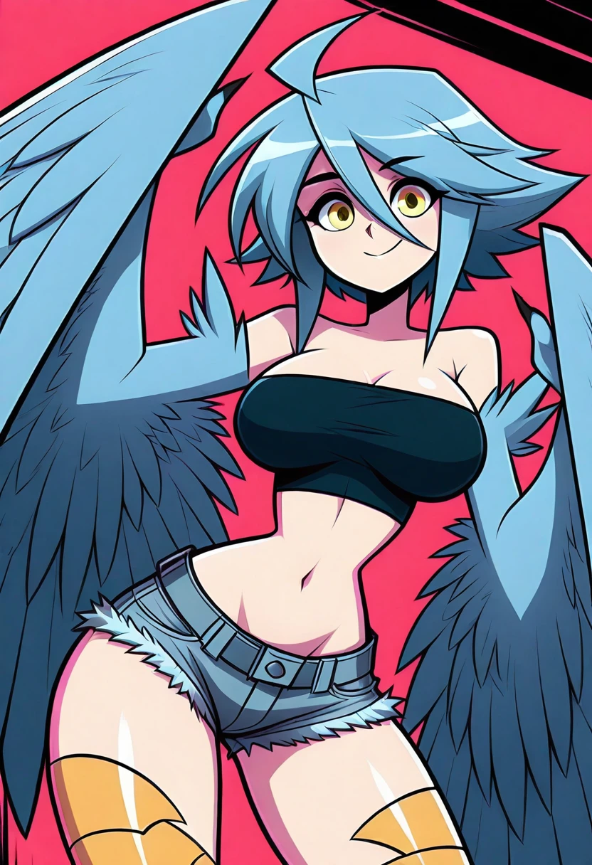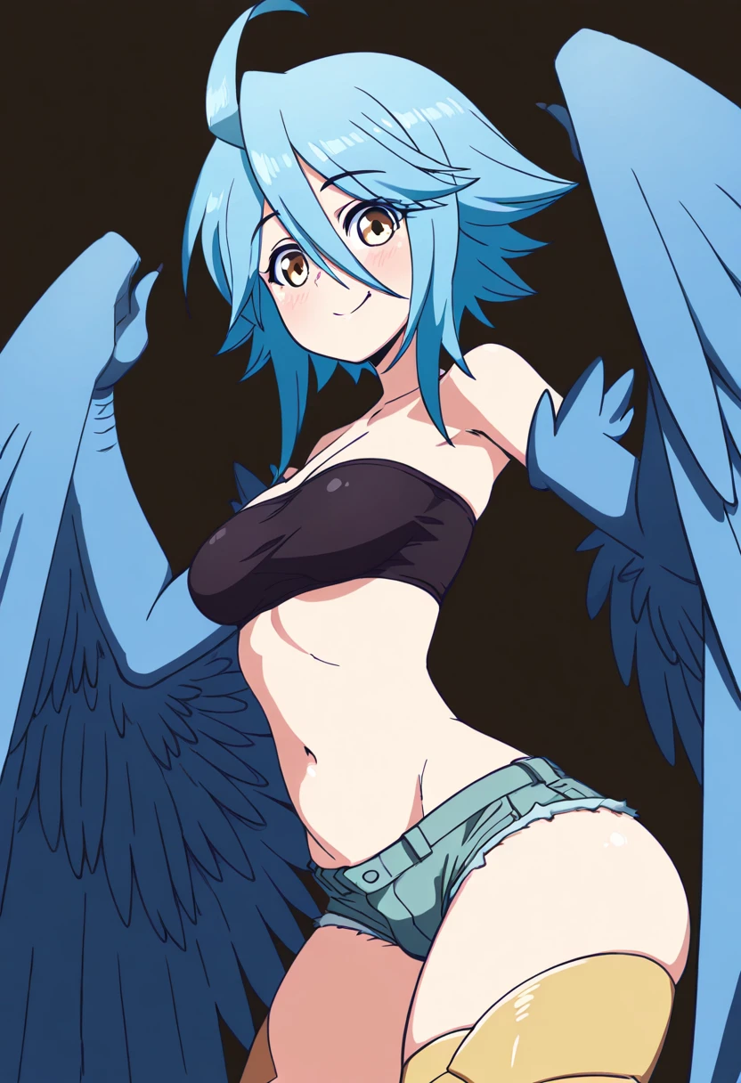 zzPapi, yellow eyes, ahoge, blue hair, short hair, hair between eyes, harpy, winged arms, feathered wings, bird legs, bare shoulders, tube top, bandeau, midriff, navel, denim shorts, cutoffs,