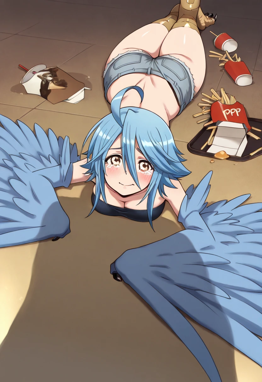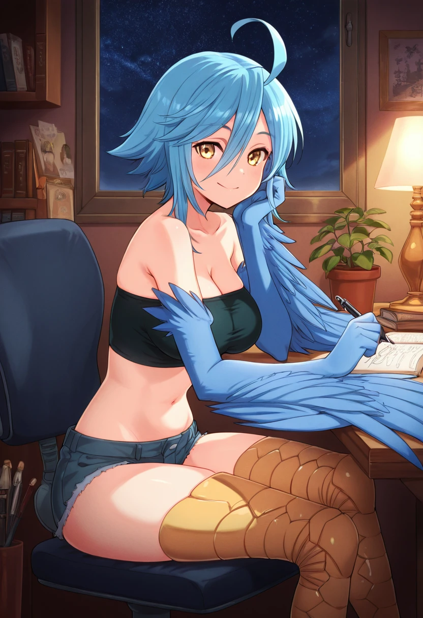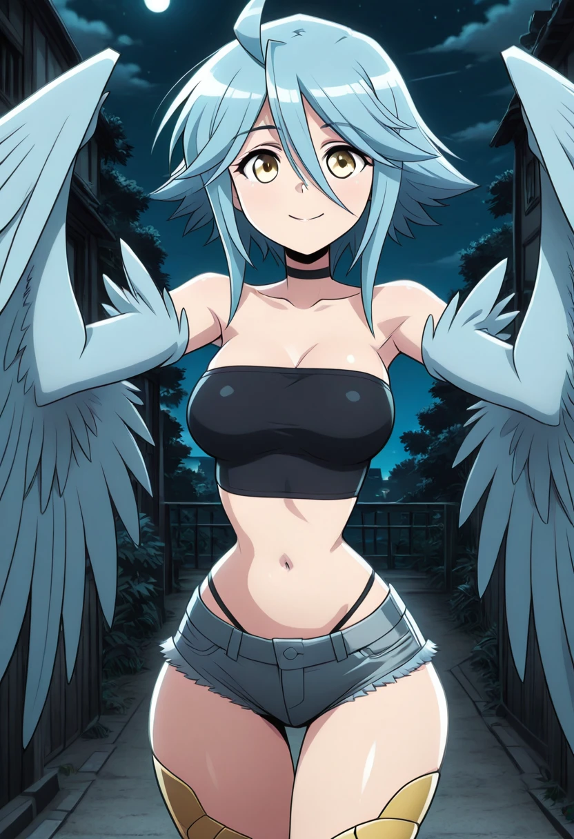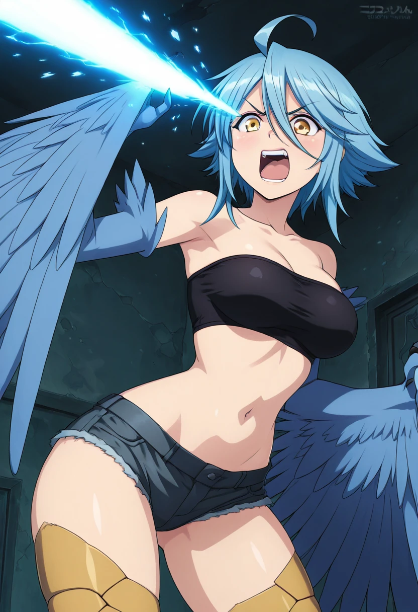 zzPapi, yellow eyes, ahoge, blue hair, short hair, hair between eyes, harpy, winged arms, feathered wings, bird legs, bare shoulders, tube top, bandeau, midriff, navel, denim shorts, cutoffs,