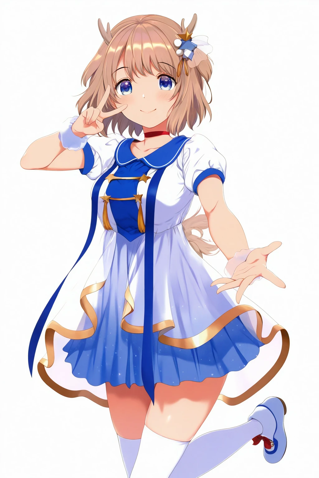Kano_singer,1girl,brown hair,short hair,blue eyes,hair ornament,short sleeves, red choker,dress,bangs,puffy short sleeves,white thighhighs,deer ears,star hair ornament,shoes,skirt,white dress,antlers,