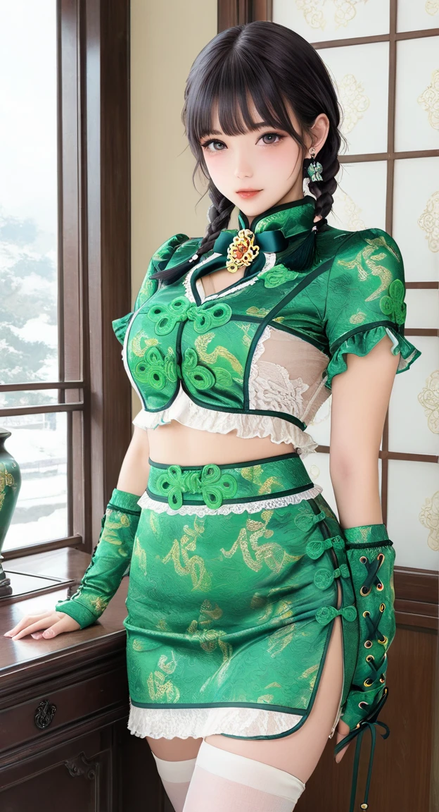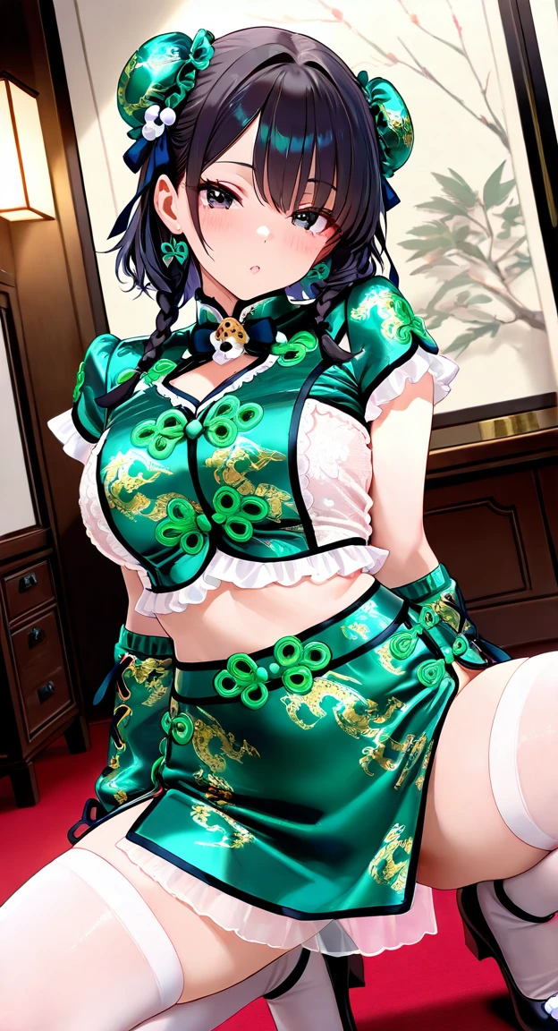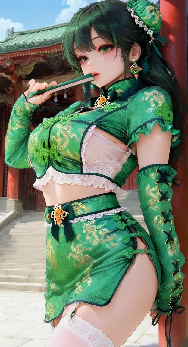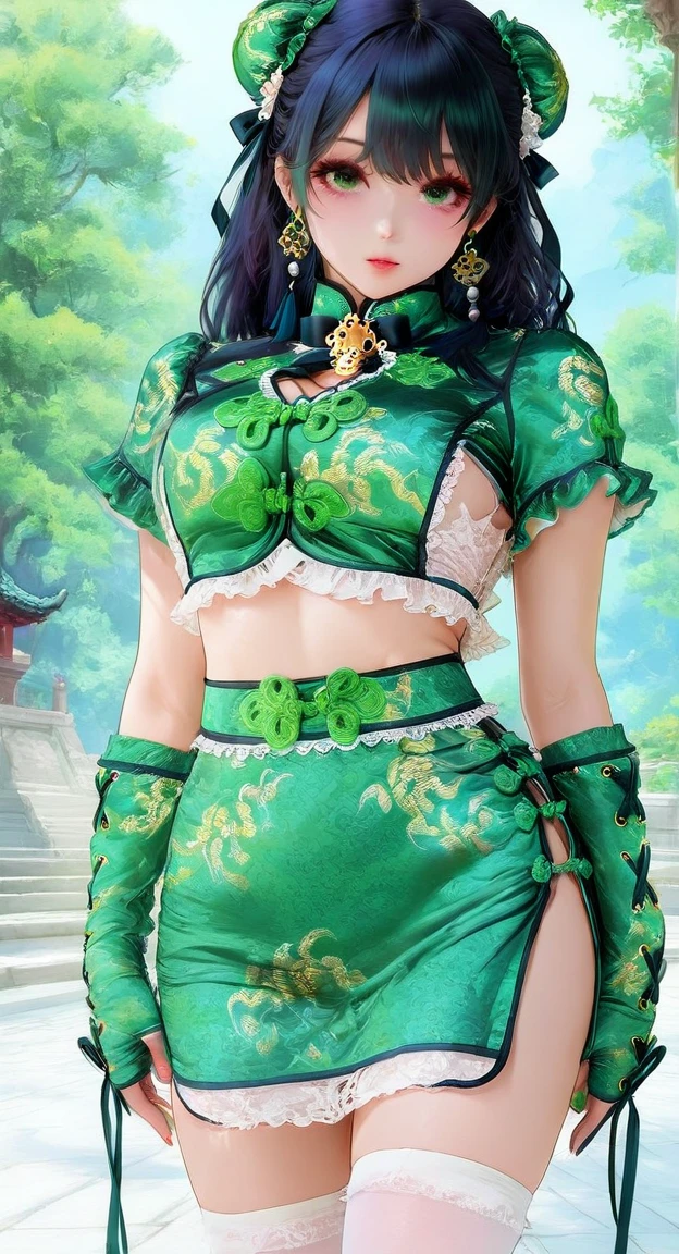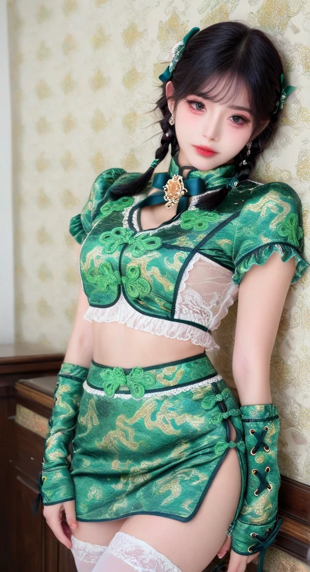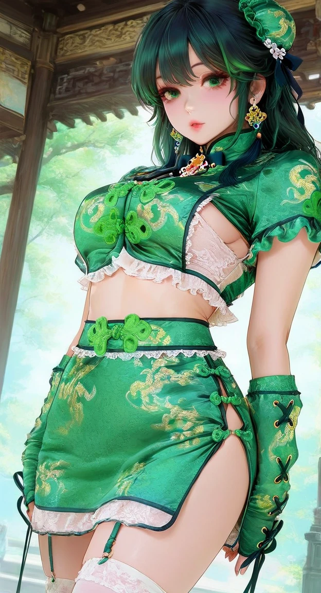 xg1,shiny green satin crop top qipao with gold dragon patterns, deep chest cutout with white lace bralette underneath, matching high-slit mini skirt with side ties exposing thighs, long green satin arm sleeves with ribbons, white thigh-high lace stockings, black choker with gold mahjong pendant