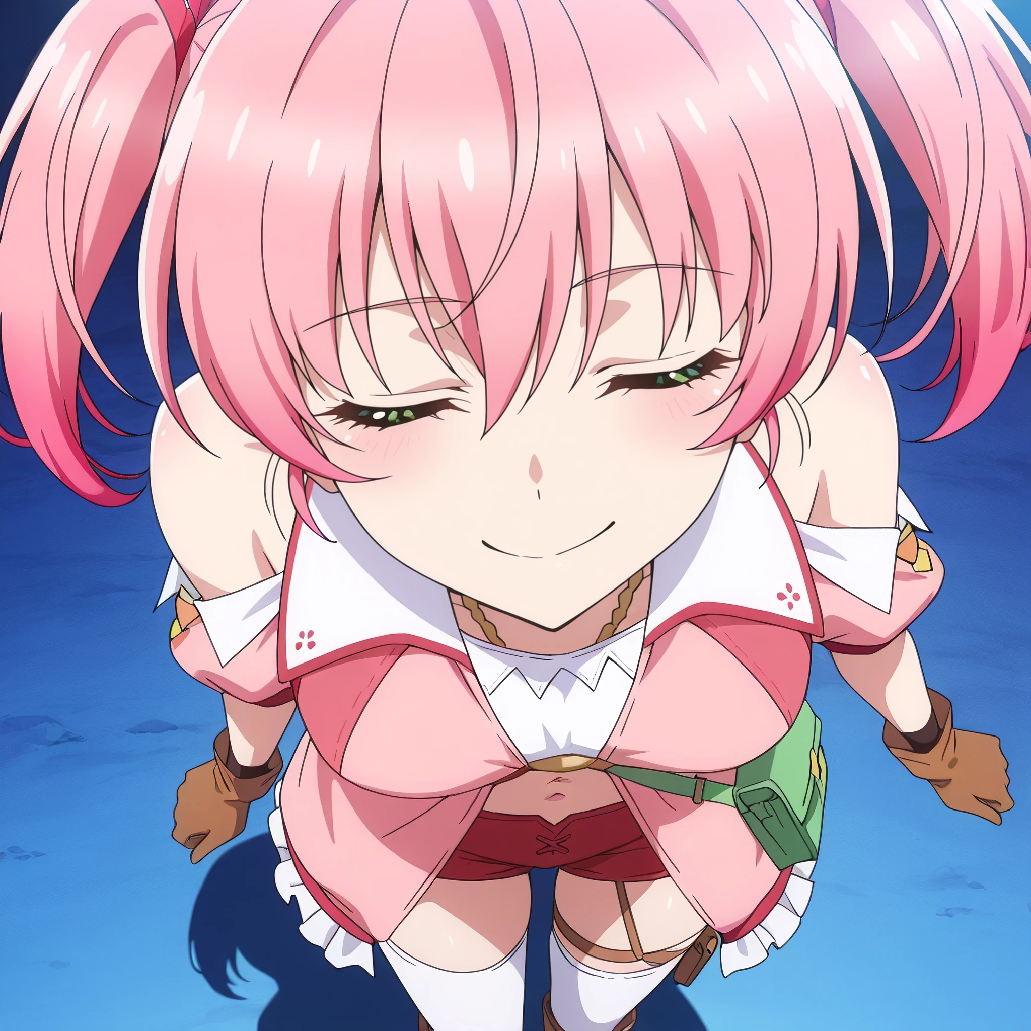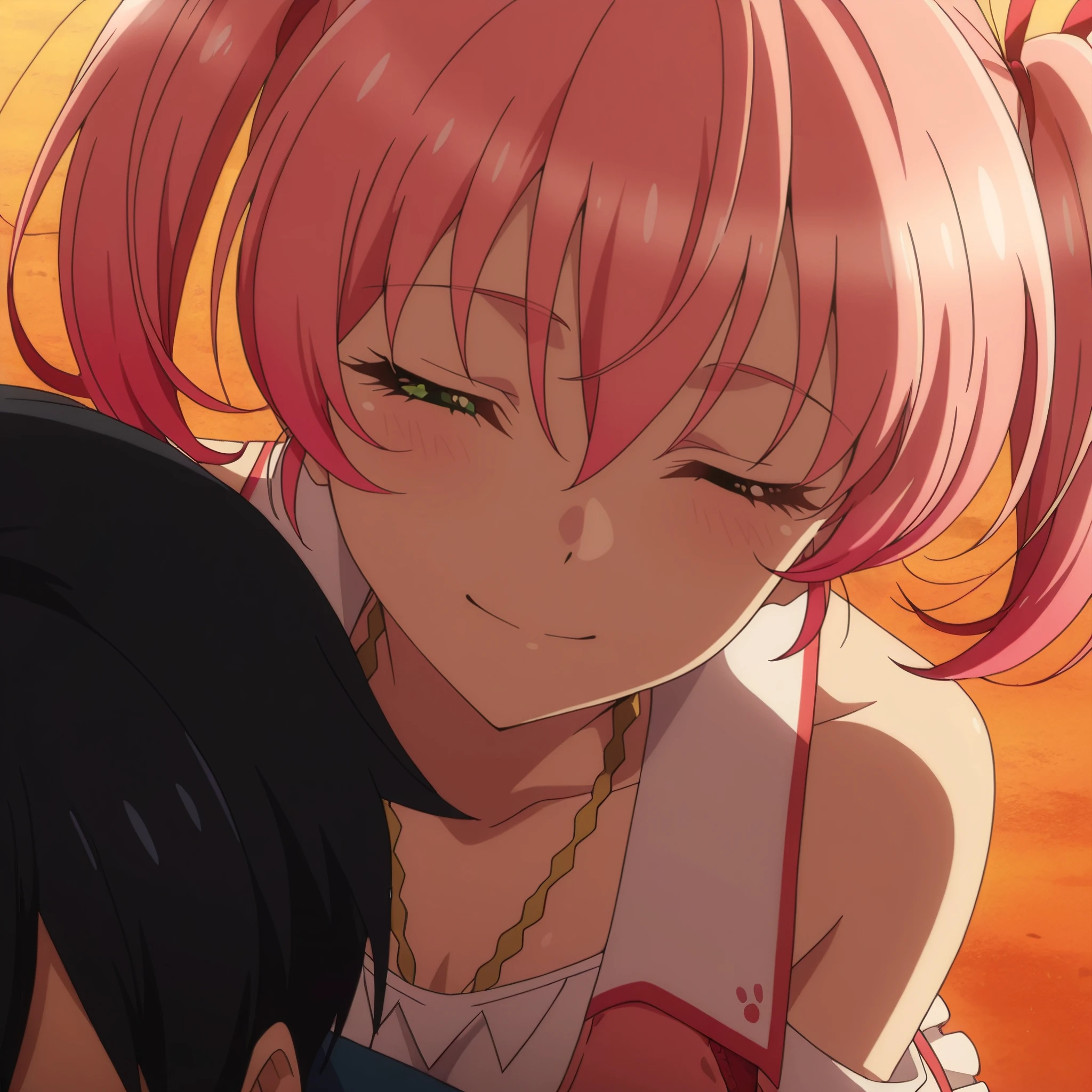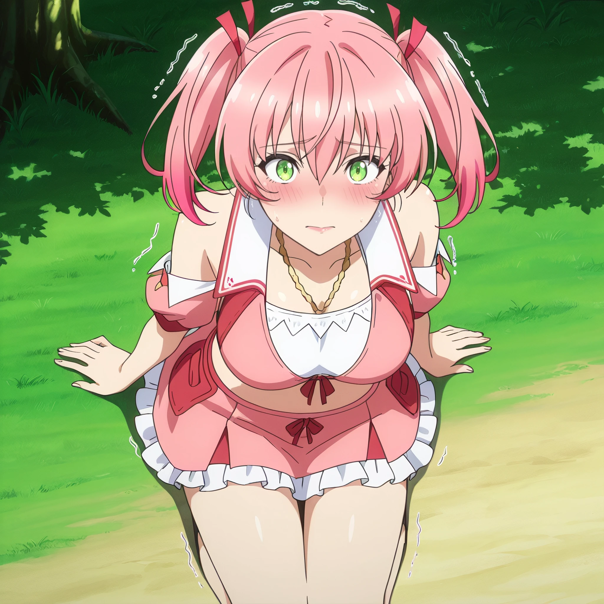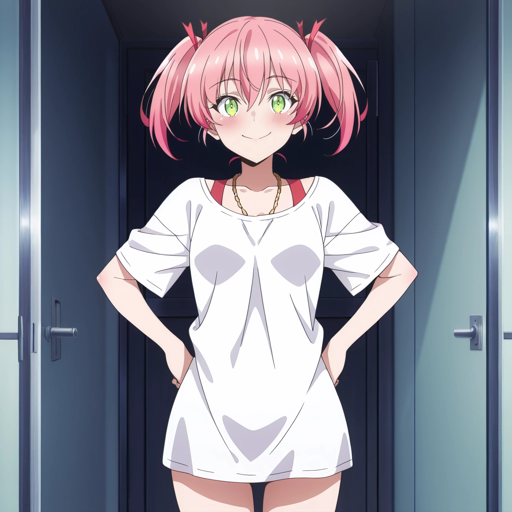 SRAYui, pink hair, short hair, short twintails, green eyes, hair ribbon, red ribbon, jewelry, necklace, hair between eyes,