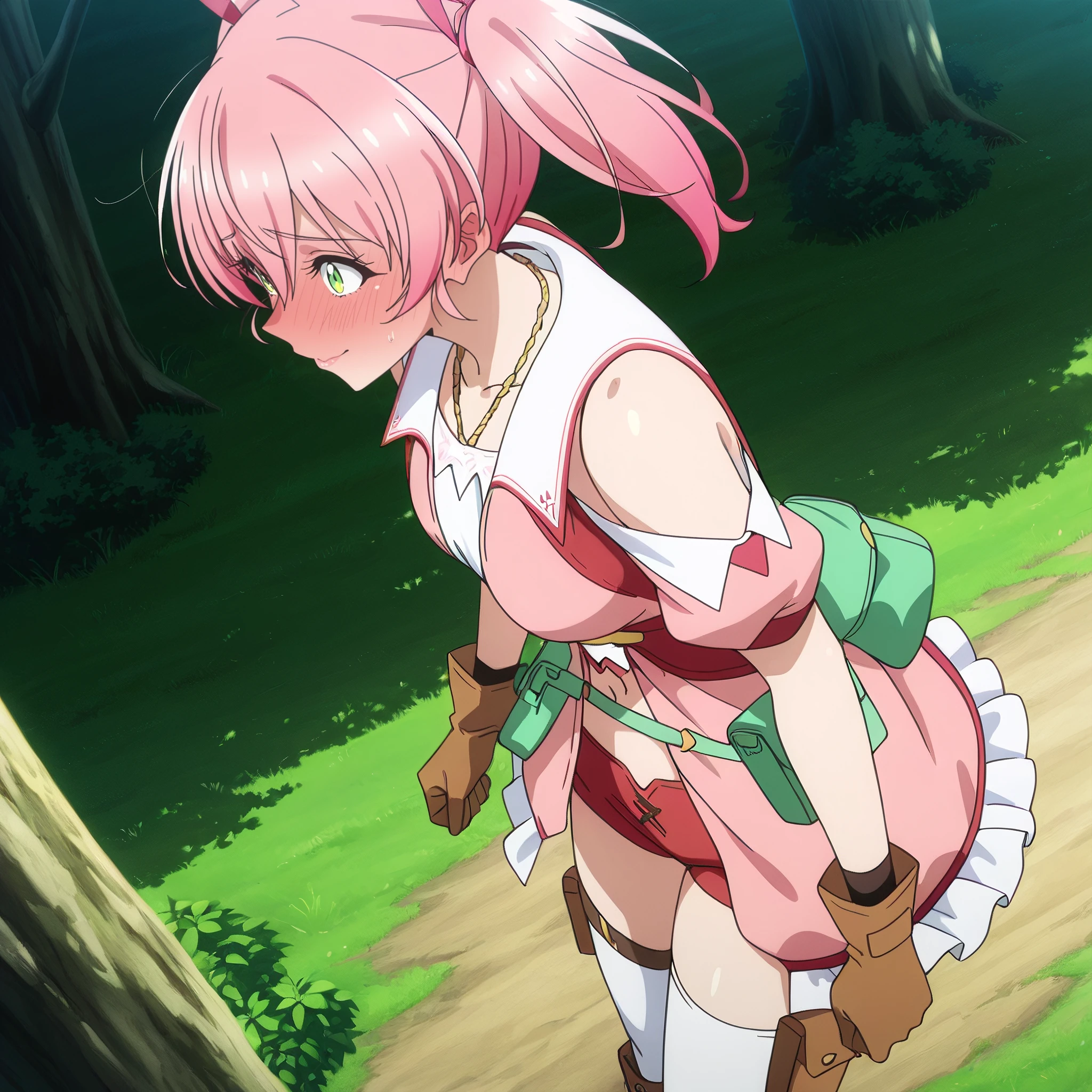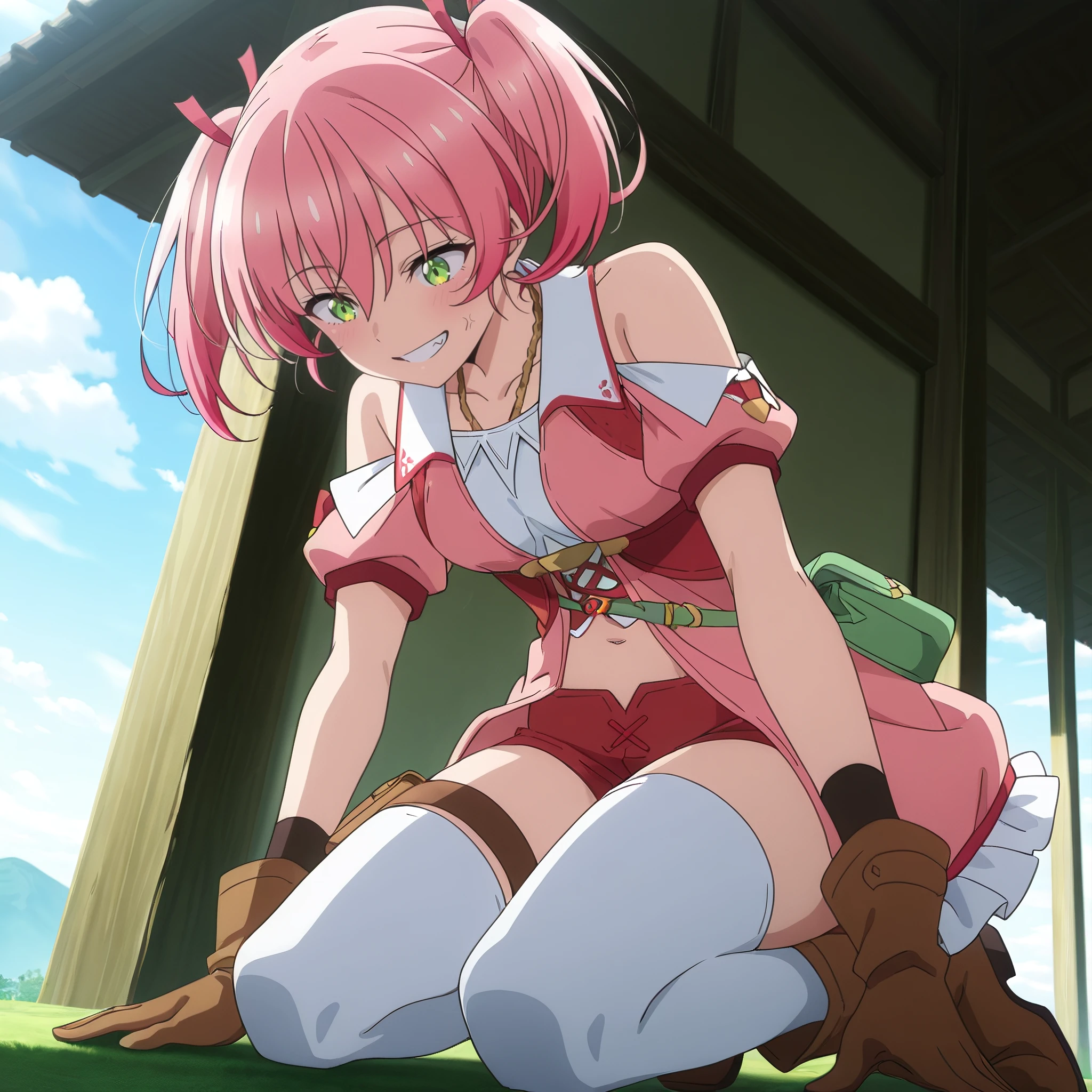 pink dress, frills, ???? shoulders, short puffy sleeves, brown gloves, collarbone, white thighhighs, red shorts, short shorts, brown boots, green bag, shoulder cutout, navel, thigh strap, brown pouch,