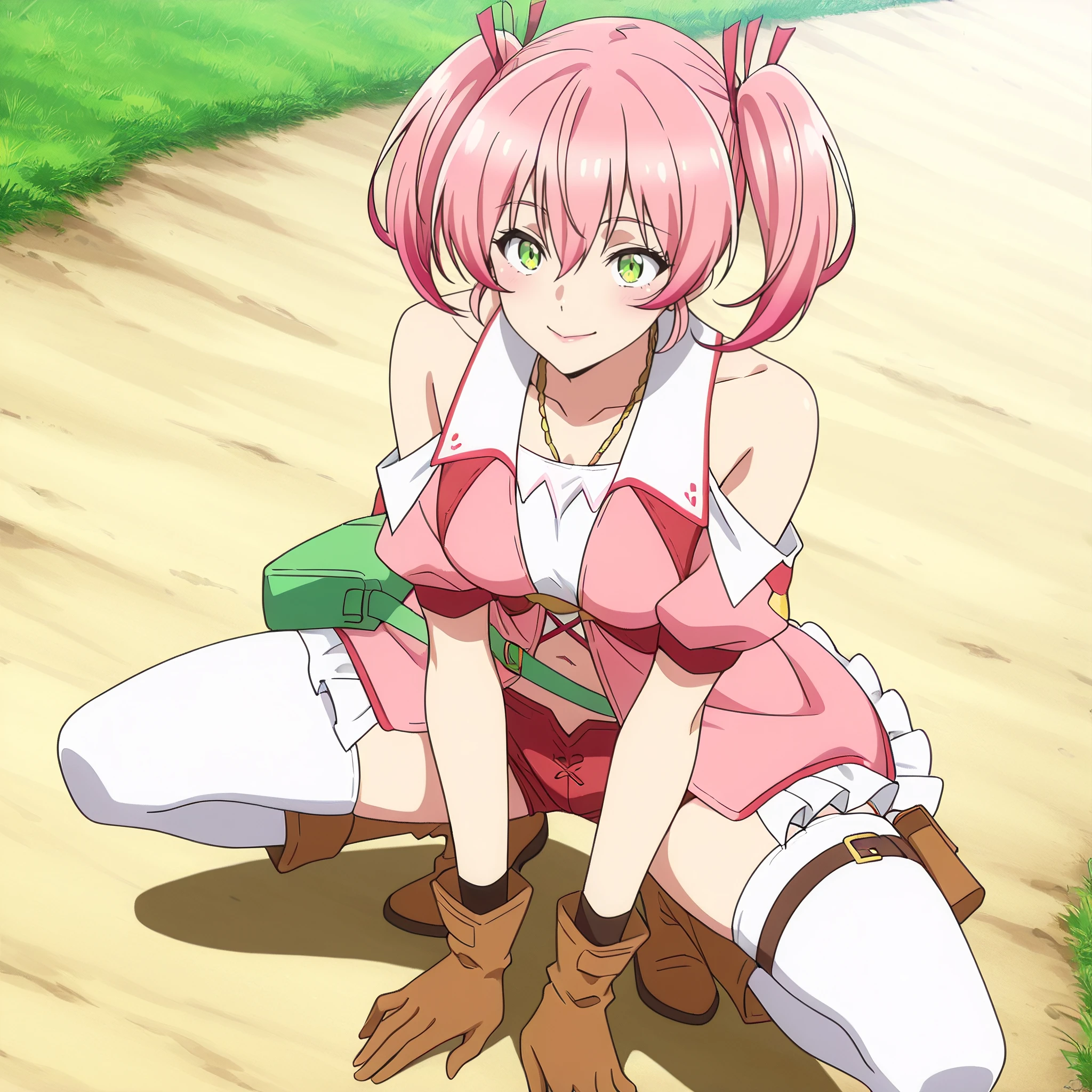 pink dress, frills, bare shoulders, short puffy sleeves, brown gloves, collarbone, white thighhighs, red shorts, short shorts, brown boots, green bag, shoulder cutout, navel, thigh strap, brown pouch,