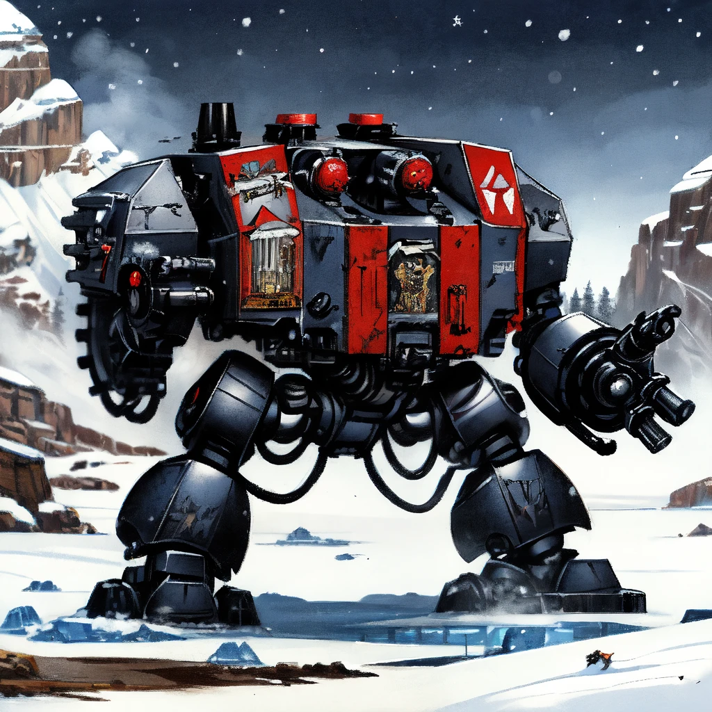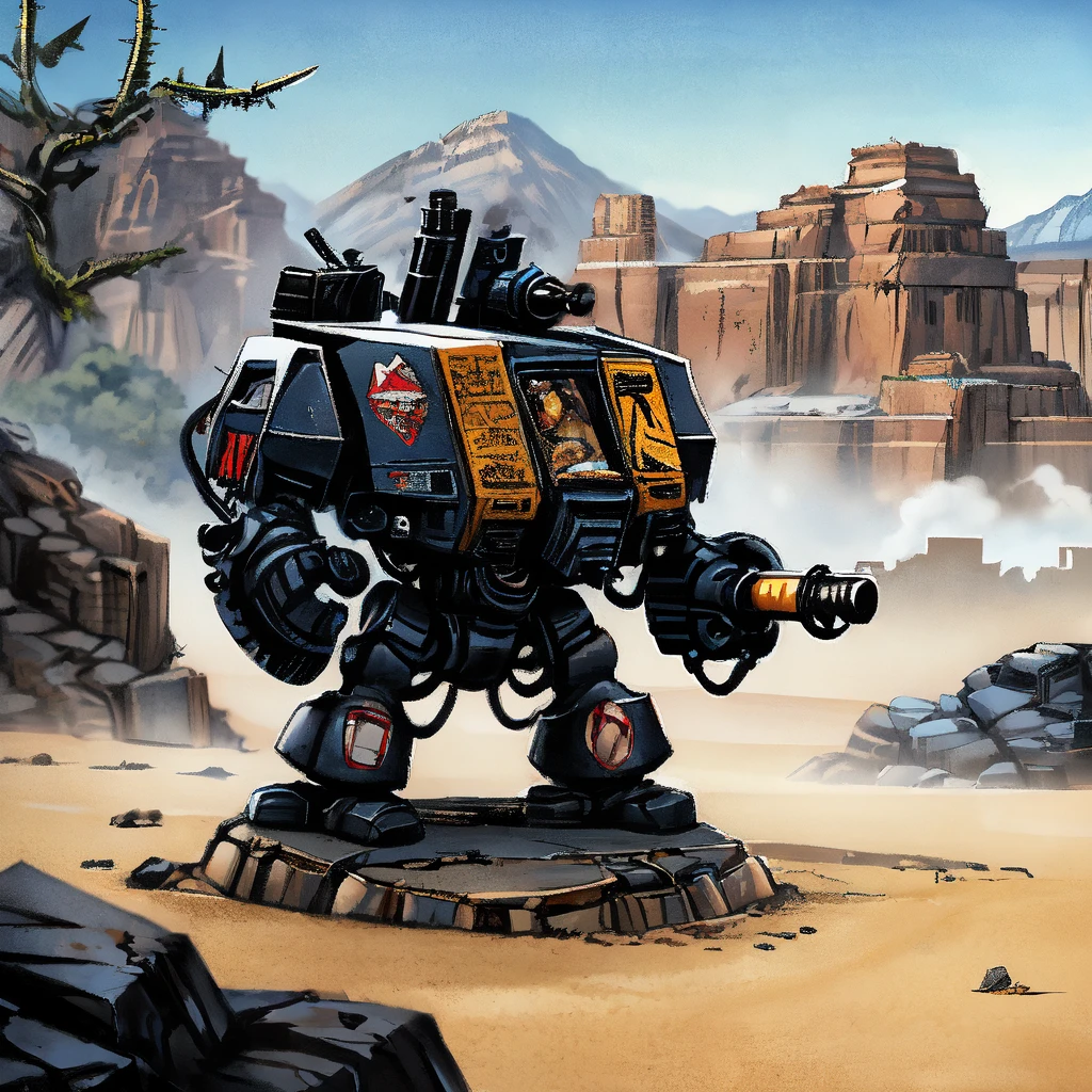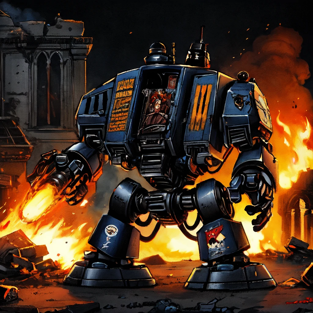 A Space Marine Dreadnought is a large, walking tank which carries both powerful guns and lethal close combat weaponry, armoured to withstand all but the most powerful of enemy firepower and often relied on by Space Marine forces to tear an opening in enemy defenses. Each Dreadnought contains a living being, permanently interfaced with the machine through a form of Mind Impulse Unit. Dreadnoughts are surprisingly agile, able to walk and balance with the ease of a living creature. It is said that old proto-Dreadnoughts of the Unification wars could be piloted by non-Adeptus Astartes warriors, but later only Space Marines could be interred in them.