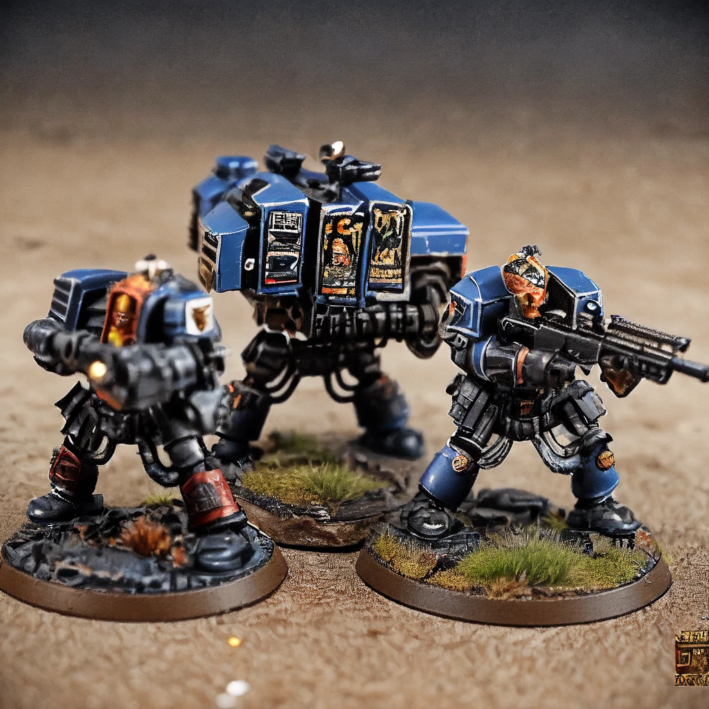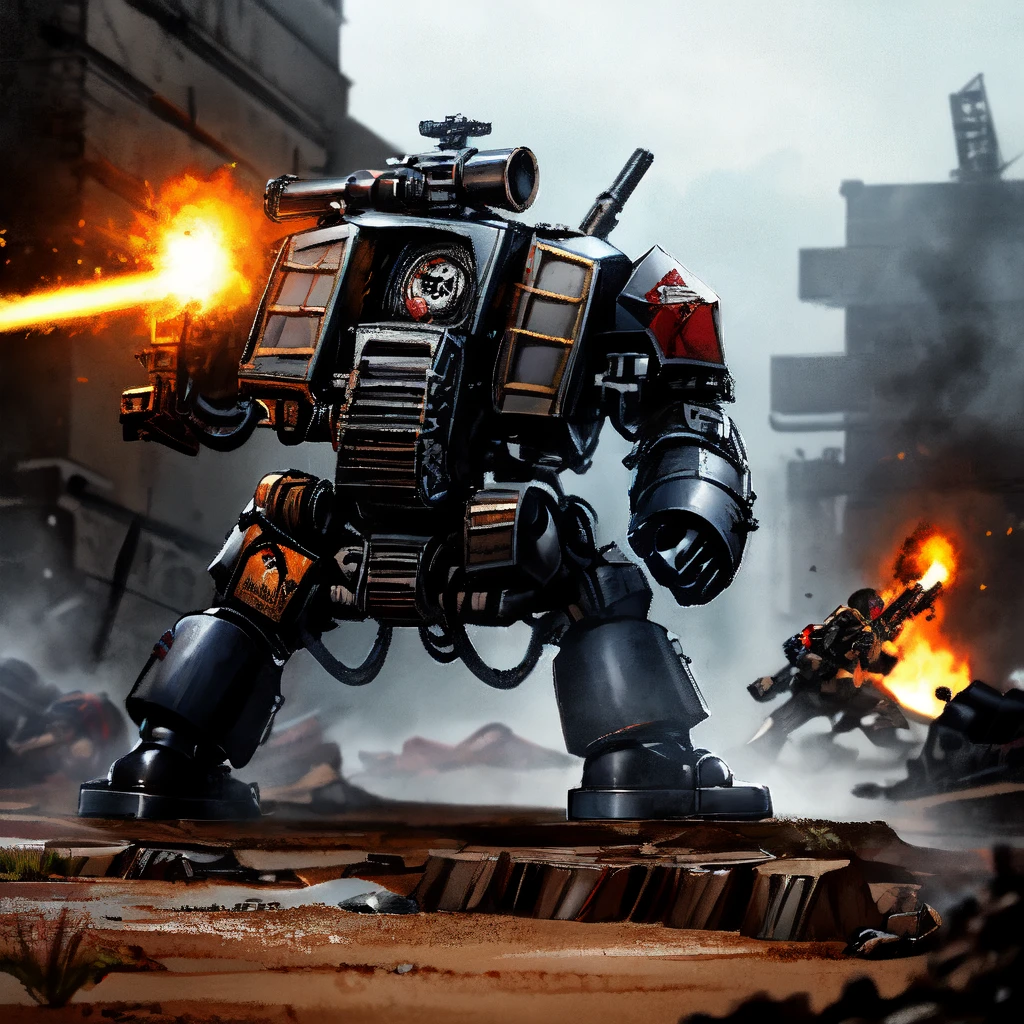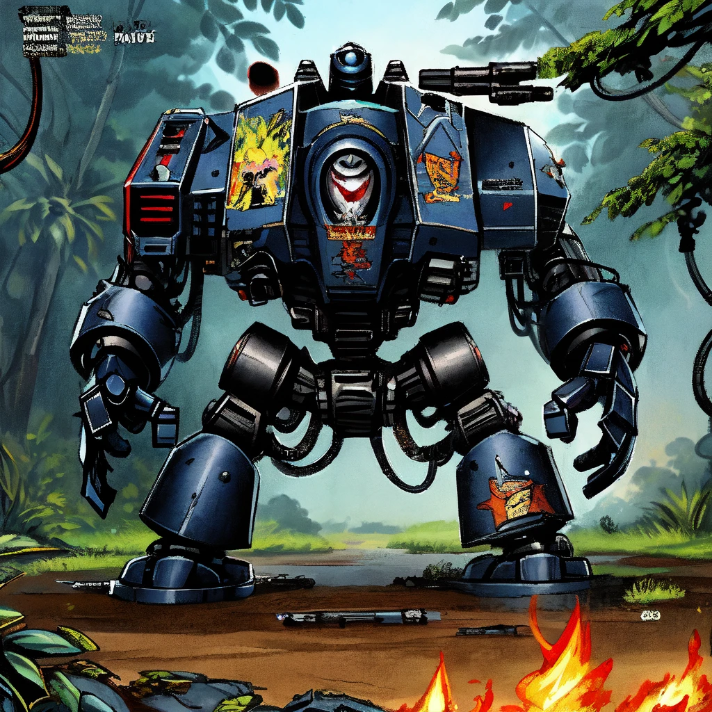 A Space Marine Dreadnought is a large, walking tank which carries both powerful guns and lethal close combat weaponry, armoured to withstand all but the most powerful of enemy firepower and often relied on by Space Marine forces to tear an opening in enemy defenses. Each Dreadnought contains a living being, permanently interfaced with the machine through a form of Mind Impulse Unit. Dreadnoughts are surprisingly agile, able to walk and balance with the ease of a living creature. It is said that old proto-Dreadnoughts of the Unification wars could be piloted by non-Adeptus Astartes warriors, but later only Space Marines could be interred in them.