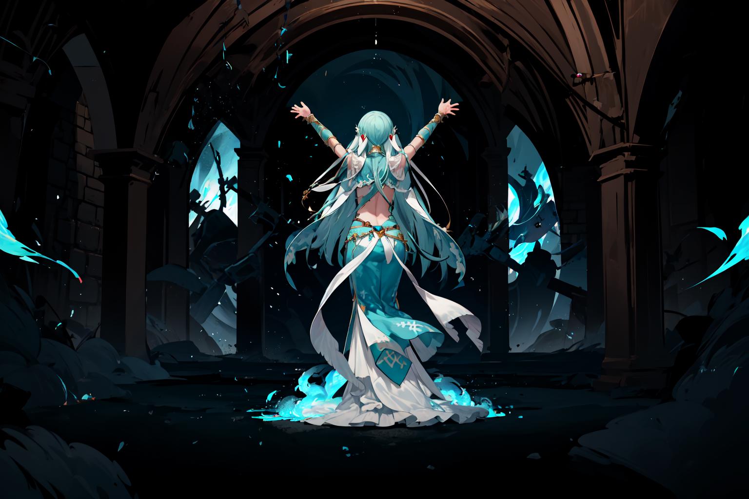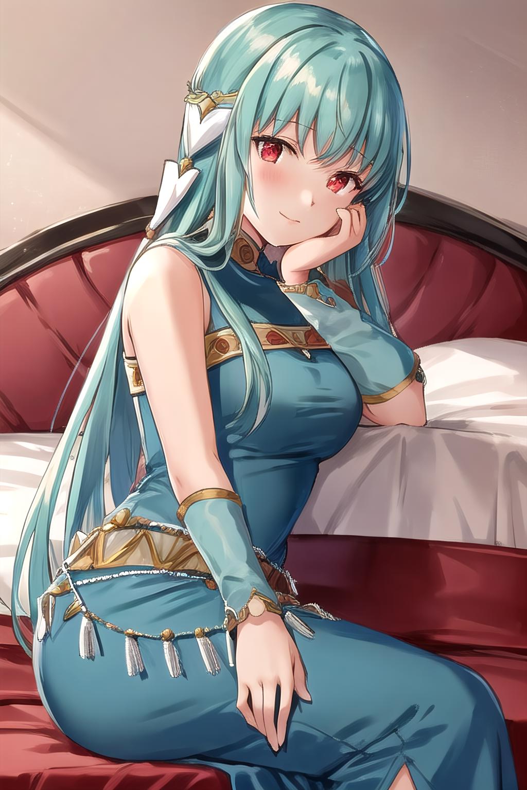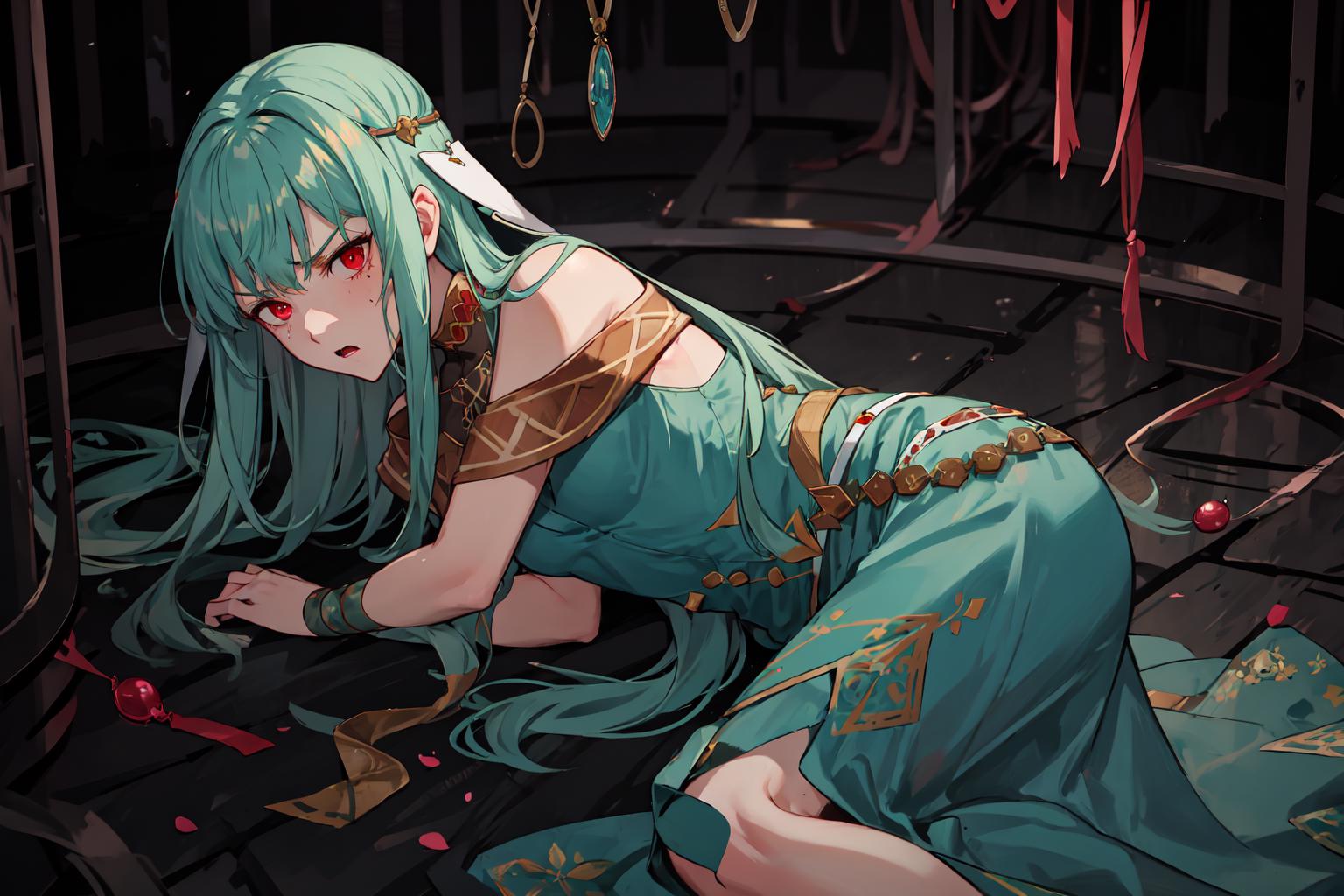 Around 0.8 weight works well. Trigger word is 'ninian fe'. 'red eyes' is a must, and for her base outfit add 'long dress', 'jewelry', and 'dancer'.