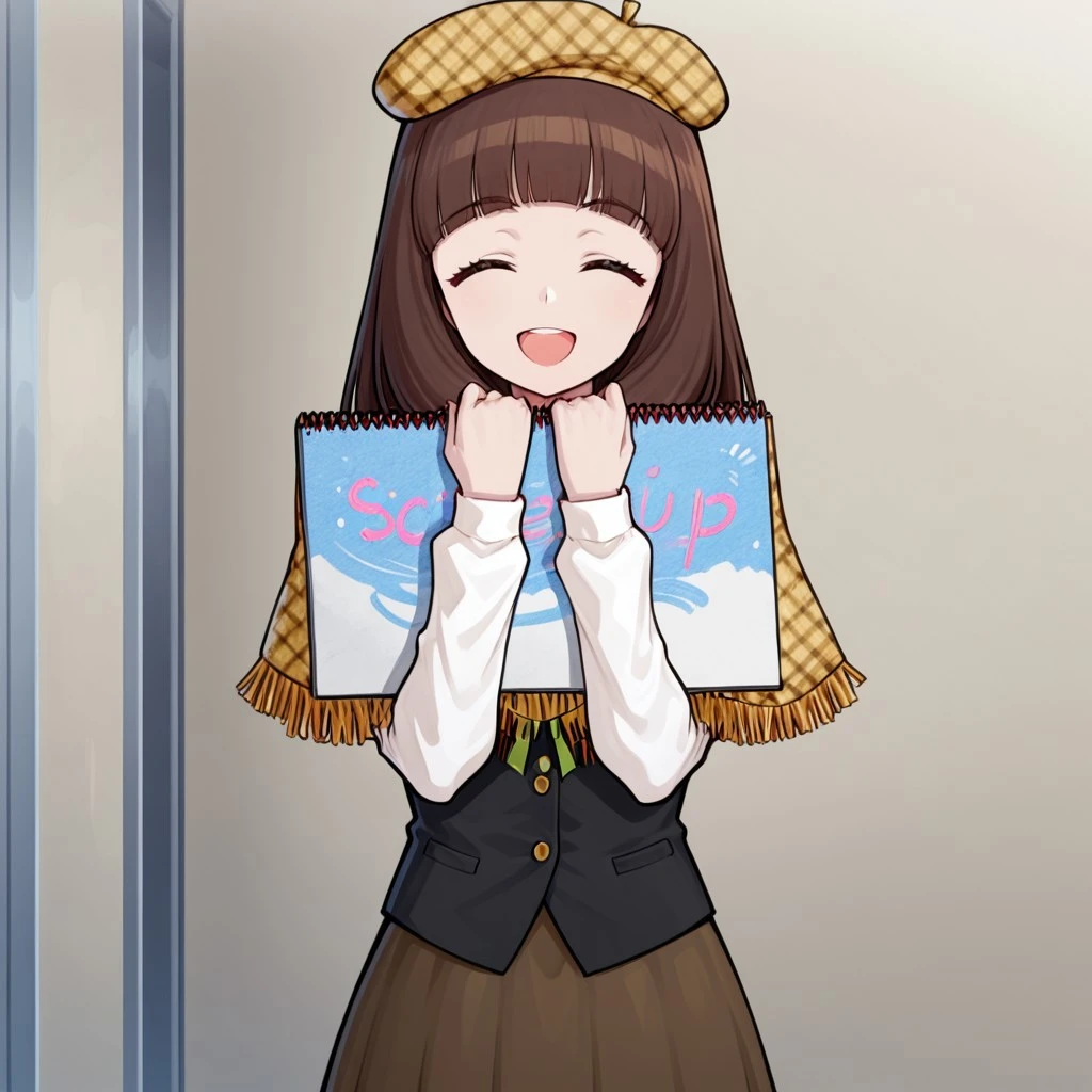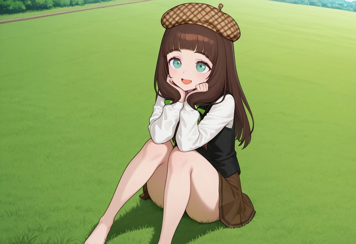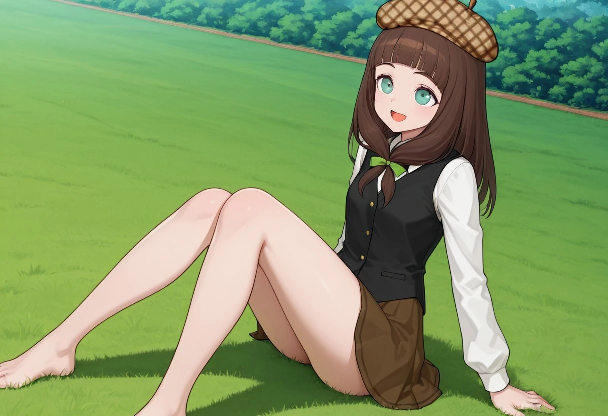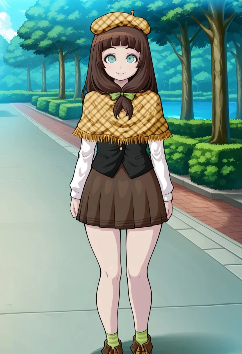 beret, diamond pattern beret, yellow beret, duster, yellow duster, diamond pattern duster, vest, black vest, white sleeves, skirt, brown skirt, bare thighs, short socks, stiped socks, green socks, yellow socks, brown shoes,