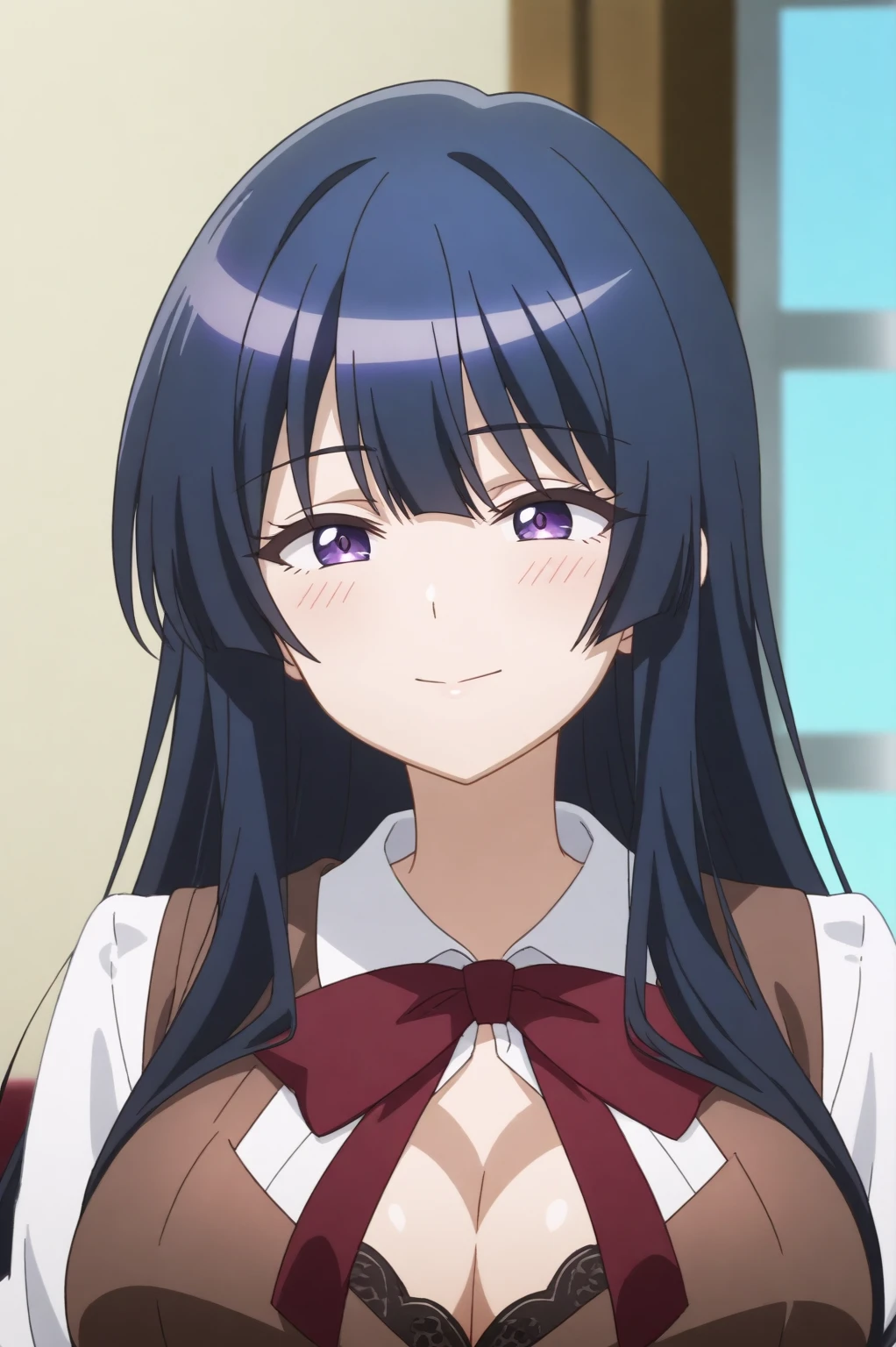 Triggers : thea,long hair, breasts,cleavage,bangs,very long hair,long sleeves,school uniform,shirt (all clothes from the anime work too)