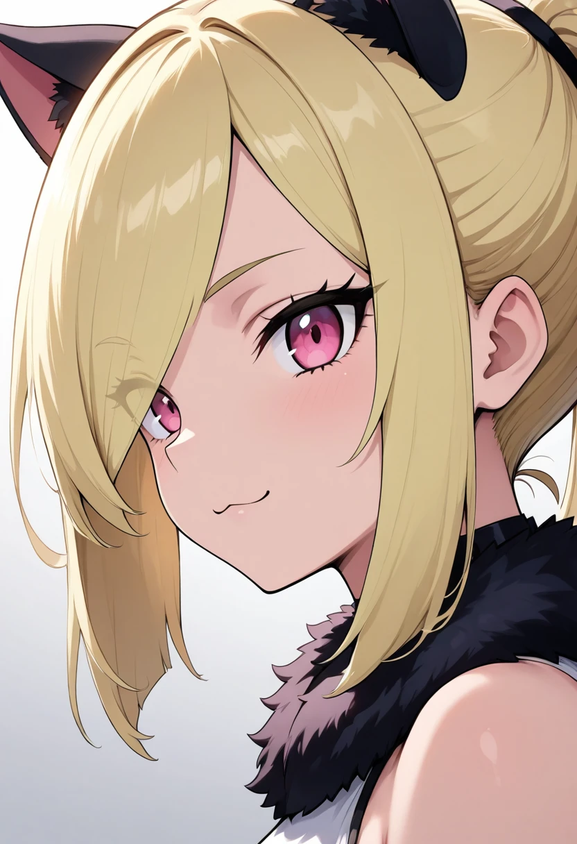 LNk0C1tr0n, pink eyes, blonde hair, long hair, blunt bangs, hair over one eye, cat ears,