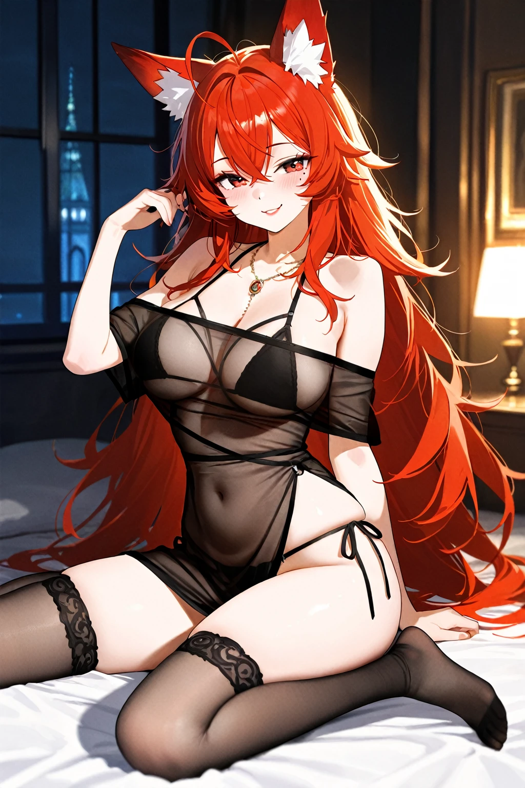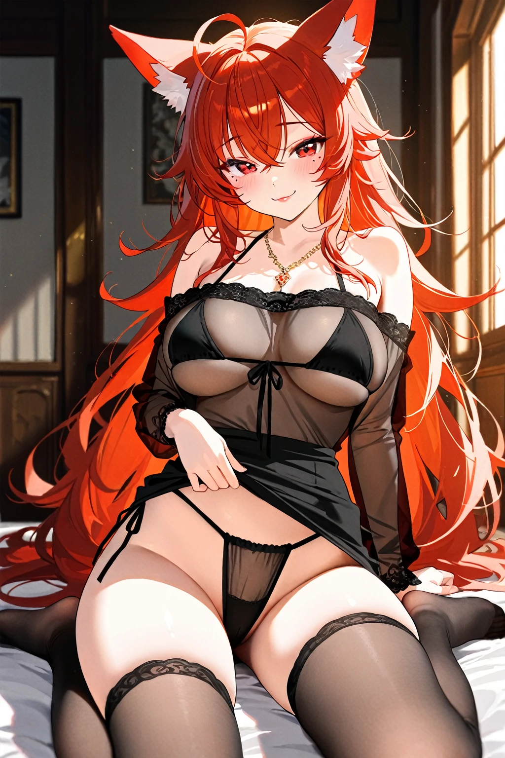 thighhighs,black top,underwear,no shoes,black panties,feet,bare shoulders,dress,necklace,see-through,side-tie panties,skindentation,