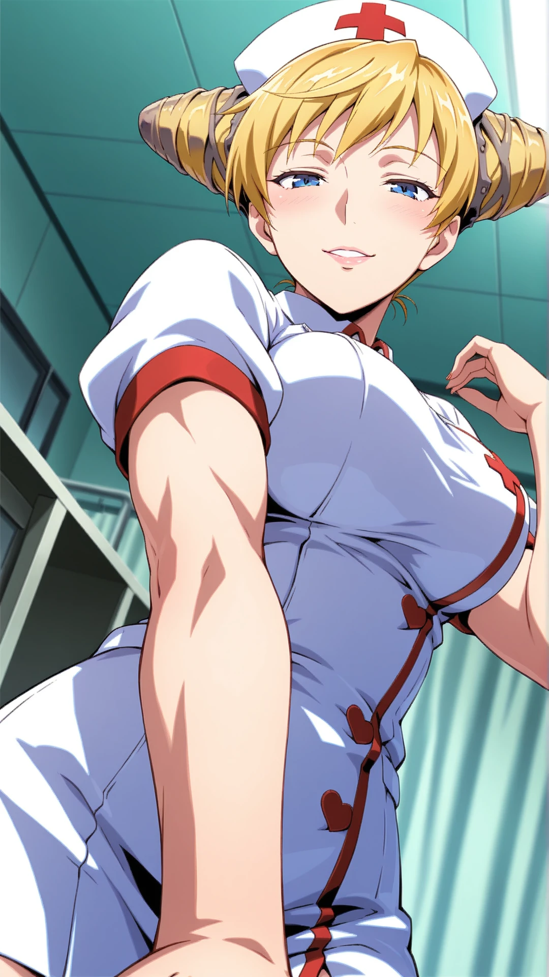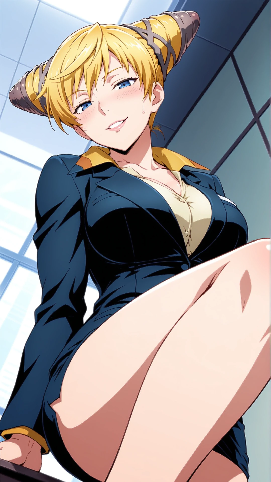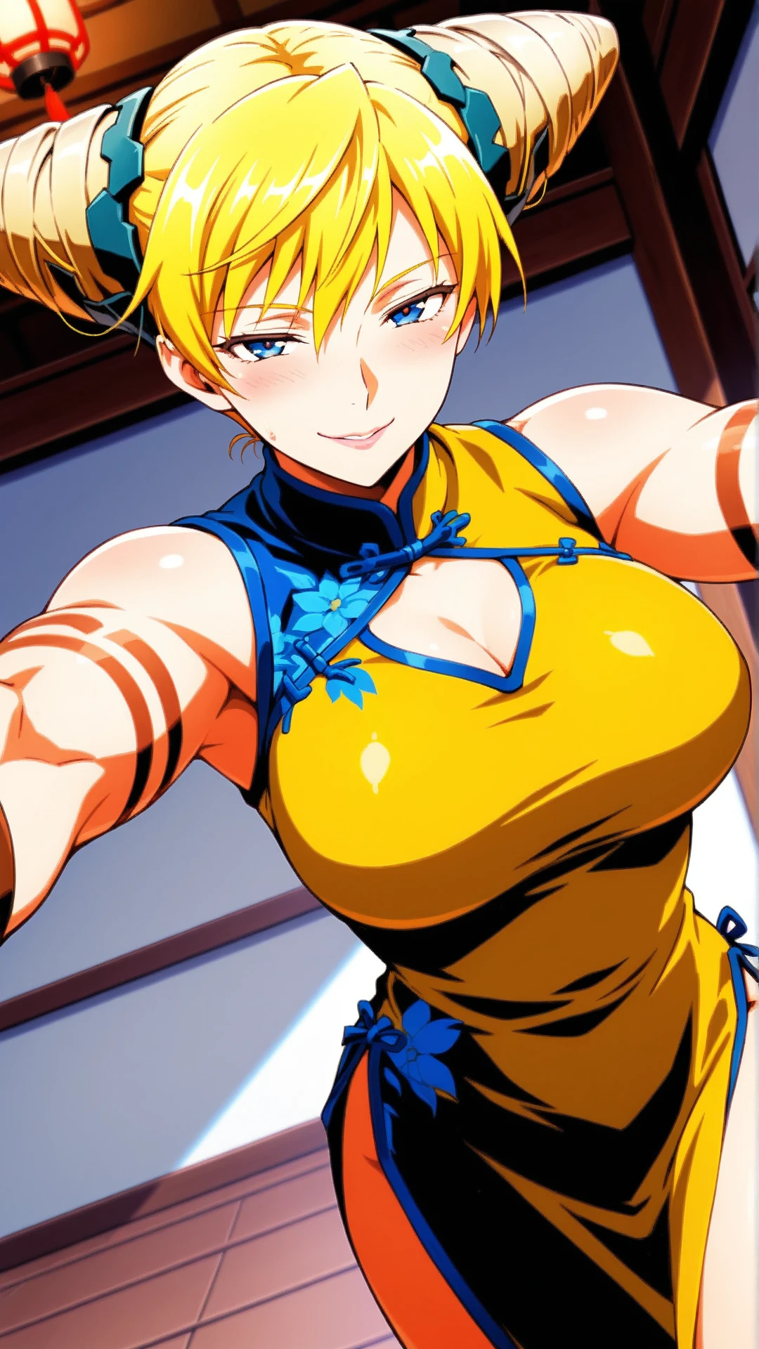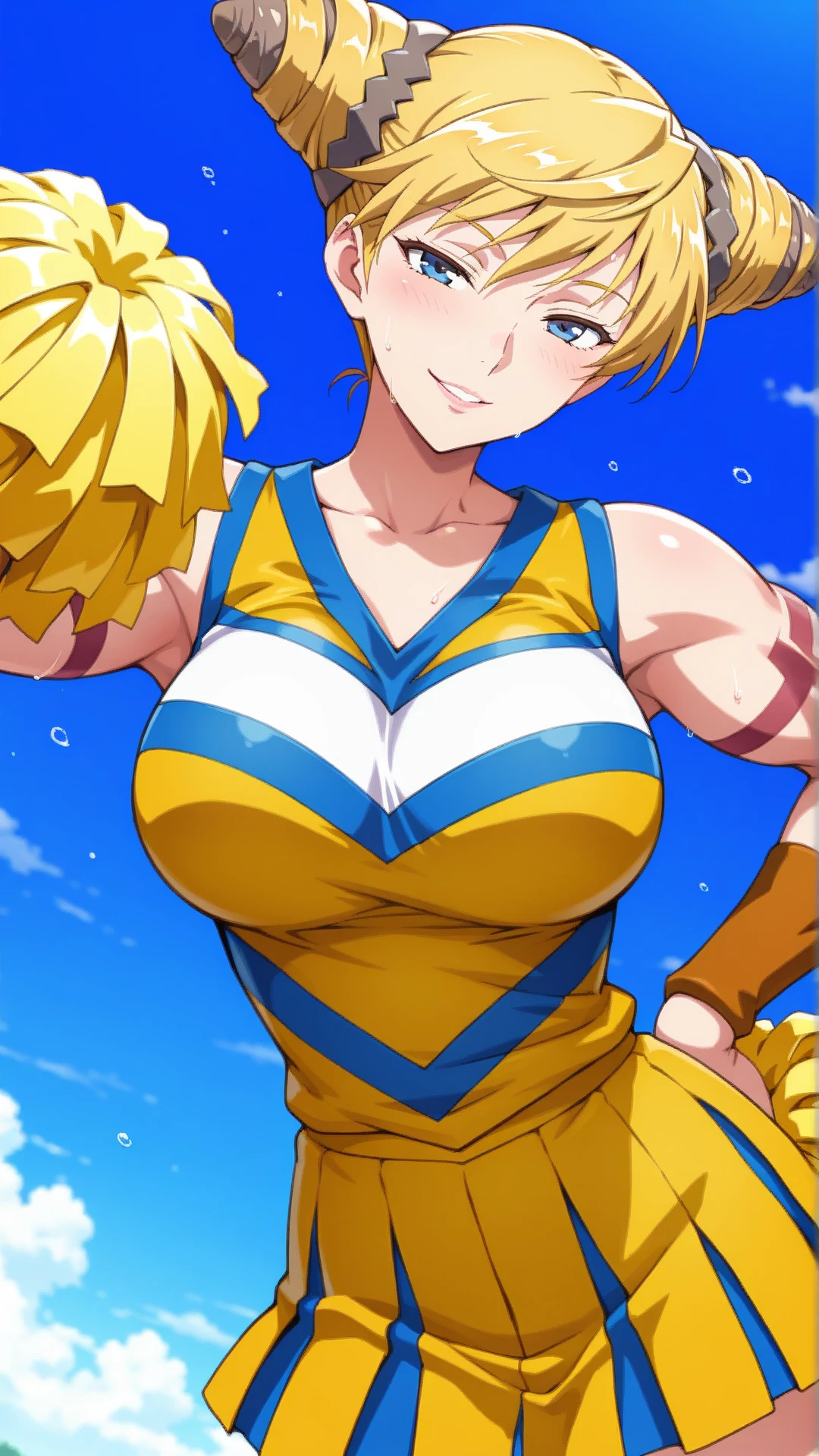 Appearance:mature female,muscular,blonde hair,blue eyes ,cone hair bun,
