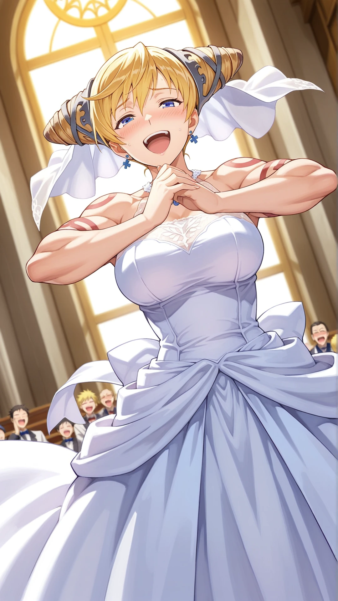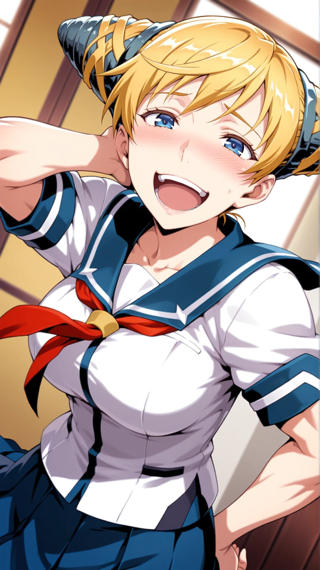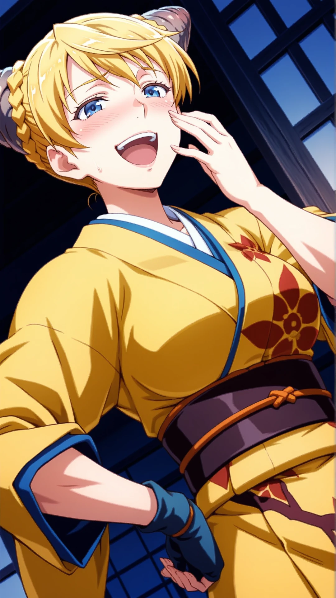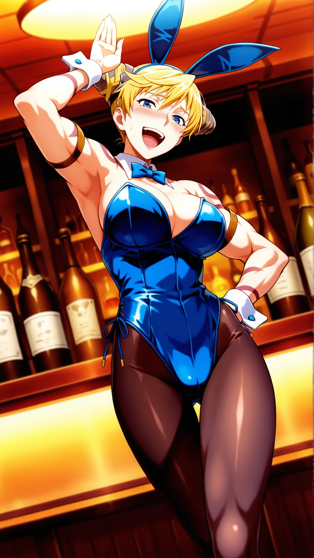 Appearance:mature female,muscular,blonde hair,blue eyes ,cone hair bun,