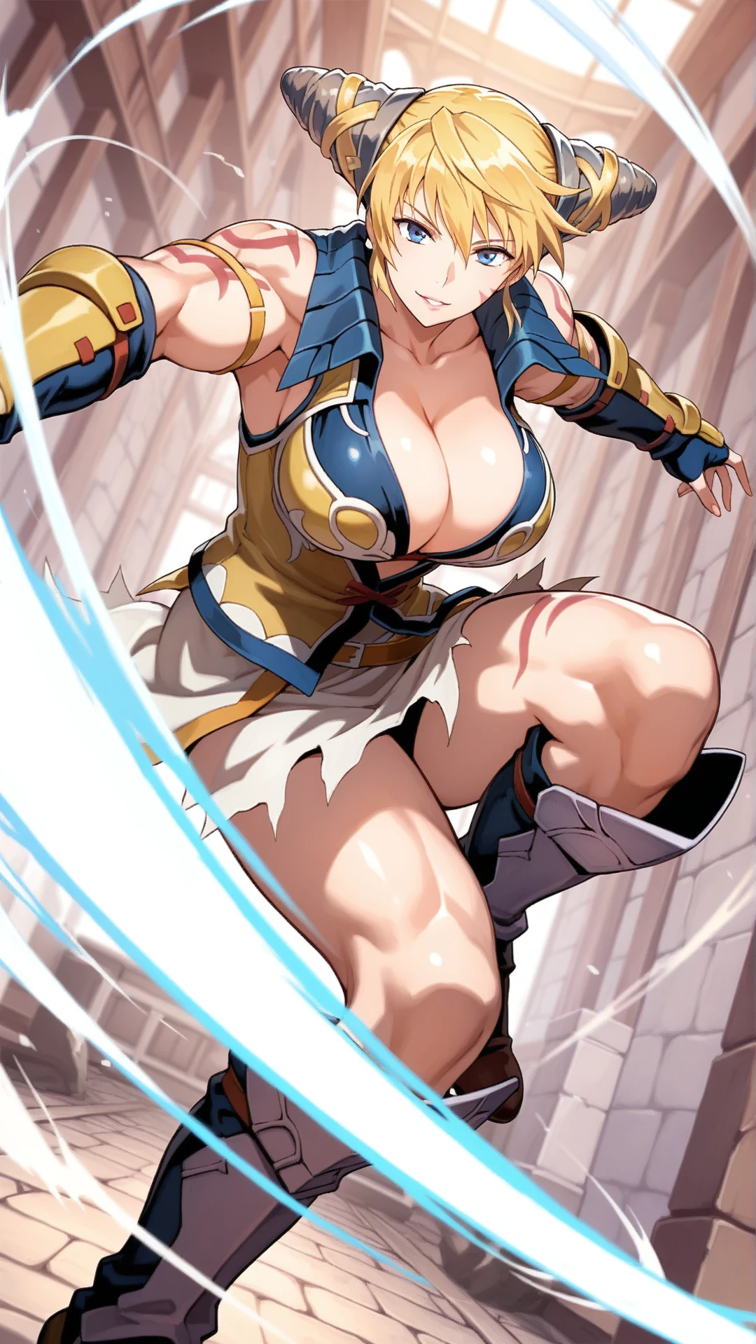 sif\(minstrel saga\),mature female,muscular,blonde hair,blue eyes ,cone hair bun,