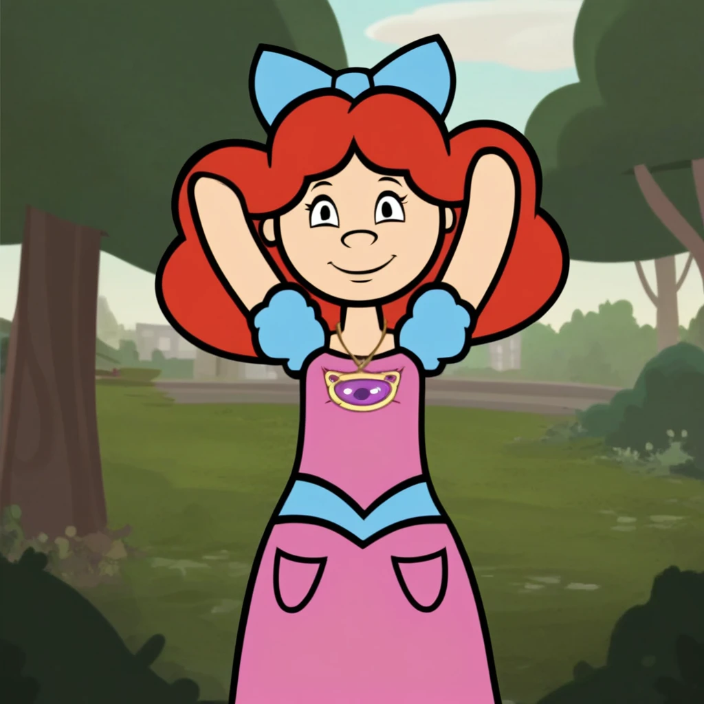 eileen_wg, red hair, long hair, hairbow, dress, necklace