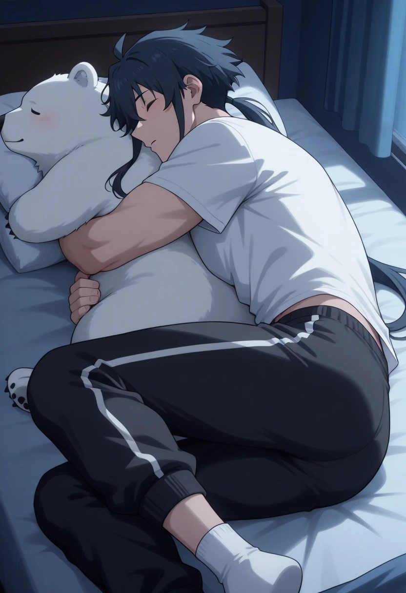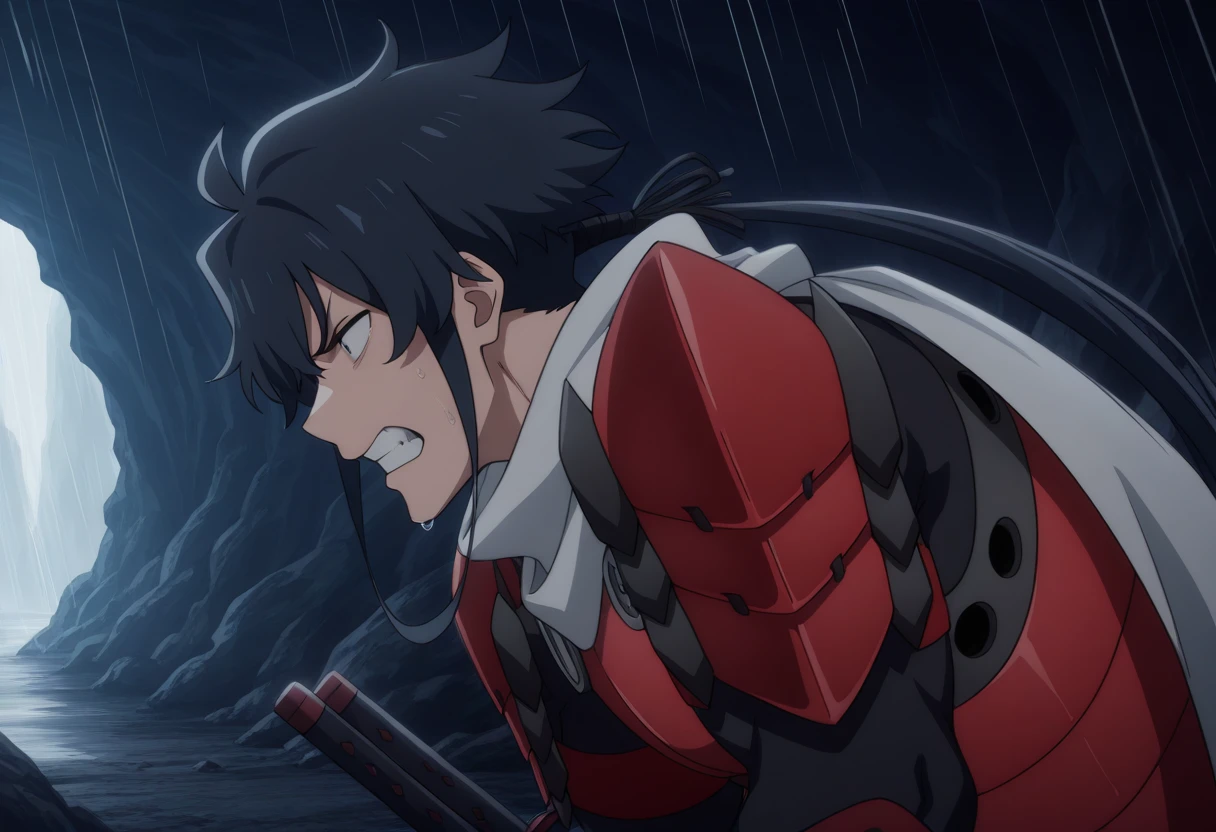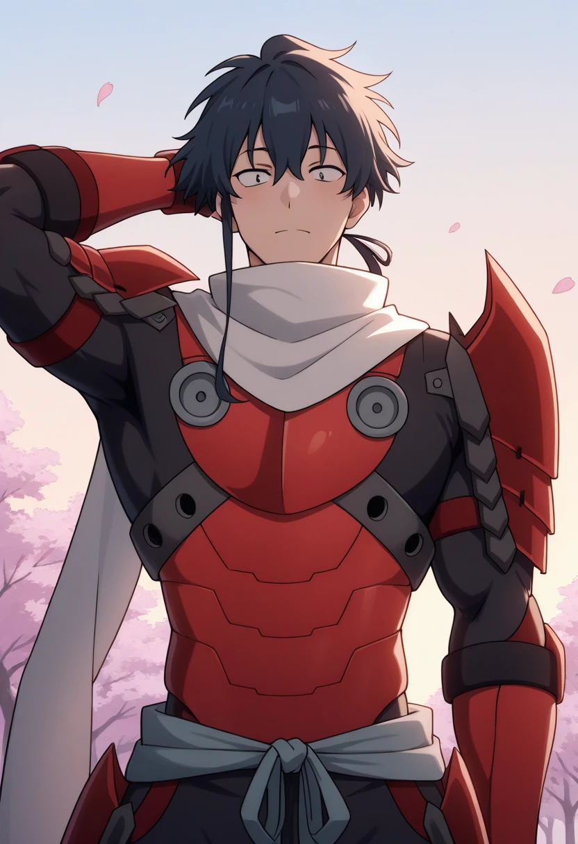 koga_t, 1boy, white scarf, armor, sidelocks, ponytail
