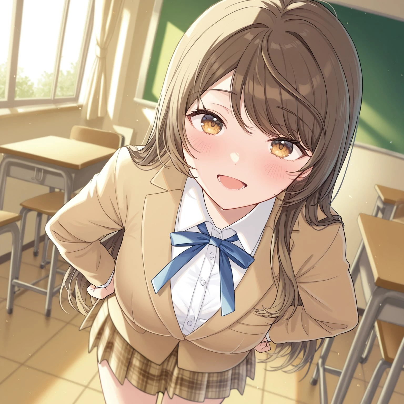 outfit: harusch, school uniform, jacket, shoes, pleated skirt, skirt, shirt, collared shirt, long sleeves, kneehighs, neck ribbon, white shirt, blue neck ribbon, brown skirt, brown jacket, school bag
